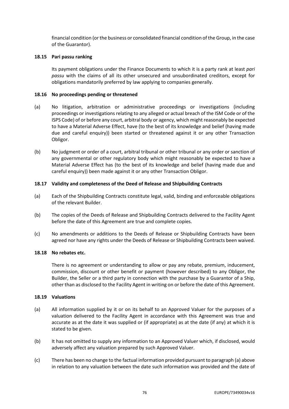 76 EUROPE/73490034v16 financial condition (or the business or consolidated financial condition of the Group, in the case of the Guarantor). 18.15 Pari passu ranking Its payment obligations under the Finance Documents to which it is a party rank at least pari passu with the claims of all its other unsecured and unsubordinated creditors, except for obligations mandatorily preferred by law applying to companies generally. 18.16 No proceedings pending or threatened (a) No litigation, arbitration or administrative proceedings or investigations (including proceedings or investigations relating to any alleged or actual breach of the ISM Code or of the ISPS Code) of or before any court, arbitral body or agency, which might reasonably be expected to have a Material Adverse Effect, have (to the best of its knowledge and belief (having made due and careful enquiry)) been started or threatened against it or any other Transaction Obligor. (b) No judgment or order of a court, arbitral tribunal or other tribunal or any order or sanction of any governmental or other regulatory body which might reasonably be expected to have a Material Adverse Effect has (to the best of its knowledge and belief (having made due and careful enquiry)) been made against it or any other Transaction Obligor. 18.17 Validity and completeness of the Deed of Release and Shipbuilding Contracts (a) Each of the Shipbuilding Contracts constitute legal, valid, binding and enforceable obligations of the relevant Builder. (b) The copies of the Deeds of Release and Shipbuilding Contracts delivered to the Facility Agent before the date of this Agreement are true and complete copies. (c) No amendments or additions to the Deeds of Release or Shipbuilding Contracts have been agreed nor have any rights under the Deeds of Release or Shipbuilding Contracts been waived. 18.18 No rebates etc. There is no agreement or understanding to allow or pay any rebate, premium, inducement, commission, discount or other benefit or payment (however described) to any Obligor, the Builder, the Seller or a third party in connection with the purchase by a Guarantor of a Ship, other than as disclosed to the Facility Agent in writing on or before the date of this Agreement. 18.19 Valuations (a) All information supplied by it or on its behalf to an Approved Valuer for the purposes of a valuation delivered to the Facility Agent in accordance with this Agreement was true and accurate as at the date it was supplied or (if appropriate) as at the date (if any) at which it is stated to be given. (b) It has not omitted to supply any information to an Approved Valuer which, if disclosed, would adversely affect any valuation prepared by such Approved Valuer. (c) There has been no change to the factual information provided pursuant to paragraph (a) above in relation to any valuation between the date such information was provided and the date of
