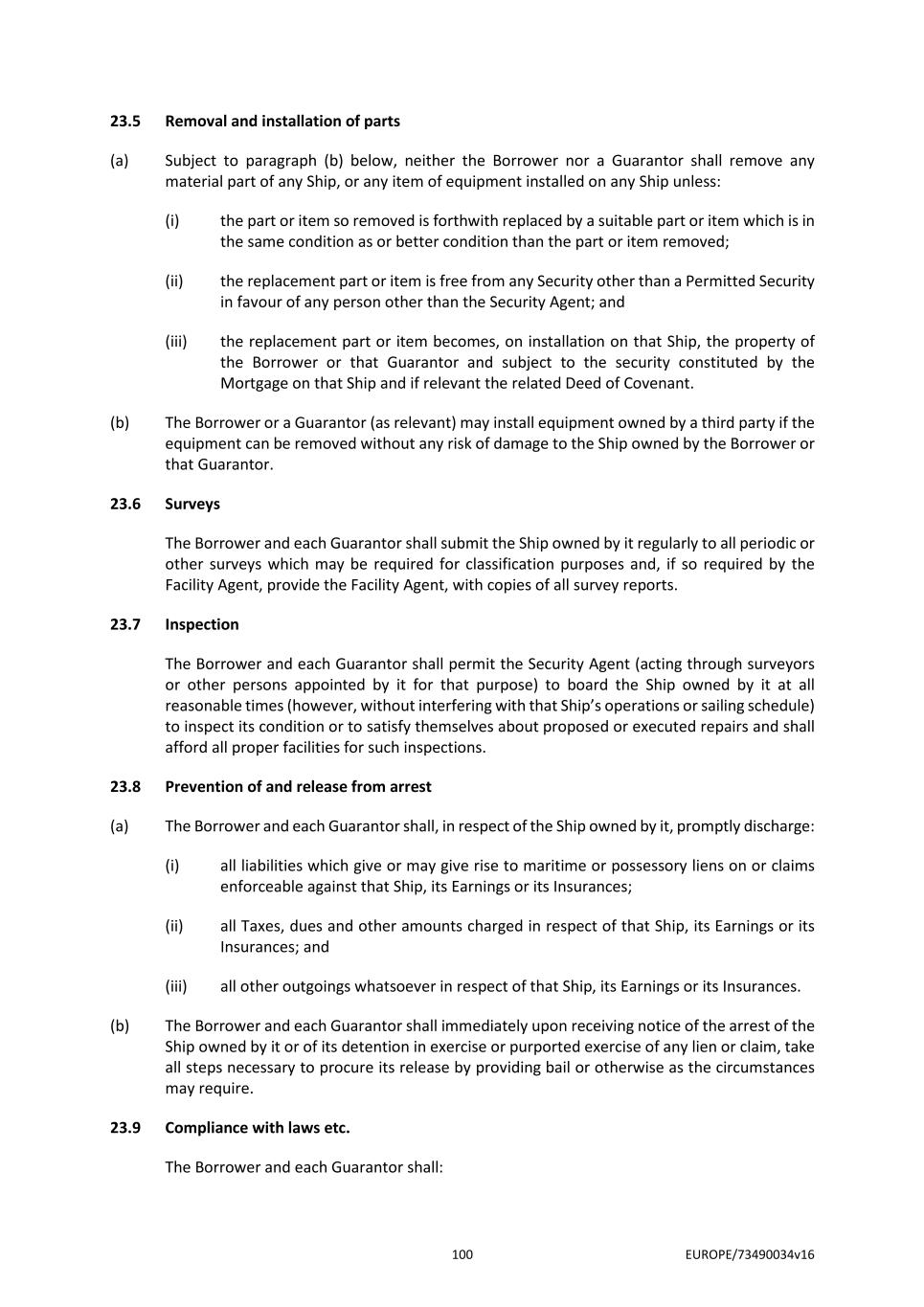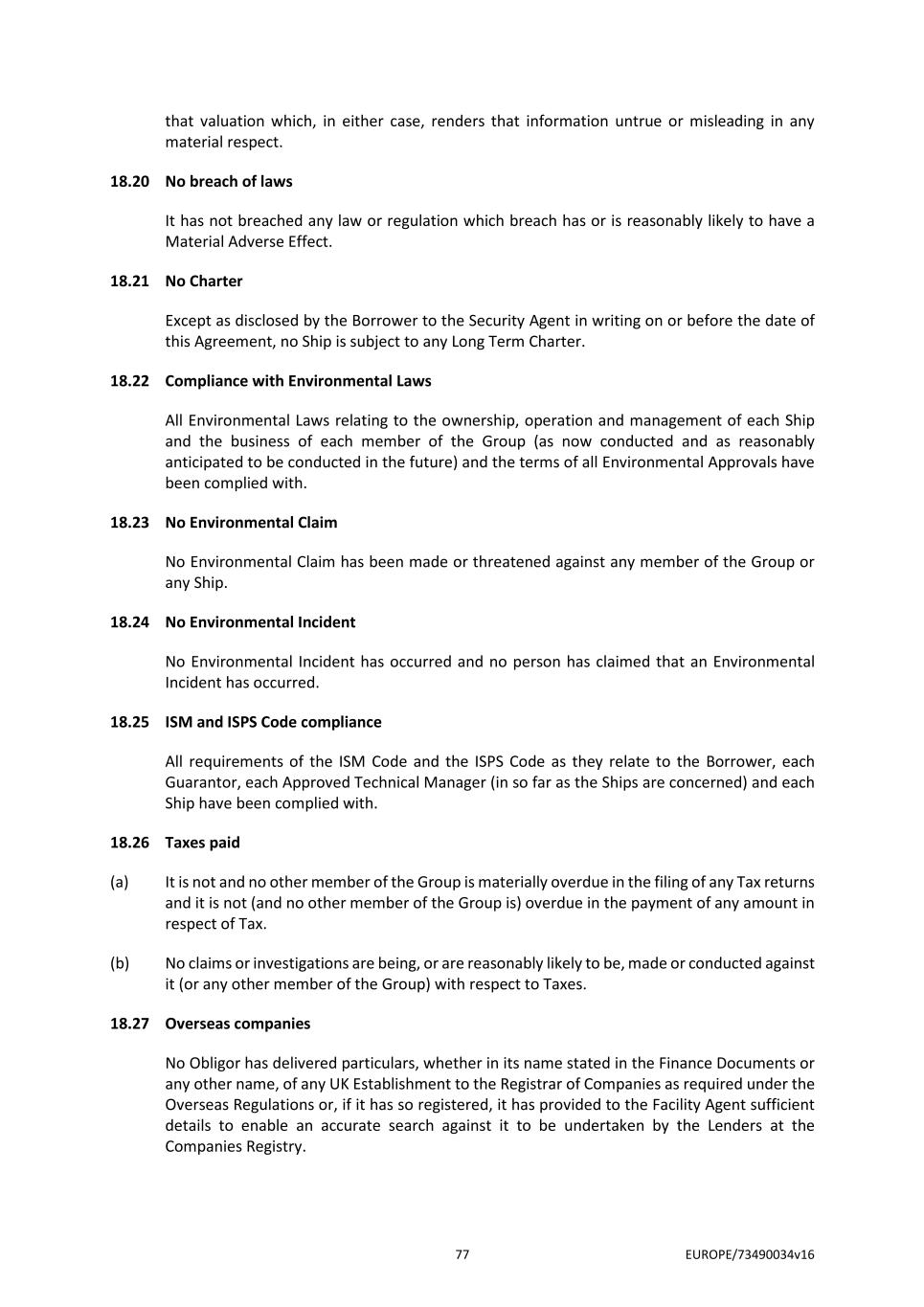 77 EUROPE/73490034v16 that valuation which, in either case, renders that information untrue or misleading in any material respect. 18.20 No breach of laws It has not breached any law or regulation which breach has or is reasonably likely to have a Material Adverse Effect. 18.21 No Charter Except as disclosed by the Borrower to the Security Agent in writing on or before the date of this Agreement, no Ship is subject to any Long Term Charter. 18.22 Compliance with Environmental Laws All Environmental Laws relating to the ownership, operation and management of each Ship and the business of each member of the Group (as now conducted and as reasonably anticipated to be conducted in the future) and the terms of all Environmental Approvals have been complied with. 18.23 No Environmental Claim No Environmental Claim has been made or threatened against any member of the Group or any Ship. 18.24 No Environmental Incident No Environmental Incident has occurred and no person has claimed that an Environmental Incident has occurred. 18.25 ISM and ISPS Code compliance All requirements of the ISM Code and the ISPS Code as they relate to the Borrower, each Guarantor, each Approved Technical Manager (in so far as the Ships are concerned) and each Ship have been complied with. 18.26 Taxes paid (a) It is not and no other member of the Group is materially overdue in the filing of any Tax returns and it is not (and no other member of the Group is) overdue in the payment of any amount in respect of Tax. (b) No claims or investigations are being, or are reasonably likely to be, made or conducted against it (or any other member of the Group) with respect to Taxes. 18.27 Overseas companies No Obligor has delivered particulars, whether in its name stated in the Finance Documents or any other name, of any UK Establishment to the Registrar of Companies as required under the Overseas Regulations or, if it has so registered, it has provided to the Facility Agent sufficient details to enable an accurate search against it to be undertaken by the Lenders at the Companies Registry.
