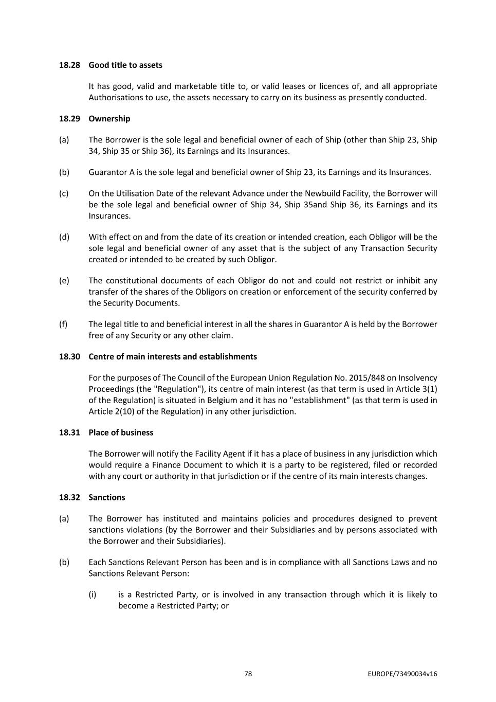 78 EUROPE/73490034v16 18.28 Good title to assets It has good, valid and marketable title to, or valid leases or licences of, and all appropriate Authorisations to use, the assets necessary to carry on its business as presently conducted. 18.29 Ownership (a) The Borrower is the sole legal and beneficial owner of each of Ship (other than Ship 23, Ship 34, Ship 35 or Ship 36), its Earnings and its Insurances. (b) Guarantor A is the sole legal and beneficial owner of Ship 23, its Earnings and its Insurances. (c) On the Utilisation Date of the relevant Advance under the Newbuild Facility, the Borrower will be the sole legal and beneficial owner of Ship 34, Ship 35and Ship 36, its Earnings and its Insurances. (d) With effect on and from the date of its creation or intended creation, each Obligor will be the sole legal and beneficial owner of any asset that is the subject of any Transaction Security created or intended to be created by such Obligor. (e) The constitutional documents of each Obligor do not and could not restrict or inhibit any transfer of the shares of the Obligors on creation or enforcement of the security conferred by the Security Documents. (f) The legal title to and beneficial interest in all the shares in Guarantor A is held by the Borrower free of any Security or any other claim. 18.30 Centre of main interests and establishments For the purposes of The Council of the European Union Regulation No. 2015/848 on Insolvency Proceedings (the "Regulation"), its centre of main interest (as that term is used in Article 3(1) of the Regulation) is situated in Belgium and it has no "establishment" (as that term is used in Article 2(10) of the Regulation) in any other jurisdiction. 18.31 Place of business The Borrower will notify the Facility Agent if it has a place of business in any jurisdiction which would require a Finance Document to which it is a party to be registered, filed or recorded with any court or authority in that jurisdiction or if the centre of its main interests changes. 18.32 Sanctions (a) The Borrower has instituted and maintains policies and procedures designed to prevent sanctions violations (by the Borrower and their Subsidiaries and by persons associated with the Borrower and their Subsidiaries). (b) Each Sanctions Relevant Person has been and is in compliance with all Sanctions Laws and no Sanctions Relevant Person: (i) is a Restricted Party, or is involved in any transaction through which it is likely to become a Restricted Party; or
