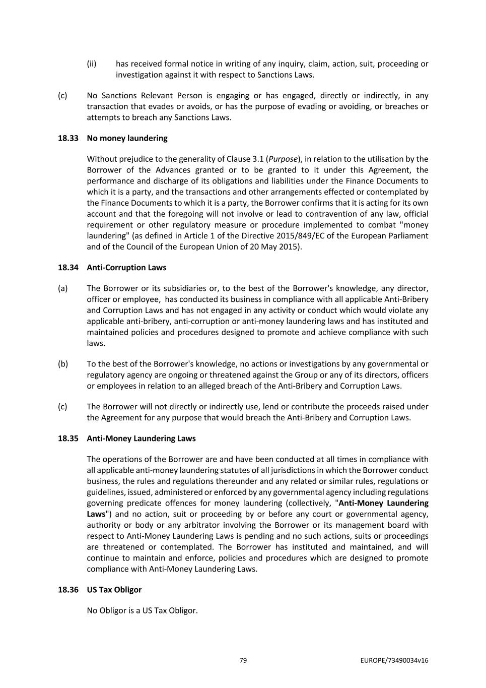 79 EUROPE/73490034v16 (ii) has received formal notice in writing of any inquiry, claim, action, suit, proceeding or investigation against it with respect to Sanctions Laws. (c) No Sanctions Relevant Person is engaging or has engaged, directly or indirectly, in any transaction that evades or avoids, or has the purpose of evading or avoiding, or breaches or attempts to breach any Sanctions Laws. 18.33 No money laundering Without prejudice to the generality of Clause 3.1 (Purpose), in relation to the utilisation by the Borrower of the Advances granted or to be granted to it under this Agreement, the performance and discharge of its obligations and liabilities under the Finance Documents to which it is a party, and the transactions and other arrangements effected or contemplated by the Finance Documents to which it is a party, the Borrower confirms that it is acting for its own account and that the foregoing will not involve or lead to contravention of any law, official requirement or other regulatory measure or procedure implemented to combat "money laundering" (as defined in Article 1 of the Directive 2015/849/EC of the European Parliament and of the Council of the European Union of 20 May 2015). 18.34 Anti-Corruption Laws (a) The Borrower or its subsidiaries or, to the best of the Borrower's knowledge, any director, officer or employee, has conducted its business in compliance with all applicable Anti-Bribery and Corruption Laws and has not engaged in any activity or conduct which would violate any applicable anti-bribery, anti-corruption or anti-money laundering laws and has instituted and maintained policies and procedures designed to promote and achieve compliance with such laws. (b) To the best of the Borrower's knowledge, no actions or investigations by any governmental or regulatory agency are ongoing or threatened against the Group or any of its directors, officers or employees in relation to an alleged breach of the Anti-Bribery and Corruption Laws. (c) The Borrower will not directly or indirectly use, lend or contribute the proceeds raised under the Agreement for any purpose that would breach the Anti-Bribery and Corruption Laws. 18.35 Anti-Money Laundering Laws The operations of the Borrower are and have been conducted at all times in compliance with all applicable anti-money laundering statutes of all jurisdictions in which the Borrower conduct business, the rules and regulations thereunder and any related or similar rules, regulations or guidelines, issued, administered or enforced by any governmental agency including regulations governing predicate offences for money laundering (collectively, "Anti-Money Laundering Laws") and no action, suit or proceeding by or before any court or governmental agency, authority or body or any arbitrator involving the Borrower or its management board with respect to Anti-Money Laundering Laws is pending and no such actions, suits or proceedings are threatened or contemplated. The Borrower has instituted and maintained, and will continue to maintain and enforce, policies and procedures which are designed to promote compliance with Anti-Money Laundering Laws. 18.36 US Tax Obligor No Obligor is a US Tax Obligor.