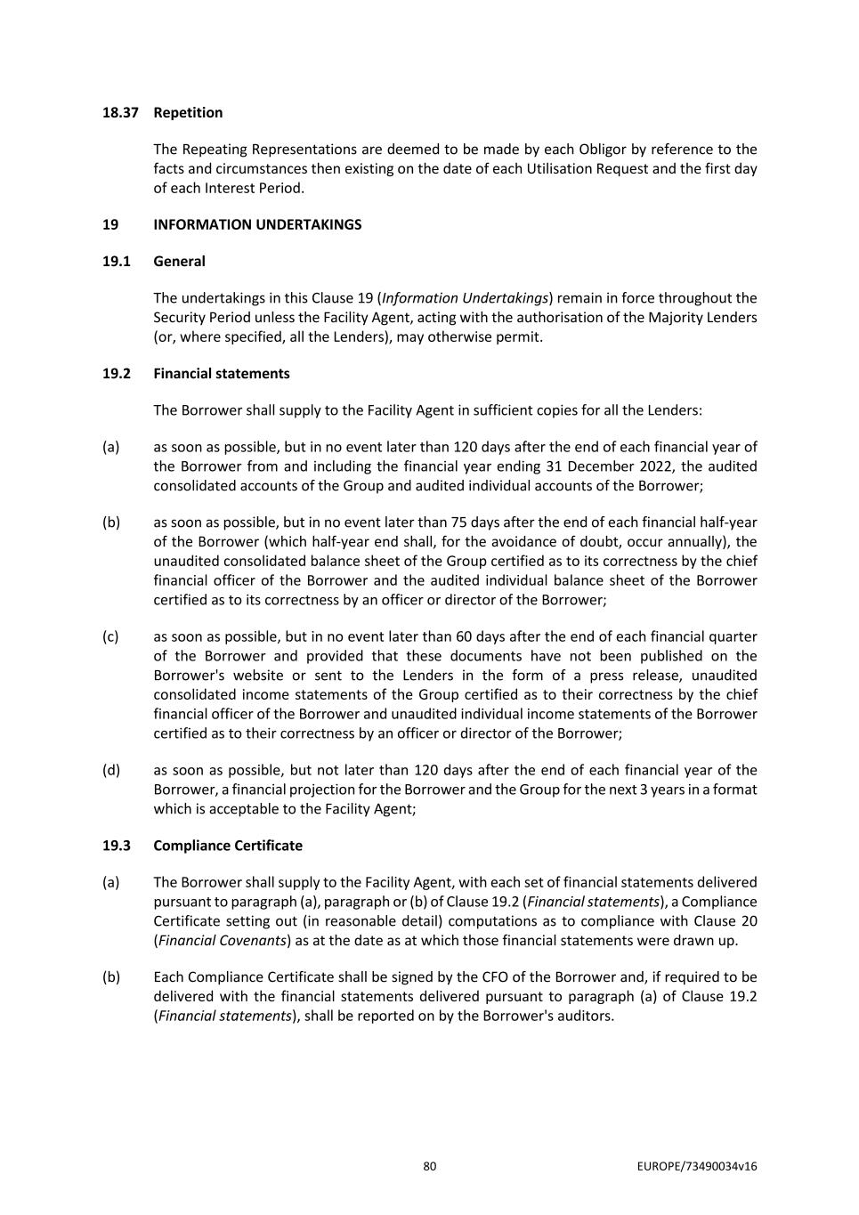 80 EUROPE/73490034v16 18.37 Repetition The Repeating Representations are deemed to be made by each Obligor by reference to the facts and circumstances then existing on the date of each Utilisation Request and the first day of each Interest Period. 19 INFORMATION UNDERTAKINGS 19.1 General The undertakings in this Clause 19 (Information Undertakings) remain in force throughout the Security Period unless the Facility Agent, acting with the authorisation of the Majority Lenders (or, where specified, all the Lenders), may otherwise permit. 19.2 Financial statements The Borrower shall supply to the Facility Agent in sufficient copies for all the Lenders: (a) as soon as possible, but in no event later than 120 days after the end of each financial year of the Borrower from and including the financial year ending 31 December 2022, the audited consolidated accounts of the Group and audited individual accounts of the Borrower; (b) as soon as possible, but in no event later than 75 days after the end of each financial half-year of the Borrower (which half-year end shall, for the avoidance of doubt, occur annually), the unaudited consolidated balance sheet of the Group certified as to its correctness by the chief financial officer of the Borrower and the audited individual balance sheet of the Borrower certified as to its correctness by an officer or director of the Borrower; (c) as soon as possible, but in no event later than 60 days after the end of each financial quarter of the Borrower and provided that these documents have not been published on the Borrower's website or sent to the Lenders in the form of a press release, unaudited consolidated income statements of the Group certified as to their correctness by the chief financial officer of the Borrower and unaudited individual income statements of the Borrower certified as to their correctness by an officer or director of the Borrower; (d) as soon as possible, but not later than 120 days after the end of each financial year of the Borrower, a financial projection for the Borrower and the Group for the next 3 years in a format which is acceptable to the Facility Agent; 19.3 Compliance Certificate (a) The Borrower shall supply to the Facility Agent, with each set of financial statements delivered pursuant to paragraph (a), paragraph or (b) of Clause 19.2 (Financial statements), a Compliance Certificate setting out (in reasonable detail) computations as to compliance with Clause 20 (Financial Covenants) as at the date as at which those financial statements were drawn up. (b) Each Compliance Certificate shall be signed by the CFO of the Borrower and, if required to be delivered with the financial statements delivered pursuant to paragraph (a) of Clause 19.2 (Financial statements), shall be reported on by the Borrower's auditors.