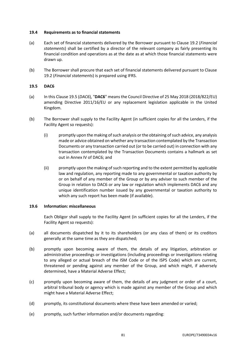 81 EUROPE/73490034v16 19.4 Requirements as to financial statements (a) Each set of financial statements delivered by the Borrower pursuant to Clause 19.2 (Financial statements) shall be certified by a director of the relevant company as fairly presenting its financial condition and operations as at the date as at which those financial statements were drawn up. (b) The Borrower shall procure that each set of financial statements delivered pursuant to Clause 19.2 (Financial statements) is prepared using IFRS. 19.5 DAC6 (a) In this Clause 19.5 (DAC6), "DAC6" means the Council Directive of 25 May 2018 (2018/822/EU) amending Directive 2011/16/EU or any replacement legislation applicable in the United Kingdom. (b) The Borrower shall supply to the Facility Agent (in sufficient copies for all the Lenders, if the Facility Agent so requests): (i) promptly upon the making of such analysis or the obtaining of such advice, any analysis made or advice obtained on whether any transaction contemplated by the Transaction Documents or any transaction carried out (or to be carried out) in connection with any transaction contemplated by the Transaction Documents contains a hallmark as set out in Annex IV of DAC6; and (ii) promptly upon the making of such reporting and to the extent permitted by applicable law and regulation, any reporting made to any governmental or taxation authority by or on behalf of any member of the Group or by any adviser to such member of the Group in relation to DAC6 or any law or regulation which implements DAC6 and any unique identification number issued by any governmental or taxation authority to which any such report has been made (if available). 19.6 Information: miscellaneous Each Obligor shall supply to the Facility Agent (in sufficient copies for all the Lenders, if the Facility Agent so requests): (a) all documents dispatched by it to its shareholders (or any class of them) or its creditors generally at the same time as they are dispatched; (b) promptly upon becoming aware of them, the details of any litigation, arbitration or administrative proceedings or investigations (including proceedings or investigations relating to any alleged or actual breach of the ISM Code or of the ISPS Code) which are current, threatened or pending against any member of the Group, and which might, if adversely determined, have a Material Adverse Effect; (c) promptly upon becoming aware of them, the details of any judgment or order of a court, arbitral tribunal body or agency which is made against any member of the Group and which might have a Material Adverse Effect; (d) promptly, its constitutional documents where these have been amended or varied; (e) promptly, such further information and/or documents regarding: