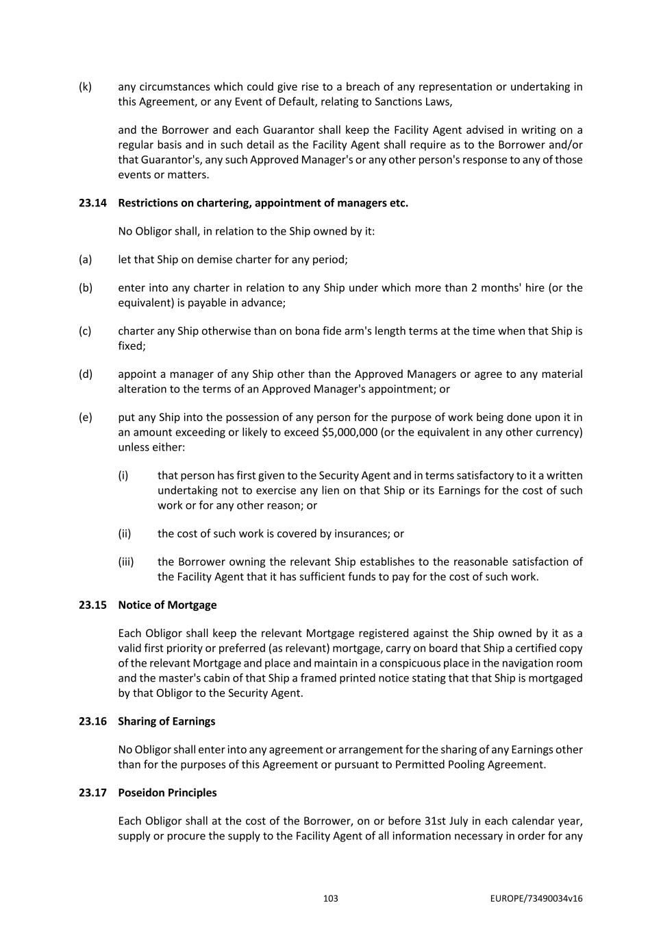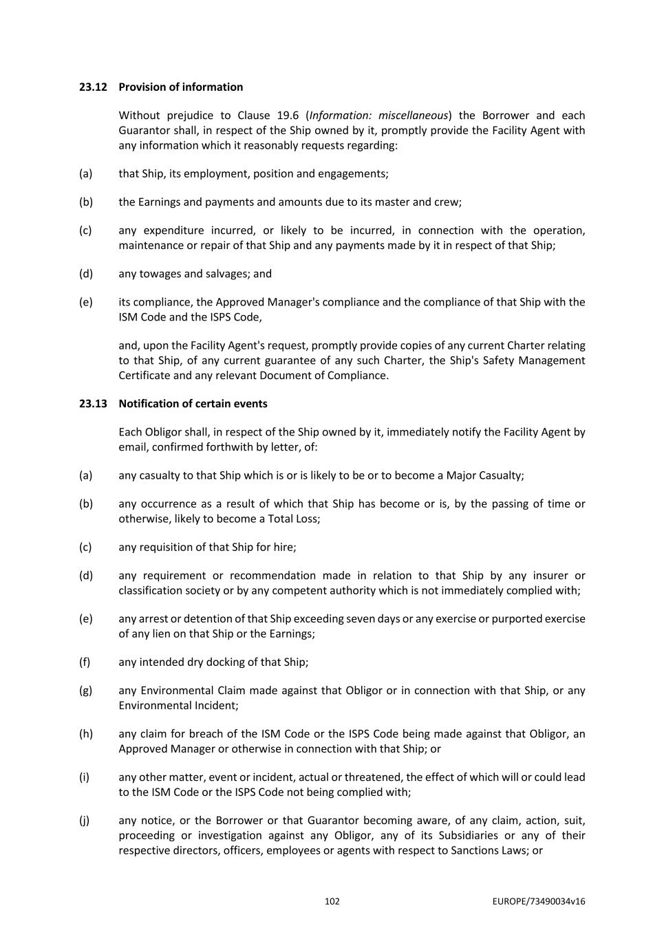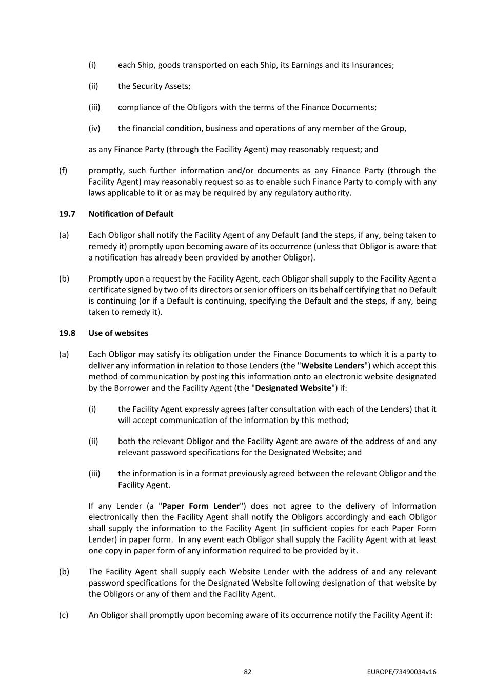 82 EUROPE/73490034v16 (i) each Ship, goods transported on each Ship, its Earnings and its Insurances; (ii) the Security Assets; (iii) compliance of the Obligors with the terms of the Finance Documents; (iv) the financial condition, business and operations of any member of the Group, as any Finance Party (through the Facility Agent) may reasonably request; and (f) promptly, such further information and/or documents as any Finance Party (through the Facility Agent) may reasonably request so as to enable such Finance Party to comply with any laws applicable to it or as may be required by any regulatory authority. 19.7 Notification of Default (a) Each Obligor shall notify the Facility Agent of any Default (and the steps, if any, being taken to remedy it) promptly upon becoming aware of its occurrence (unless that Obligor is aware that a notification has already been provided by another Obligor). (b) Promptly upon a request by the Facility Agent, each Obligor shall supply to the Facility Agent a certificate signed by two of its directors or senior officers on its behalf certifying that no Default is continuing (or if a Default is continuing, specifying the Default and the steps, if any, being taken to remedy it). 19.8 Use of websites (a) Each Obligor may satisfy its obligation under the Finance Documents to which it is a party to deliver any information in relation to those Lenders (the "Website Lenders") which accept this method of communication by posting this information onto an electronic website designated by the Borrower and the Facility Agent (the "Designated Website") if: (i) the Facility Agent expressly agrees (after consultation with each of the Lenders) that it will accept communication of the information by this method; (ii) both the relevant Obligor and the Facility Agent are aware of the address of and any relevant password specifications for the Designated Website; and (iii) the information is in a format previously agreed between the relevant Obligor and the Facility Agent. If any Lender (a "Paper Form Lender") does not agree to the delivery of information electronically then the Facility Agent shall notify the Obligors accordingly and each Obligor shall supply the information to the Facility Agent (in sufficient copies for each Paper Form Lender) in paper form. In any event each Obligor shall supply the Facility Agent with at least one copy in paper form of any information required to be provided by it. (b) The Facility Agent shall supply each Website Lender with the address of and any relevant password specifications for the Designated Website following designation of that website by the Obligors or any of them and the Facility Agent. (c) An Obligor shall promptly upon becoming aware of its occurrence notify the Facility Agent if: