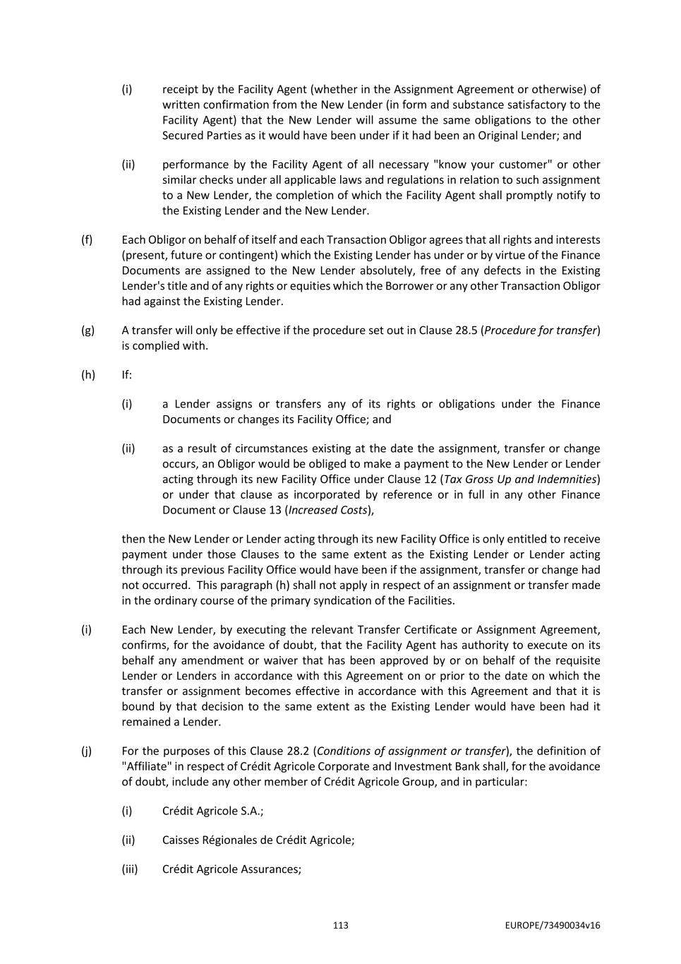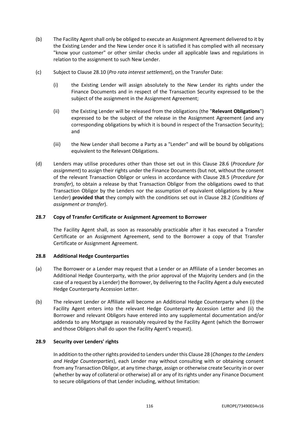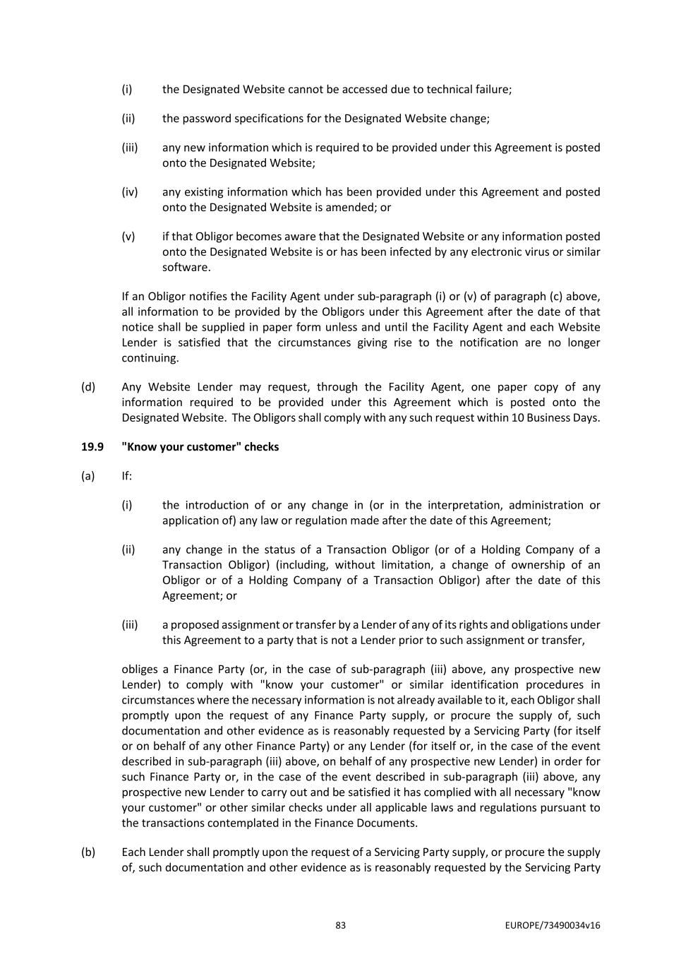 83 EUROPE/73490034v16 (i) the Designated Website cannot be accessed due to technical failure; (ii) the password specifications for the Designated Website change; (iii) any new information which is required to be provided under this Agreement is posted onto the Designated Website; (iv) any existing information which has been provided under this Agreement and posted onto the Designated Website is amended; or (v) if that Obligor becomes aware that the Designated Website or any information posted onto the Designated Website is or has been infected by any electronic virus or similar software. If an Obligor notifies the Facility Agent under sub-paragraph (i) or (v) of paragraph (c) above, all information to be provided by the Obligors under this Agreement after the date of that notice shall be supplied in paper form unless and until the Facility Agent and each Website Lender is satisfied that the circumstances giving rise to the notification are no longer continuing. (d) Any Website Lender may request, through the Facility Agent, one paper copy of any information required to be provided under this Agreement which is posted onto the Designated Website. The Obligors shall comply with any such request within 10 Business Days. 19.9 "Know your customer" checks (a) If: (i) the introduction of or any change in (or in the interpretation, administration or application of) any law or regulation made after the date of this Agreement; (ii) any change in the status of a Transaction Obligor (or of a Holding Company of a Transaction Obligor) (including, without limitation, a change of ownership of an Obligor or of a Holding Company of a Transaction Obligor) after the date of this Agreement; or (iii) a proposed assignment or transfer by a Lender of any of its rights and obligations under this Agreement to a party that is not a Lender prior to such assignment or transfer, obliges a Finance Party (or, in the case of sub-paragraph (iii) above, any prospective new Lender) to comply with "know your customer" or similar identification procedures in circumstances where the necessary information is not already available to it, each Obligor shall promptly upon the request of any Finance Party supply, or procure the supply of, such documentation and other evidence as is reasonably requested by a Servicing Party (for itself or on behalf of any other Finance Party) or any Lender (for itself or, in the case of the event described in sub-paragraph (iii) above, on behalf of any prospective new Lender) in order for such Finance Party or, in the case of the event described in sub-paragraph (iii) above, any prospective new Lender to carry out and be satisfied it has complied with all necessary "know your customer" or other similar checks under all applicable laws and regulations pursuant to the transactions contemplated in the Finance Documents. (b) Each Lender shall promptly upon the request of a Servicing Party supply, or procure the supply of, such documentation and other evidence as is reasonably requested by the Servicing Party