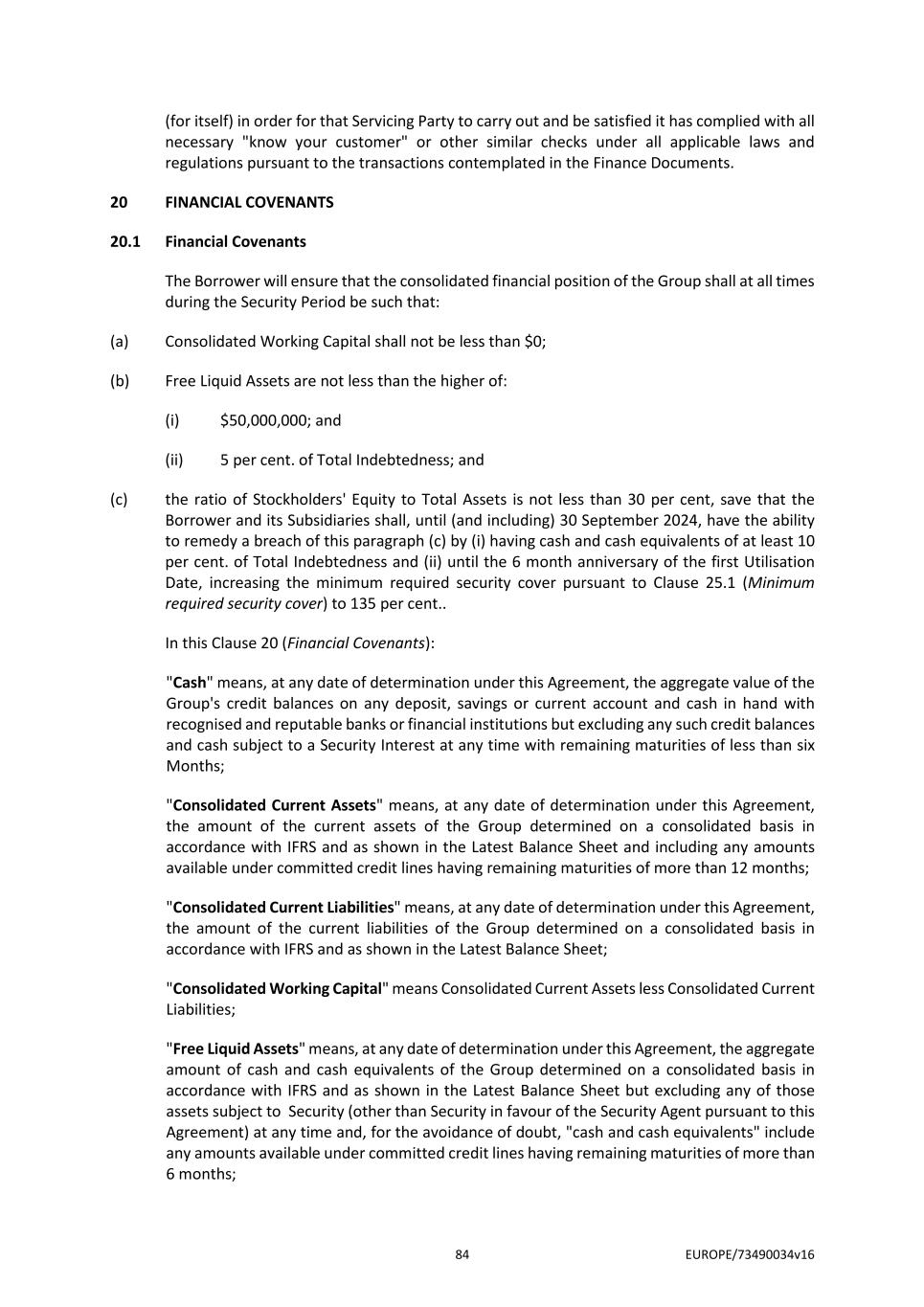 84 EUROPE/73490034v16 (for itself) in order for that Servicing Party to carry out and be satisfied it has complied with all necessary "know your customer" or other similar checks under all applicable laws and regulations pursuant to the transactions contemplated in the Finance Documents. 20 FINANCIAL COVENANTS 20.1 Financial Covenants The Borrower will ensure that the consolidated financial position of the Group shall at all times during the Security Period be such that: (a) Consolidated Working Capital shall not be less than $0; (b) Free Liquid Assets are not less than the higher of: (i) $50,000,000; and (ii) 5 per cent. of Total Indebtedness; and (c) the ratio of Stockholders' Equity to Total Assets is not less than 30 per cent, save that the Borrower and its Subsidiaries shall, until (and including) 30 September 2024, have the ability to remedy a breach of this paragraph (c) by (i) having cash and cash equivalents of at least 10 per cent. of Total Indebtedness and (ii) until the 6 month anniversary of the first Utilisation Date, increasing the minimum required security cover pursuant to Clause 25.1 (Minimum required security cover) to 135 per cent.. In this Clause 20 (Financial Covenants): "Cash" means, at any date of determination under this Agreement, the aggregate value of the Group's credit balances on any deposit, savings or current account and cash in hand with recognised and reputable banks or financial institutions but excluding any such credit balances and cash subject to a Security Interest at any time with remaining maturities of less than six Months; "Consolidated Current Assets" means, at any date of determination under this Agreement, the amount of the current assets of the Group determined on a consolidated basis in accordance with IFRS and as shown in the Latest Balance Sheet and including any amounts available under committed credit lines having remaining maturities of more than 12 months; "Consolidated Current Liabilities" means, at any date of determination under this Agreement, the amount of the current liabilities of the Group determined on a consolidated basis in accordance with IFRS and as shown in the Latest Balance Sheet; "Consolidated Working Capital" means Consolidated Current Assets less Consolidated Current Liabilities; "Free Liquid Assets" means, at any date of determination under this Agreement, the aggregate amount of cash and cash equivalents of the Group determined on a consolidated basis in accordance with IFRS and as shown in the Latest Balance Sheet but excluding any of those assets subject to Security (other than Security in favour of the Security Agent pursuant to this Agreement) at any time and, for the avoidance of doubt, "cash and cash equivalents" include any amounts available under committed credit lines having remaining maturities of more than 6 months;