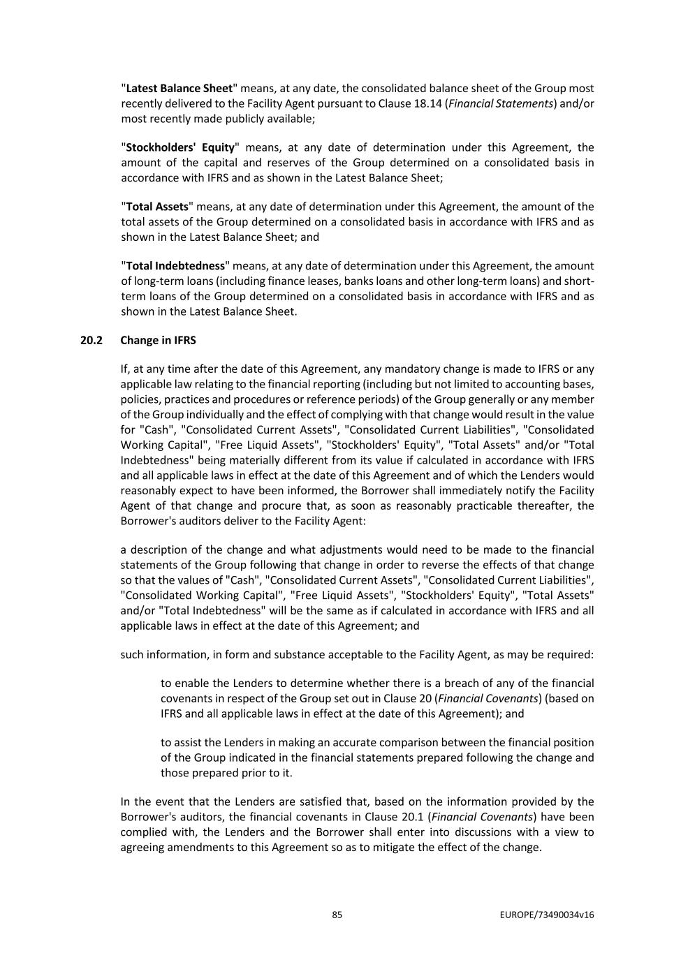 85 EUROPE/73490034v16 "Latest Balance Sheet" means, at any date, the consolidated balance sheet of the Group most recently delivered to the Facility Agent pursuant to Clause 18.14 (Financial Statements) and/or most recently made publicly available; "Stockholders' Equity" means, at any date of determination under this Agreement, the amount of the capital and reserves of the Group determined on a consolidated basis in accordance with IFRS and as shown in the Latest Balance Sheet; "Total Assets" means, at any date of determination under this Agreement, the amount of the total assets of the Group determined on a consolidated basis in accordance with IFRS and as shown in the Latest Balance Sheet; and "Total Indebtedness" means, at any date of determination under this Agreement, the amount of long-term loans (including finance leases, banks loans and other long-term loans) and short- term loans of the Group determined on a consolidated basis in accordance with IFRS and as shown in the Latest Balance Sheet. 20.2 Change in IFRS If, at any time after the date of this Agreement, any mandatory change is made to IFRS or any applicable law relating to the financial reporting (including but not limited to accounting bases, policies, practices and procedures or reference periods) of the Group generally or any member of the Group individually and the effect of complying with that change would result in the value for "Cash", "Consolidated Current Assets", "Consolidated Current Liabilities", "Consolidated Working Capital", "Free Liquid Assets", "Stockholders' Equity", "Total Assets" and/or "Total Indebtedness" being materially different from its value if calculated in accordance with IFRS and all applicable laws in effect at the date of this Agreement and of which the Lenders would reasonably expect to have been informed, the Borrower shall immediately notify the Facility Agent of that change and procure that, as soon as reasonably practicable thereafter, the Borrower's auditors deliver to the Facility Agent: a description of the change and what adjustments would need to be made to the financial statements of the Group following that change in order to reverse the effects of that change so that the values of "Cash", "Consolidated Current Assets", "Consolidated Current Liabilities", "Consolidated Working Capital", "Free Liquid Assets", "Stockholders' Equity", "Total Assets" and/or "Total Indebtedness" will be the same as if calculated in accordance with IFRS and all applicable laws in effect at the date of this Agreement; and such information, in form and substance acceptable to the Facility Agent, as may be required: to enable the Lenders to determine whether there is a breach of any of the financial covenants in respect of the Group set out in Clause 20 (Financial Covenants) (based on IFRS and all applicable laws in effect at the date of this Agreement); and to assist the Lenders in making an accurate comparison between the financial position of the Group indicated in the financial statements prepared following the change and those prepared prior to it. In the event that the Lenders are satisfied that, based on the information provided by the Borrower's auditors, the financial covenants in Clause 20.1 (Financial Covenants) have been complied with, the Lenders and the Borrower shall enter into discussions with a view to agreeing amendments to this Agreement so as to mitigate the effect of the change.