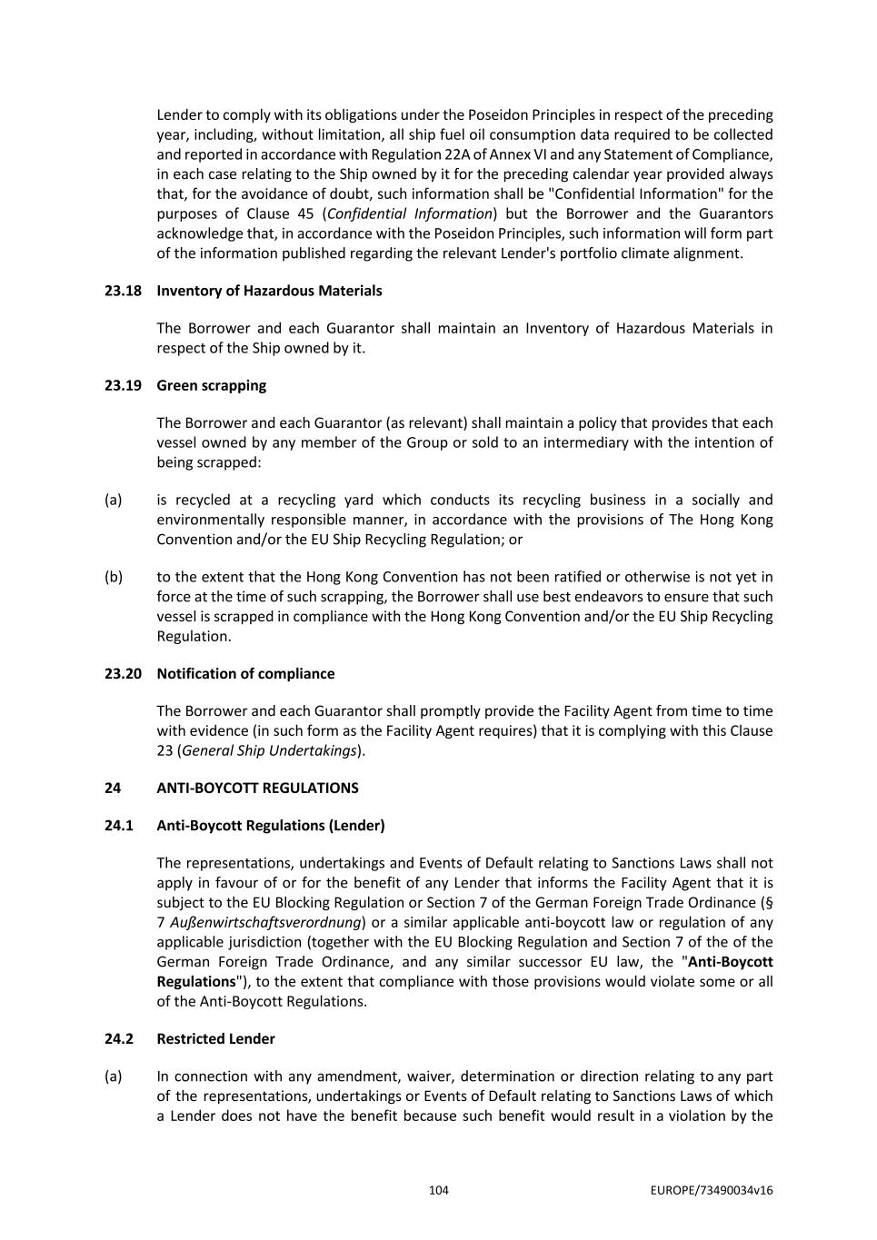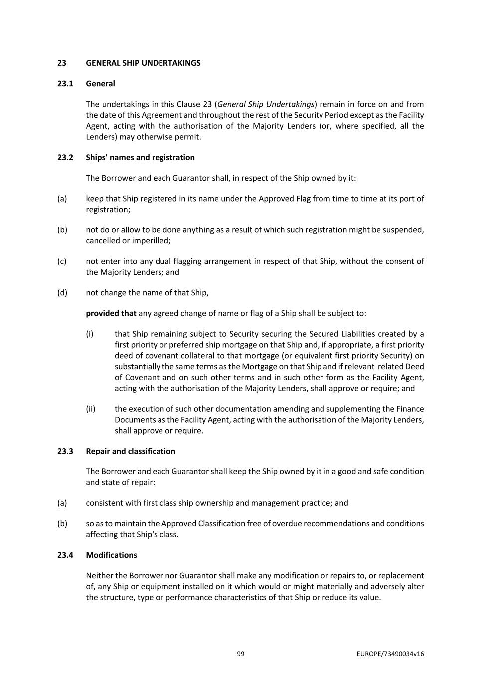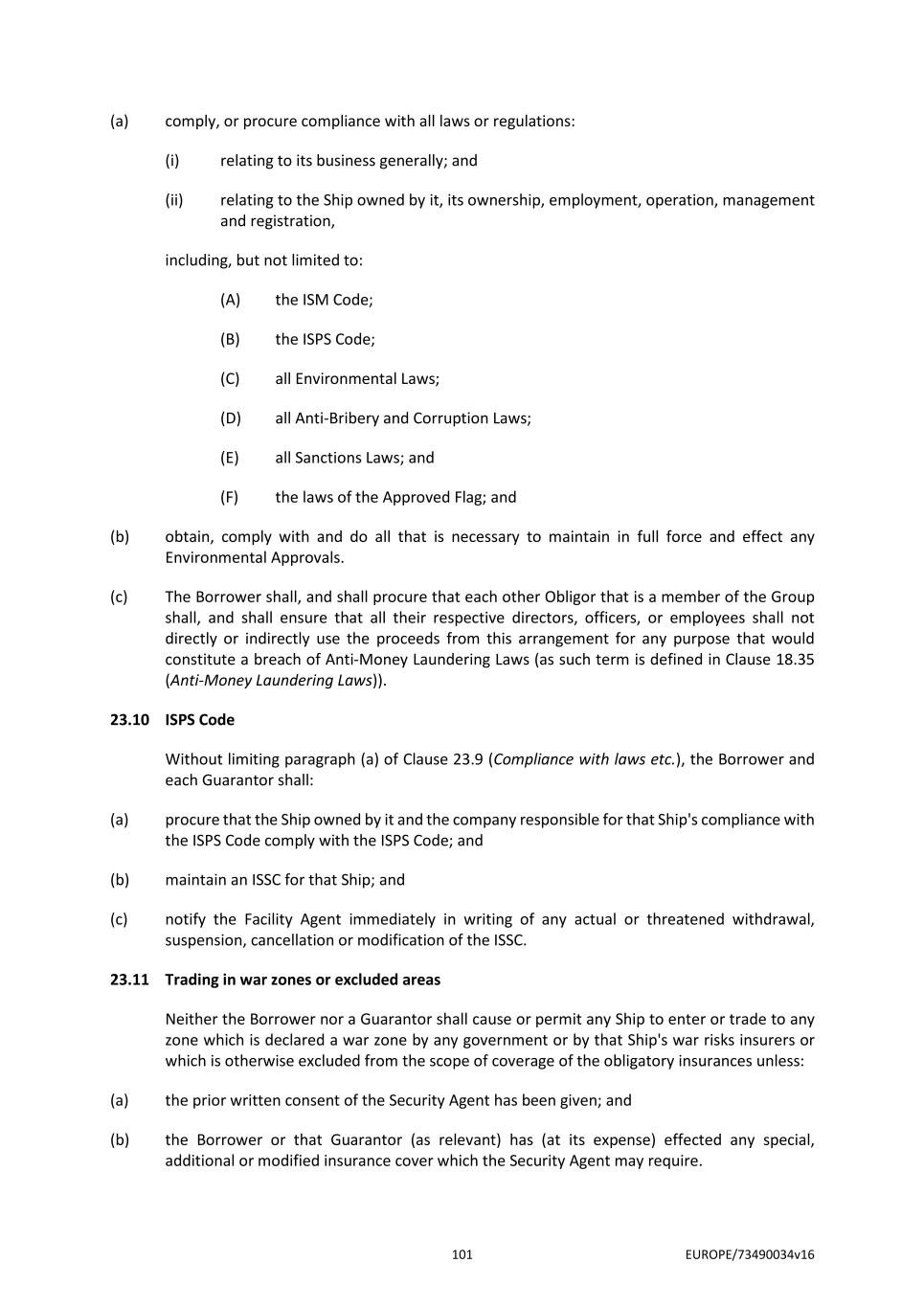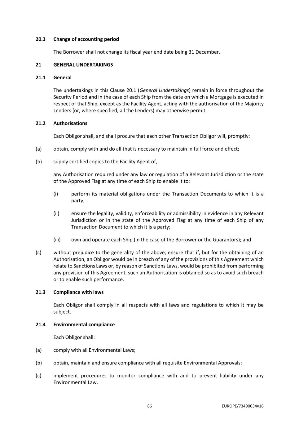 86 EUROPE/73490034v16 20.3 Change of accounting period The Borrower shall not change its fiscal year end date being 31 December. 21 GENERAL UNDERTAKINGS 21.1 General The undertakings in this Clause 20.1 (General Undertakings) remain in force throughout the Security Period and in the case of each Ship from the date on which a Mortgage is executed in respect of that Ship, except as the Facility Agent, acting with the authorisation of the Majority Lenders (or, where specified, all the Lenders) may otherwise permit. 21.2 Authorisations Each Obligor shall, and shall procure that each other Transaction Obligor will, promptly: (a) obtain, comply with and do all that is necessary to maintain in full force and effect; (b) supply certified copies to the Facility Agent of, any Authorisation required under any law or regulation of a Relevant Jurisdiction or the state of the Approved Flag at any time of each Ship to enable it to: (i) perform its material obligations under the Transaction Documents to which it is a party; (ii) ensure the legality, validity, enforceability or admissibility in evidence in any Relevant Jurisdiction or in the state of the Approved Flag at any time of each Ship of any Transaction Document to which it is a party; (iii) own and operate each Ship (in the case of the Borrower or the Guarantors); and (c) without prejudice to the generality of the above, ensure that if, but for the obtaining of an Authorisation, an Obligor would be in breach of any of the provisions of this Agreement which relate to Sanctions Laws or, by reason of Sanctions Laws, would be prohibited from performing any provision of this Agreement, such an Authorisation is obtained so as to avoid such breach or to enable such performance. 21.3 Compliance with laws Each Obligor shall comply in all respects with all laws and regulations to which it may be subject. 21.4 Environmental compliance Each Obligor shall: (a) comply with all Environmental Laws; (b) obtain, maintain and ensure compliance with all requisite Environmental Approvals; (c) implement procedures to monitor compliance with and to prevent liability under any Environmental Law.