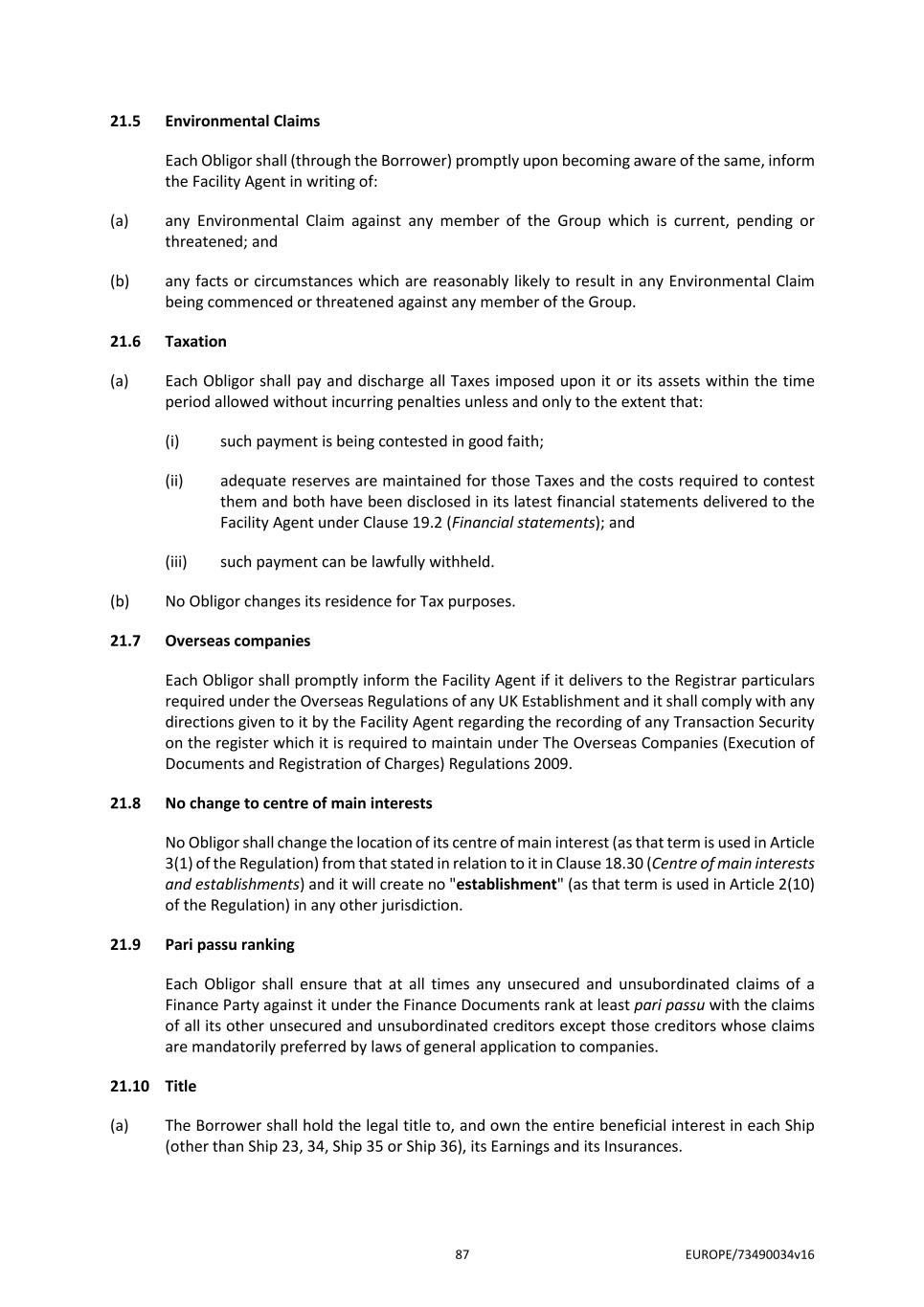 87 EUROPE/73490034v16 21.5 Environmental Claims Each Obligor shall (through the Borrower) promptly upon becoming aware of the same, inform the Facility Agent in writing of: (a) any Environmental Claim against any member of the Group which is current, pending or threatened; and (b) any facts or circumstances which are reasonably likely to result in any Environmental Claim being commenced or threatened against any member of the Group. 21.6 Taxation (a) Each Obligor shall pay and discharge all Taxes imposed upon it or its assets within the time period allowed without incurring penalties unless and only to the extent that: (i) such payment is being contested in good faith; (ii) adequate reserves are maintained for those Taxes and the costs required to contest them and both have been disclosed in its latest financial statements delivered to the Facility Agent under Clause 19.2 (Financial statements); and (iii) such payment can be lawfully withheld. (b) No Obligor changes its residence for Tax purposes. 21.7 Overseas companies Each Obligor shall promptly inform the Facility Agent if it delivers to the Registrar particulars required under the Overseas Regulations of any UK Establishment and it shall comply with any directions given to it by the Facility Agent regarding the recording of any Transaction Security on the register which it is required to maintain under The Overseas Companies (Execution of Documents and Registration of Charges) Regulations 2009. 21.8 No change to centre of main interests No Obligor shall change the location of its centre of main interest (as that term is used in Article 3(1) of the Regulation) from that stated in relation to it in Clause 18.30 (Centre of main interests and establishments) and it will create no "establishment" (as that term is used in Article 2(10) of the Regulation) in any other jurisdiction. 21.9 Pari passu ranking Each Obligor shall ensure that at all times any unsecured and unsubordinated claims of a Finance Party against it under the Finance Documents rank at least pari passu with the claims of all its other unsecured and unsubordinated creditors except those creditors whose claims are mandatorily preferred by laws of general application to companies. 21.10 Title (a) The Borrower shall hold the legal title to, and own the entire beneficial interest in each Ship (other than Ship 23, 34, Ship 35 or Ship 36), its Earnings and its Insurances.