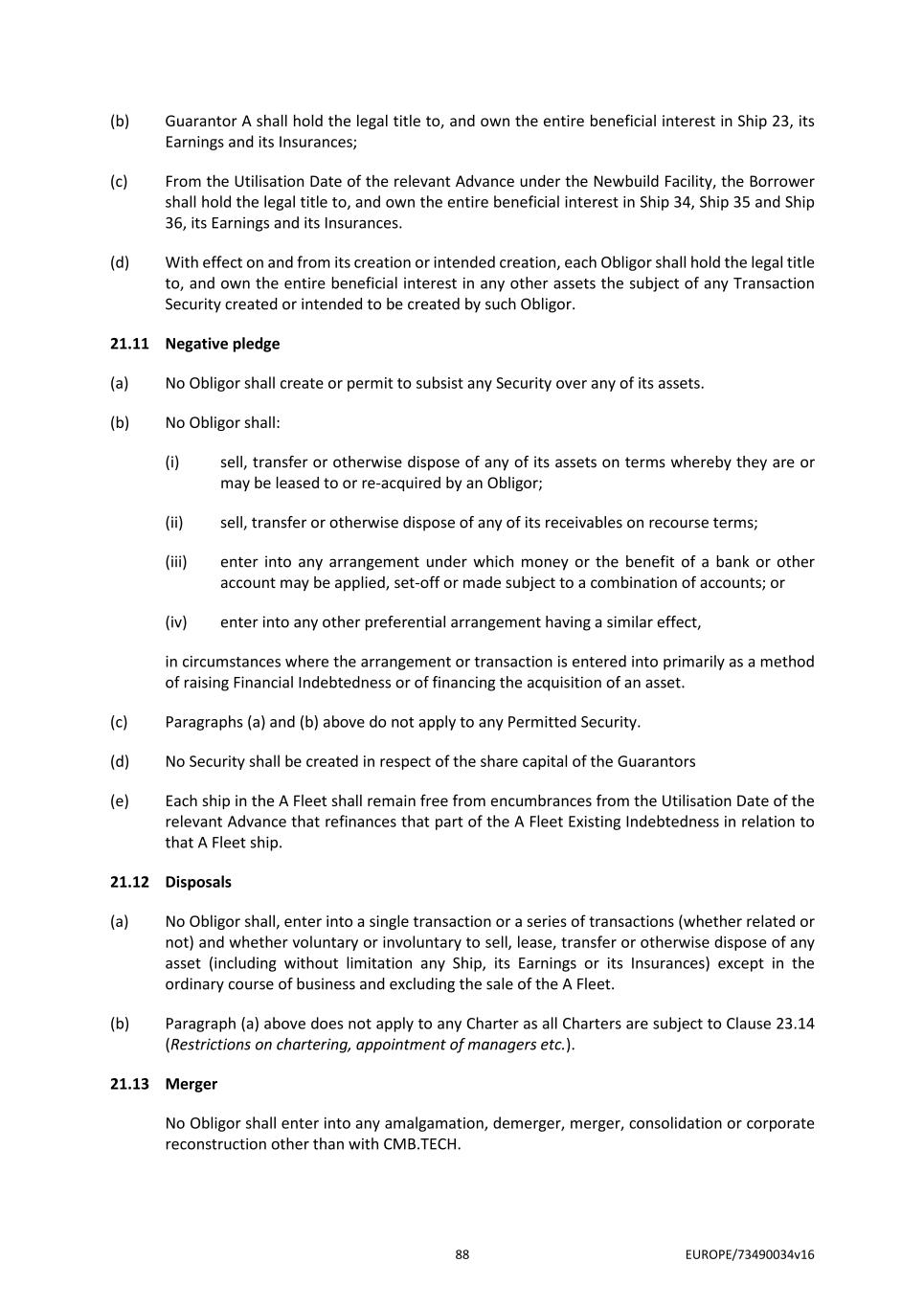 88 EUROPE/73490034v16 (b) Guarantor A shall hold the legal title to, and own the entire beneficial interest in Ship 23, its Earnings and its Insurances; (c) From the Utilisation Date of the relevant Advance under the Newbuild Facility, the Borrower shall hold the legal title to, and own the entire beneficial interest in Ship 34, Ship 35 and Ship 36, its Earnings and its Insurances. (d) With effect on and from its creation or intended creation, each Obligor shall hold the legal title to, and own the entire beneficial interest in any other assets the subject of any Transaction Security created or intended to be created by such Obligor. 21.11 Negative pledge (a) No Obligor shall create or permit to subsist any Security over any of its assets. (b) No Obligor shall: (i) sell, transfer or otherwise dispose of any of its assets on terms whereby they are or may be leased to or re-acquired by an Obligor; (ii) sell, transfer or otherwise dispose of any of its receivables on recourse terms; (iii) enter into any arrangement under which money or the benefit of a bank or other account may be applied, set-off or made subject to a combination of accounts; or (iv) enter into any other preferential arrangement having a similar effect, in circumstances where the arrangement or transaction is entered into primarily as a method of raising Financial Indebtedness or of financing the acquisition of an asset. (c) Paragraphs (a) and (b) above do not apply to any Permitted Security. (d) No Security shall be created in respect of the share capital of the Guarantors (e) Each ship in the A Fleet shall remain free from encumbrances from the Utilisation Date of the relevant Advance that refinances that part of the A Fleet Existing Indebtedness in relation to that A Fleet ship. 21.12 Disposals (a) No Obligor shall, enter into a single transaction or a series of transactions (whether related or not) and whether voluntary or involuntary to sell, lease, transfer or otherwise dispose of any asset (including without limitation any Ship, its Earnings or its Insurances) except in the ordinary course of business and excluding the sale of the A Fleet. (b) Paragraph (a) above does not apply to any Charter as all Charters are subject to Clause 23.14 (Restrictions on chartering, appointment of managers etc.). 21.13 Merger No Obligor shall enter into any amalgamation, demerger, merger, consolidation or corporate reconstruction other than with CMB.TECH.
