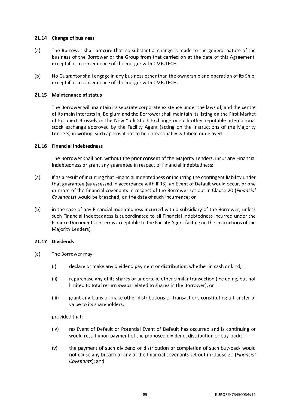 89 EUROPE/73490034v16 21.14 Change of business (a) The Borrower shall procure that no substantial change is made to the general nature of the business of the Borrower or the Group from that carried on at the date of this Agreement, except if as a consequence of the merger with CMB.TECH. (b) No Guarantor shall engage in any business other than the ownership and operation of its Ship, except if as a consequence of the merger with CMB.TECH. 21.15 Maintenance of status The Borrower will maintain its separate corporate existence under the laws of, and the centre of its main interests in, Belgium and the Borrower shall maintain its listing on the First Market of Euronext Brussels or the New York Stock Exchange or such other reputable international stock exchange approved by the Facility Agent (acting on the instructions of the Majority Lenders) in writing, such approval not to be unreasonably withheld or delayed. 21.16 Financial Indebtedness The Borrower shall not, without the prior consent of the Majority Lenders, incur any Financial Indebtedness or grant any guarantee in respect of Financial Indebtedness: (a) if as a result of incurring that Financial Indebtedness or incurring the contingent liability under that guarantee (as assessed in accordance with IFRS), an Event of Default would occur, or one or more of the financial covenants in respect of the Borrower set out in Clause 20 (Financial Covenants) would be breached, on the date of such incurrence; or (b) in the case of any Financial Indebtedness incurred with a subsidiary of the Borrower, unless such Financial Indebtedness is subordinated to all Financial Indebtedness incurred under the Finance Documents on terms acceptable to the Facility Agent (acting on the instructions of the Majority Lenders). 21.17 Dividends (a) The Borrower may: (i) declare or make any dividend payment or distribution, whether in cash or kind; (ii) repurchase any of its shares or undertake other similar transaction (including, but not limited to total return swaps related to shares in the Borrower); or (iii) grant any loans or make other distributions or transactions constituting a transfer of value to its shareholders, provided that: (iv) no Event of Default or Potential Event of Default has occurred and is continuing or would result upon payment of the proposed dividend, distribution or buy-back; (v) the payment of such dividend or distribution or completion of such buy-back would not cause any breach of any of the financial covenants set out in Clause 20 (Financial Covenants); and