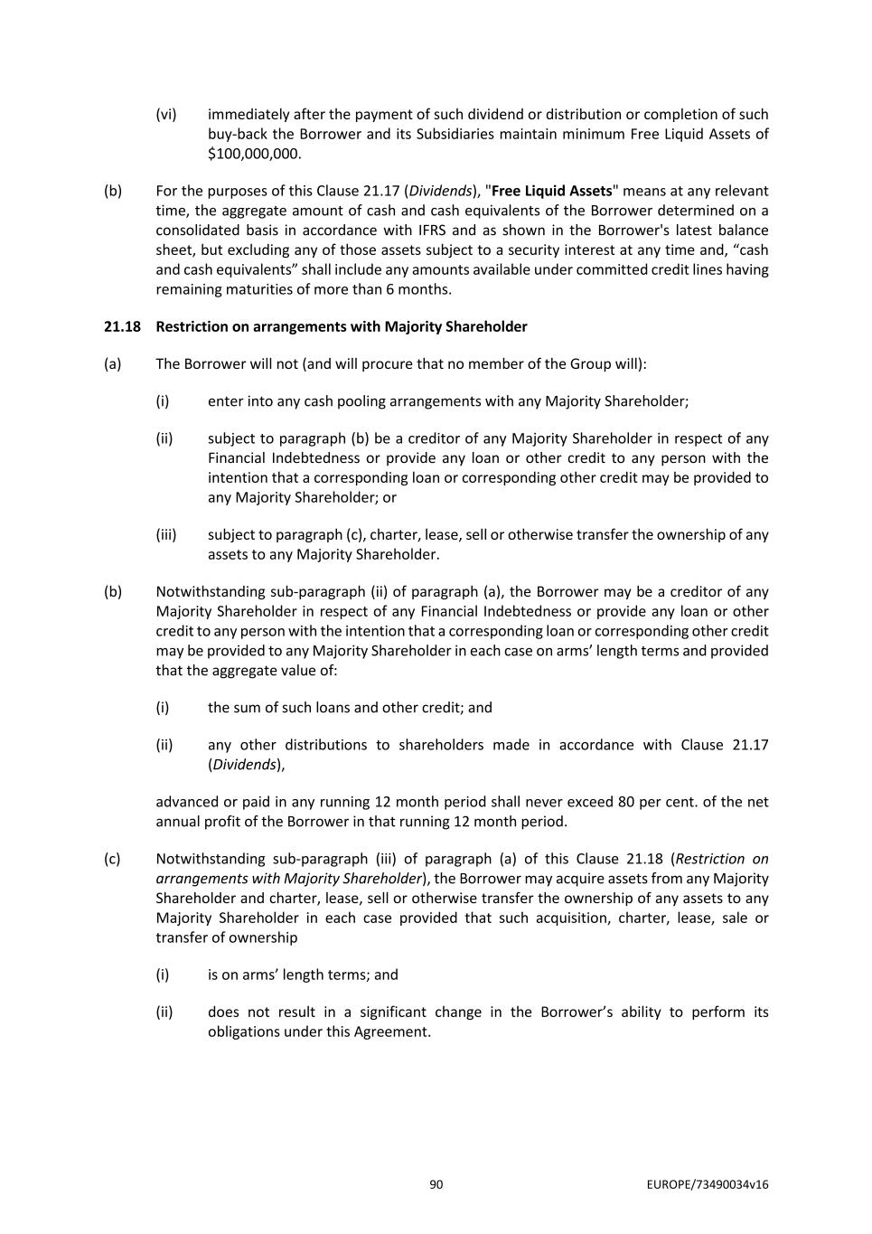 90 EUROPE/73490034v16 (vi) immediately after the payment of such dividend or distribution or completion of such buy-back the Borrower and its Subsidiaries maintain minimum Free Liquid Assets of $100,000,000. (b) For the purposes of this Clause 21.17 (Dividends), "Free Liquid Assets" means at any relevant time, the aggregate amount of cash and cash equivalents of the Borrower determined on a consolidated basis in accordance with IFRS and as shown in the Borrower's latest balance sheet, but excluding any of those assets subject to a security interest at any time and, “cash and cash equivalents” shall include any amounts available under committed credit lines having remaining maturities of more than 6 months. 21.18 Restriction on arrangements with Majority Shareholder (a) The Borrower will not (and will procure that no member of the Group will): (i) enter into any cash pooling arrangements with any Majority Shareholder; (ii) subject to paragraph (b) be a creditor of any Majority Shareholder in respect of any Financial Indebtedness or provide any loan or other credit to any person with the intention that a corresponding loan or corresponding other credit may be provided to any Majority Shareholder; or (iii) subject to paragraph (c), charter, lease, sell or otherwise transfer the ownership of any assets to any Majority Shareholder. (b) Notwithstanding sub-paragraph (ii) of paragraph (a), the Borrower may be a creditor of any Majority Shareholder in respect of any Financial Indebtedness or provide any loan or other credit to any person with the intention that a corresponding loan or corresponding other credit may be provided to any Majority Shareholder in each case on arms’ length terms and provided that the aggregate value of: (i) the sum of such loans and other credit; and (ii) any other distributions to shareholders made in accordance with Clause 21.17 (Dividends), advanced or paid in any running 12 month period shall never exceed 80 per cent. of the net annual profit of the Borrower in that running 12 month period. (c) Notwithstanding sub-paragraph (iii) of paragraph (a) of this Clause 21.18 (Restriction on arrangements with Majority Shareholder), the Borrower may acquire assets from any Majority Shareholder and charter, lease, sell or otherwise transfer the ownership of any assets to any Majority Shareholder in each case provided that such acquisition, charter, lease, sale or transfer of ownership (i) is on arms’ length terms; and (ii) does not result in a significant change in the Borrower’s ability to perform its obligations under this Agreement.