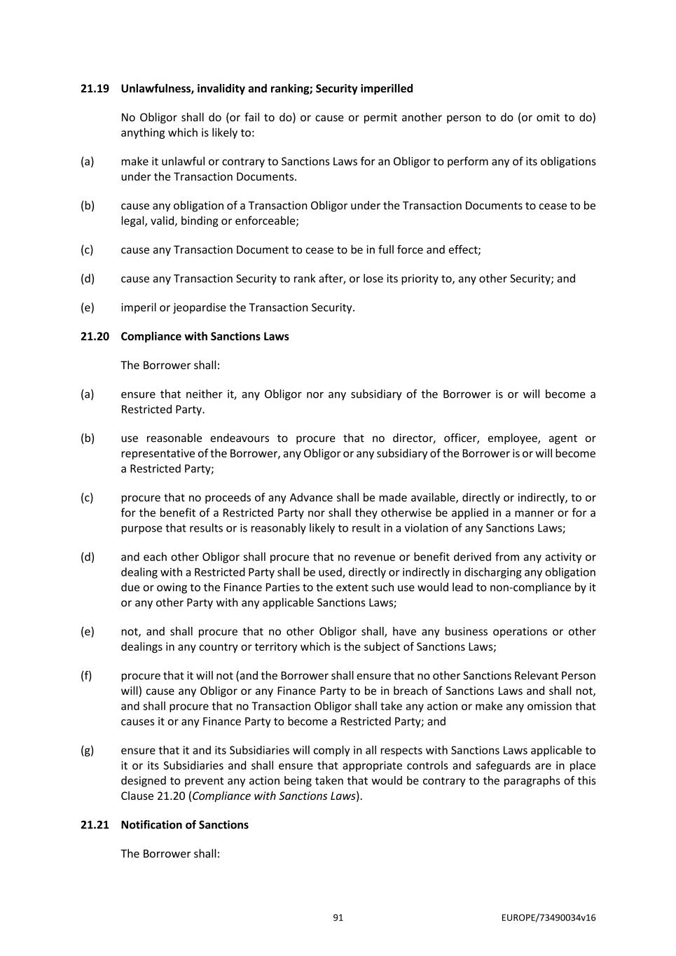 91 EUROPE/73490034v16 21.19 Unlawfulness, invalidity and ranking; Security imperilled No Obligor shall do (or fail to do) or cause or permit another person to do (or omit to do) anything which is likely to: (a) make it unlawful or contrary to Sanctions Laws for an Obligor to perform any of its obligations under the Transaction Documents. (b) cause any obligation of a Transaction Obligor under the Transaction Documents to cease to be legal, valid, binding or enforceable; (c) cause any Transaction Document to cease to be in full force and effect; (d) cause any Transaction Security to rank after, or lose its priority to, any other Security; and (e) imperil or jeopardise the Transaction Security. 21.20 Compliance with Sanctions Laws The Borrower shall: (a) ensure that neither it, any Obligor nor any subsidiary of the Borrower is or will become a Restricted Party. (b) use reasonable endeavours to procure that no director, officer, employee, agent or representative of the Borrower, any Obligor or any subsidiary of the Borrower is or will become a Restricted Party; (c) procure that no proceeds of any Advance shall be made available, directly or indirectly, to or for the benefit of a Restricted Party nor shall they otherwise be applied in a manner or for a purpose that results or is reasonably likely to result in a violation of any Sanctions Laws; (d) and each other Obligor shall procure that no revenue or benefit derived from any activity or dealing with a Restricted Party shall be used, directly or indirectly in discharging any obligation due or owing to the Finance Parties to the extent such use would lead to non-compliance by it or any other Party with any applicable Sanctions Laws; (e) not, and shall procure that no other Obligor shall, have any business operations or other dealings in any country or territory which is the subject of Sanctions Laws; (f) procure that it will not (and the Borrower shall ensure that no other Sanctions Relevant Person will) cause any Obligor or any Finance Party to be in breach of Sanctions Laws and shall not, and shall procure that no Transaction Obligor shall take any action or make any omission that causes it or any Finance Party to become a Restricted Party; and (g) ensure that it and its Subsidiaries will comply in all respects with Sanctions Laws applicable to it or its Subsidiaries and shall ensure that appropriate controls and safeguards are in place designed to prevent any action being taken that would be contrary to the paragraphs of this Clause 21.20 (Compliance with Sanctions Laws). 21.21 Notification of Sanctions The Borrower shall: