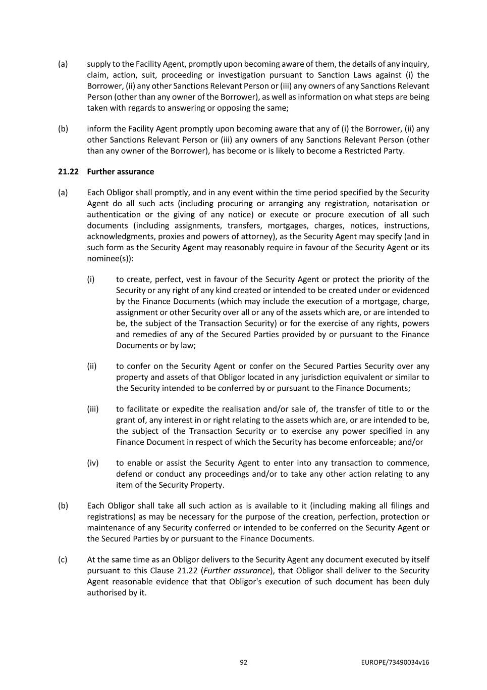 92 EUROPE/73490034v16 (a) supply to the Facility Agent, promptly upon becoming aware of them, the details of any inquiry, claim, action, suit, proceeding or investigation pursuant to Sanction Laws against (i) the Borrower, (ii) any other Sanctions Relevant Person or (iii) any owners of any Sanctions Relevant Person (other than any owner of the Borrower), as well as information on what steps are being taken with regards to answering or opposing the same; (b) inform the Facility Agent promptly upon becoming aware that any of (i) the Borrower, (ii) any other Sanctions Relevant Person or (iii) any owners of any Sanctions Relevant Person (other than any owner of the Borrower), has become or is likely to become a Restricted Party. 21.22 Further assurance (a) Each Obligor shall promptly, and in any event within the time period specified by the Security Agent do all such acts (including procuring or arranging any registration, notarisation or authentication or the giving of any notice) or execute or procure execution of all such documents (including assignments, transfers, mortgages, charges, notices, instructions, acknowledgments, proxies and powers of attorney), as the Security Agent may specify (and in such form as the Security Agent may reasonably require in favour of the Security Agent or its nominee(s)): (i) to create, perfect, vest in favour of the Security Agent or protect the priority of the Security or any right of any kind created or intended to be created under or evidenced by the Finance Documents (which may include the execution of a mortgage, charge, assignment or other Security over all or any of the assets which are, or are intended to be, the subject of the Transaction Security) or for the exercise of any rights, powers and remedies of any of the Secured Parties provided by or pursuant to the Finance Documents or by law; (ii) to confer on the Security Agent or confer on the Secured Parties Security over any property and assets of that Obligor located in any jurisdiction equivalent or similar to the Security intended to be conferred by or pursuant to the Finance Documents; (iii) to facilitate or expedite the realisation and/or sale of, the transfer of title to or the grant of, any interest in or right relating to the assets which are, or are intended to be, the subject of the Transaction Security or to exercise any power specified in any Finance Document in respect of which the Security has become enforceable; and/or (iv) to enable or assist the Security Agent to enter into any transaction to commence, defend or conduct any proceedings and/or to take any other action relating to any item of the Security Property. (b) Each Obligor shall take all such action as is available to it (including making all filings and registrations) as may be necessary for the purpose of the creation, perfection, protection or maintenance of any Security conferred or intended to be conferred on the Security Agent or the Secured Parties by or pursuant to the Finance Documents. (c) At the same time as an Obligor delivers to the Security Agent any document executed by itself pursuant to this Clause 21.22 (Further assurance), that Obligor shall deliver to the Security Agent reasonable evidence that that Obligor's execution of such document has been duly authorised by it.