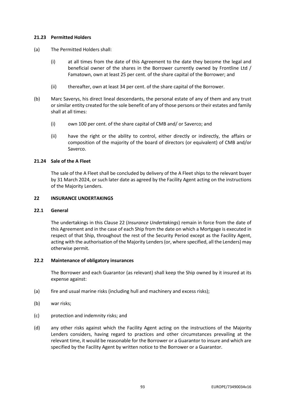 93 EUROPE/73490034v16 21.23 Permitted Holders (a) The Permitted Holders shall: (i) at all times from the date of this Agreement to the date they become the legal and beneficial owner of the shares in the Borrower currently owned by Frontline Ltd / Famatown, own at least 25 per cent. of the share capital of the Borrower; and (ii) thereafter, own at least 34 per cent. of the share capital of the Borrower. (b) Marc Saverys, his direct lineal descendants, the personal estate of any of them and any trust or similar entity created for the sole benefit of any of those persons or their estates and family shall at all times: (i) own 100 per cent. of the share capital of CMB and/ or Saverco; and (ii) have the right or the ability to control, either directly or indirectly, the affairs or composition of the majority of the board of directors (or equivalent) of CMB and/or Saverco. 21.24 Sale of the A Fleet The sale of the A Fleet shall be concluded by delivery of the A Fleet ships to the relevant buyer by 31 March 2024, or such later date as agreed by the Facility Agent acting on the instructions of the Majority Lenders. 22 INSURANCE UNDERTAKINGS 22.1 General The undertakings in this Clause 22 (Insurance Undertakings) remain in force from the date of this Agreement and in the case of each Ship from the date on which a Mortgage is executed in respect of that Ship, throughout the rest of the Security Period except as the Facility Agent, acting with the authorisation of the Majority Lenders (or, where specified, all the Lenders) may otherwise permit. 22.2 Maintenance of obligatory insurances The Borrower and each Guarantor (as relevant) shall keep the Ship owned by it insured at its expense against: (a) fire and usual marine risks (including hull and machinery and excess risks); (b) war risks; (c) protection and indemnity risks; and (d) any other risks against which the Facility Agent acting on the instructions of the Majority Lenders considers, having regard to practices and other circumstances prevailing at the relevant time, it would be reasonable for the Borrower or a Guarantor to insure and which are specified by the Facility Agent by written notice to the Borrower or a Guarantor.