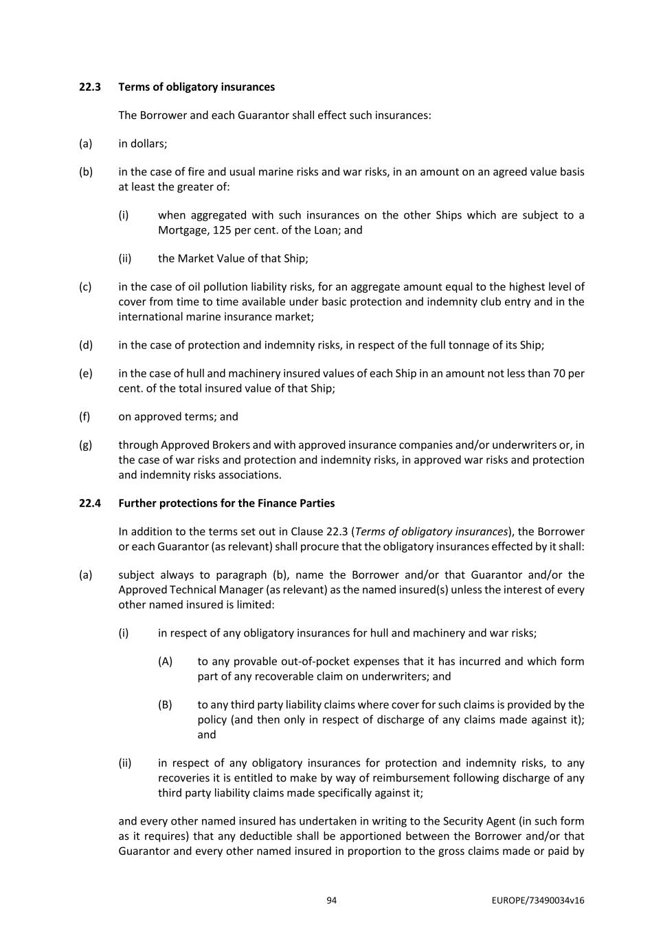 94 EUROPE/73490034v16 22.3 Terms of obligatory insurances The Borrower and each Guarantor shall effect such insurances: (a) in dollars; (b) in the case of fire and usual marine risks and war risks, in an amount on an agreed value basis at least the greater of: (i) when aggregated with such insurances on the other Ships which are subject to a Mortgage, 125 per cent. of the Loan; and (ii) the Market Value of that Ship; (c) in the case of oil pollution liability risks, for an aggregate amount equal to the highest level of cover from time to time available under basic protection and indemnity club entry and in the international marine insurance market; (d) in the case of protection and indemnity risks, in respect of the full tonnage of its Ship; (e) in the case of hull and machinery insured values of each Ship in an amount not less than 70 per cent. of the total insured value of that Ship; (f) on approved terms; and (g) through Approved Brokers and with approved insurance companies and/or underwriters or, in the case of war risks and protection and indemnity risks, in approved war risks and protection and indemnity risks associations. 22.4 Further protections for the Finance Parties In addition to the terms set out in Clause 22.3 (Terms of obligatory insurances), the Borrower or each Guarantor (as relevant) shall procure that the obligatory insurances effected by it shall: (a) subject always to paragraph (b), name the Borrower and/or that Guarantor and/or the Approved Technical Manager (as relevant) as the named insured(s) unless the interest of every other named insured is limited: (i) in respect of any obligatory insurances for hull and machinery and war risks; (A) to any provable out-of-pocket expenses that it has incurred and which form part of any recoverable claim on underwriters; and (B) to any third party liability claims where cover for such claims is provided by the policy (and then only in respect of discharge of any claims made against it); and (ii) in respect of any obligatory insurances for protection and indemnity risks, to any recoveries it is entitled to make by way of reimbursement following discharge of any third party liability claims made specifically against it; and every other named insured has undertaken in writing to the Security Agent (in such form as it requires) that any deductible shall be apportioned between the Borrower and/or that Guarantor and every other named insured in proportion to the gross claims made or paid by