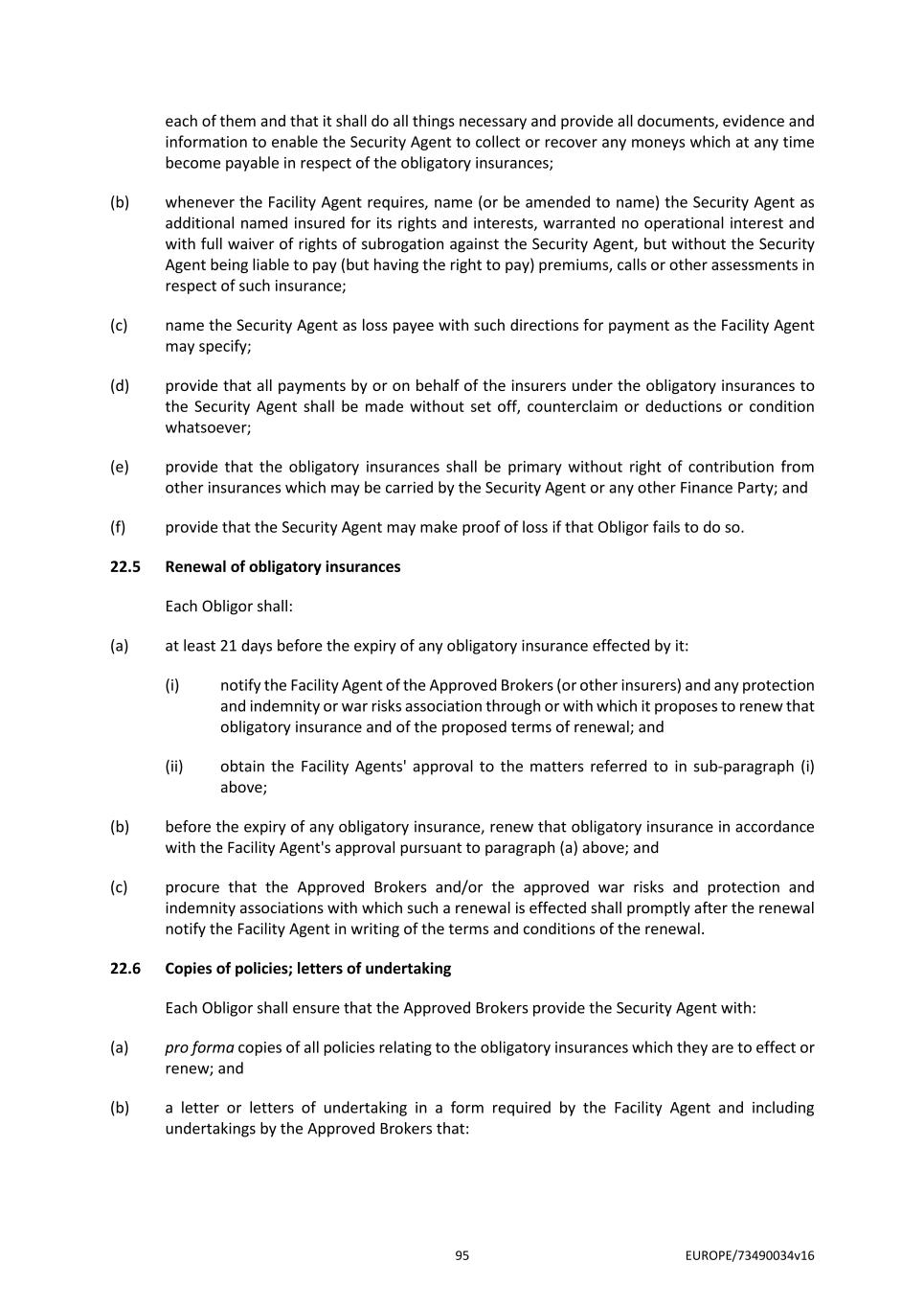 95 EUROPE/73490034v16 each of them and that it shall do all things necessary and provide all documents, evidence and information to enable the Security Agent to collect or recover any moneys which at any time become payable in respect of the obligatory insurances; (b) whenever the Facility Agent requires, name (or be amended to name) the Security Agent as additional named insured for its rights and interests, warranted no operational interest and with full waiver of rights of subrogation against the Security Agent, but without the Security Agent being liable to pay (but having the right to pay) premiums, calls or other assessments in respect of such insurance; (c) name the Security Agent as loss payee with such directions for payment as the Facility Agent may specify; (d) provide that all payments by or on behalf of the insurers under the obligatory insurances to the Security Agent shall be made without set off, counterclaim or deductions or condition whatsoever; (e) provide that the obligatory insurances shall be primary without right of contribution from other insurances which may be carried by the Security Agent or any other Finance Party; and (f) provide that the Security Agent may make proof of loss if that Obligor fails to do so. 22.5 Renewal of obligatory insurances Each Obligor shall: (a) at least 21 days before the expiry of any obligatory insurance effected by it: (i) notify the Facility Agent of the Approved Brokers (or other insurers) and any protection and indemnity or war risks association through or with which it proposes to renew that obligatory insurance and of the proposed terms of renewal; and (ii) obtain the Facility Agents' approval to the matters referred to in sub-paragraph (i) above; (b) before the expiry of any obligatory insurance, renew that obligatory insurance in accordance with the Facility Agent's approval pursuant to paragraph (a) above; and (c) procure that the Approved Brokers and/or the approved war risks and protection and indemnity associations with which such a renewal is effected shall promptly after the renewal notify the Facility Agent in writing of the terms and conditions of the renewal. 22.6 Copies of policies; letters of undertaking Each Obligor shall ensure that the Approved Brokers provide the Security Agent with: (a) pro forma copies of all policies relating to the obligatory insurances which they are to effect or renew; and (b) a letter or letters of undertaking in a form required by the Facility Agent and including undertakings by the Approved Brokers that:
