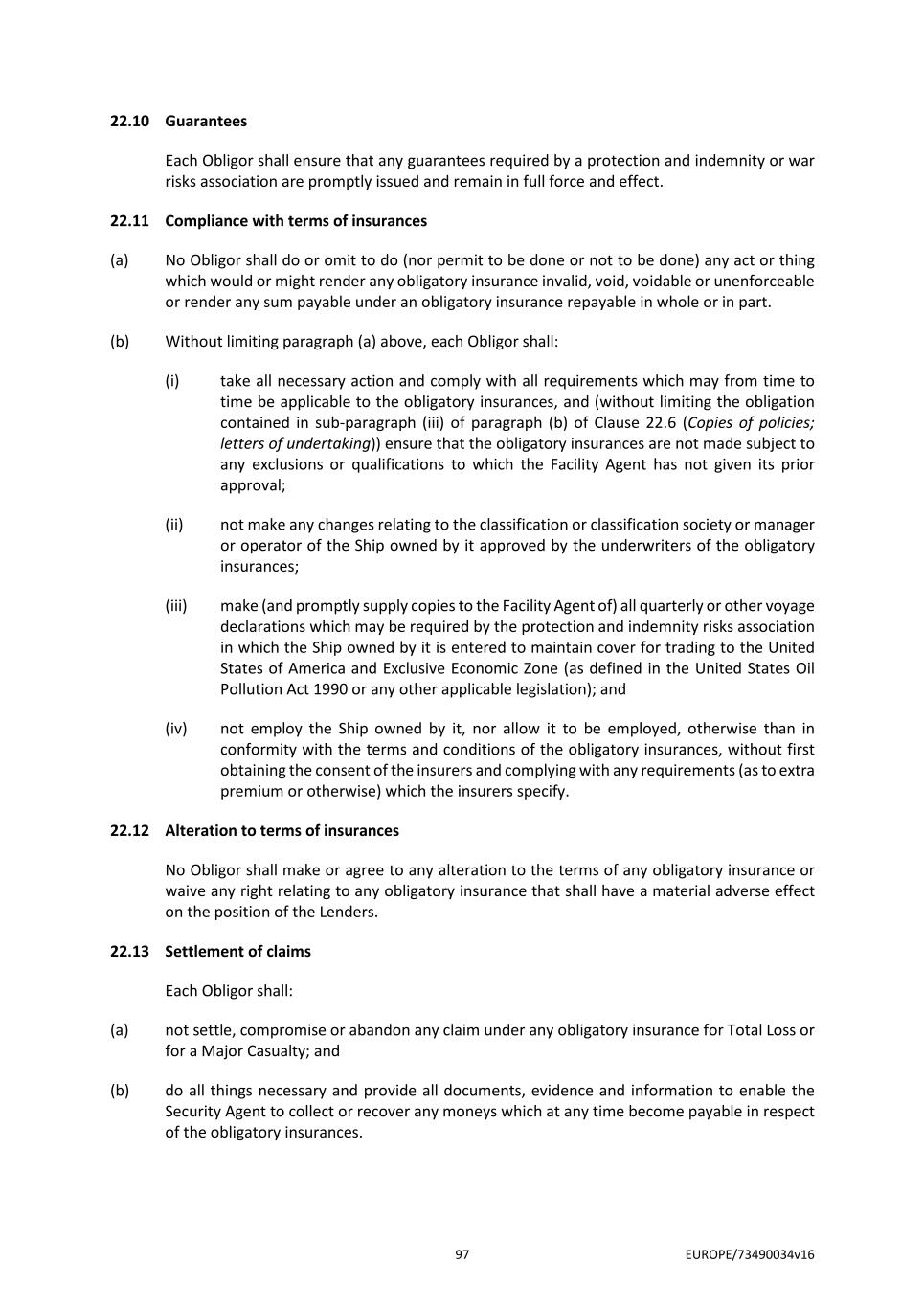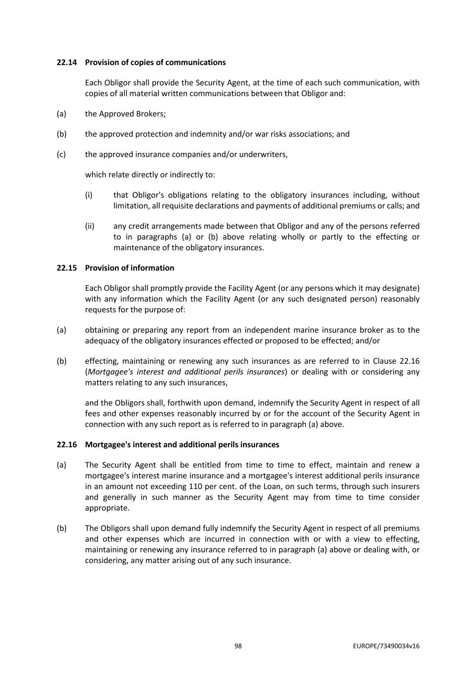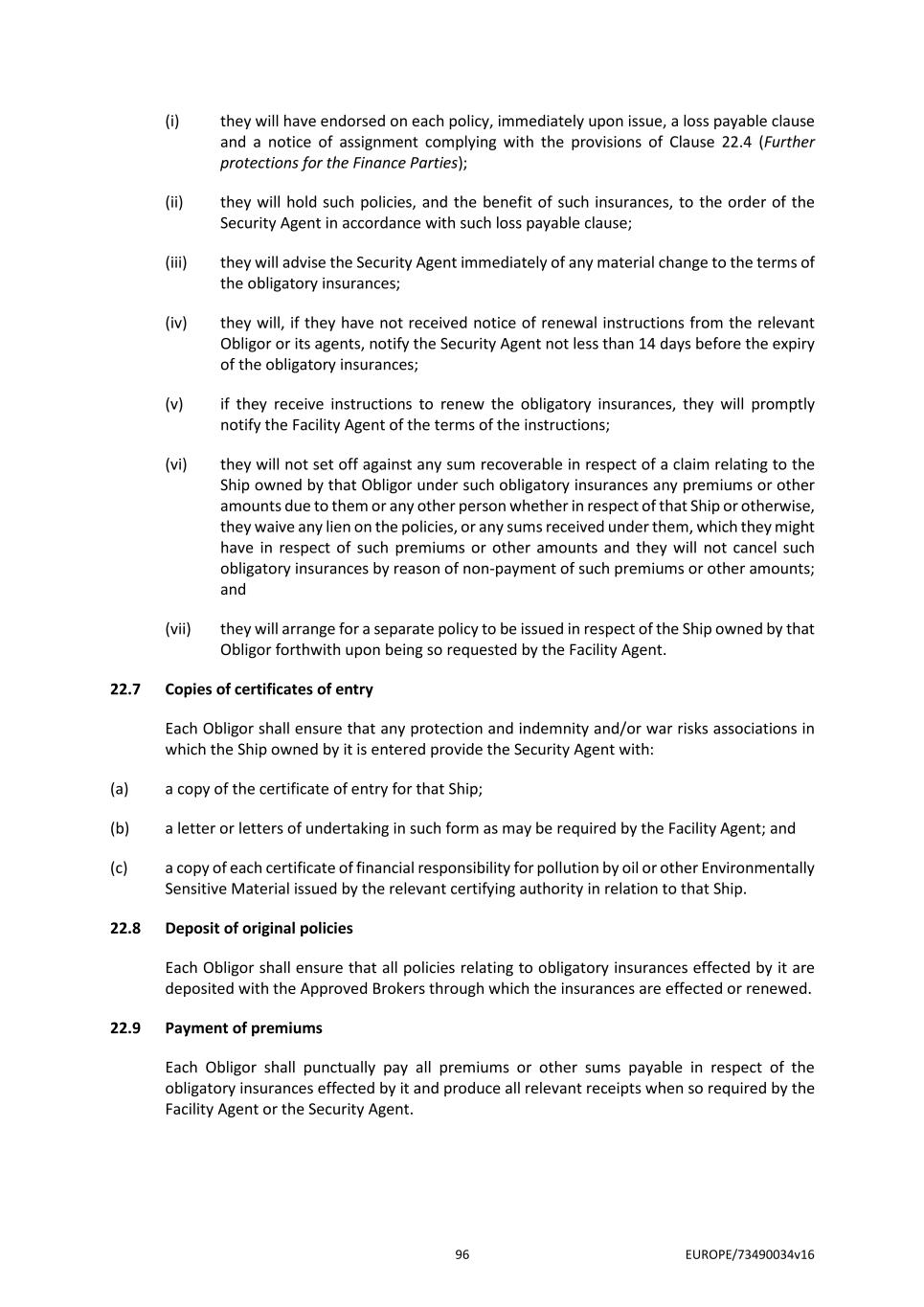 96 EUROPE/73490034v16 (i) they will have endorsed on each policy, immediately upon issue, a loss payable clause and a notice of assignment complying with the provisions of Clause 22.4 (Further protections for the Finance Parties); (ii) they will hold such policies, and the benefit of such insurances, to the order of the Security Agent in accordance with such loss payable clause; (iii) they will advise the Security Agent immediately of any material change to the terms of the obligatory insurances; (iv) they will, if they have not received notice of renewal instructions from the relevant Obligor or its agents, notify the Security Agent not less than 14 days before the expiry of the obligatory insurances; (v) if they receive instructions to renew the obligatory insurances, they will promptly notify the Facility Agent of the terms of the instructions; (vi) they will not set off against any sum recoverable in respect of a claim relating to the Ship owned by that Obligor under such obligatory insurances any premiums or other amounts due to them or any other person whether in respect of that Ship or otherwise, they waive any lien on the policies, or any sums received under them, which they might have in respect of such premiums or other amounts and they will not cancel such obligatory insurances by reason of non-payment of such premiums or other amounts; and (vii) they will arrange for a separate policy to be issued in respect of the Ship owned by that Obligor forthwith upon being so requested by the Facility Agent. 22.7 Copies of certificates of entry Each Obligor shall ensure that any protection and indemnity and/or war risks associations in which the Ship owned by it is entered provide the Security Agent with: (a) a copy of the certificate of entry for that Ship; (b) a letter or letters of undertaking in such form as may be required by the Facility Agent; and (c) a copy of each certificate of financial responsibility for pollution by oil or other Environmentally Sensitive Material issued by the relevant certifying authority in relation to that Ship. 22.8 Deposit of original policies Each Obligor shall ensure that all policies relating to obligatory insurances effected by it are deposited with the Approved Brokers through which the insurances are effected or renewed. 22.9 Payment of premiums Each Obligor shall punctually pay all premiums or other sums payable in respect of the obligatory insurances effected by it and produce all relevant receipts when so required by the Facility Agent or the Security Agent.