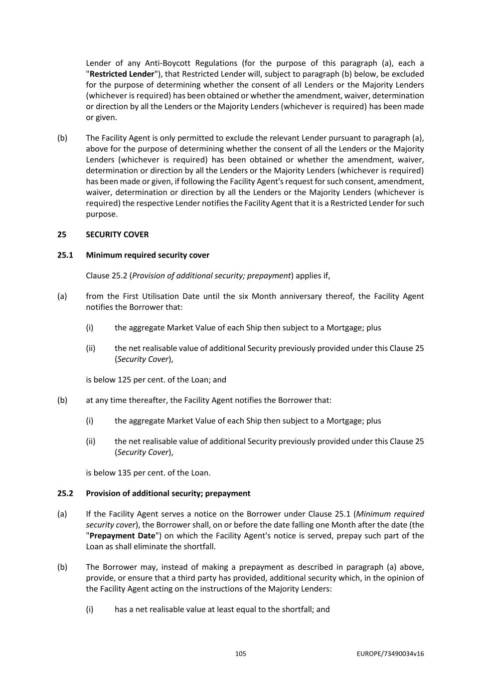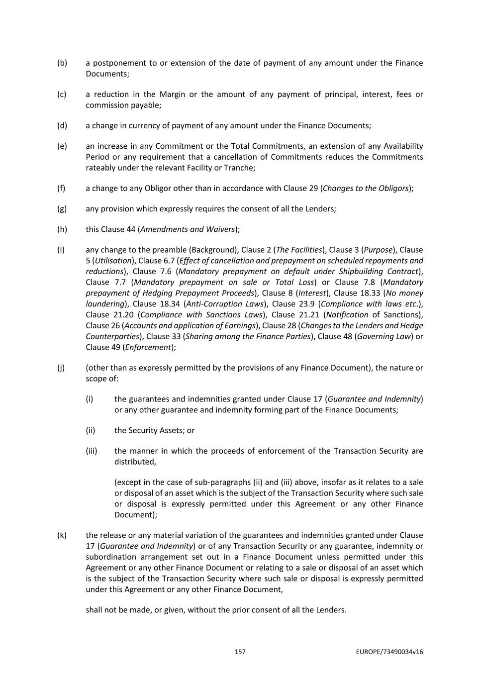 157 EUROPE/73490034v16 (b) a postponement to or extension of the date of payment of any amount under the Finance Documents; (c) a reduction in the Margin or the amount of any payment of principal, interest, fees or commission payable; (d) a change in currency of payment of any amount under the Finance Documents; (e) an increase in any Commitment or the Total Commitments, an extension of any Availability Period or any requirement that a cancellation of Commitments reduces the Commitments rateably under the relevant Facility or Tranche; (f) a change to any Obligor other than in accordance with Clause 29 (Changes to the Obligors); (g) any provision which expressly requires the consent of all the Lenders; (h) this Clause 44 (Amendments and Waivers); (i) any change to the preamble (Background), Clause 2 (The Facilities), Clause 3 (Purpose), Clause 5 (Utilisation), Clause 6.7 (Effect of cancellation and prepayment on scheduled repayments and reductions), Clause 7.6 (Mandatory prepayment on default under Shipbuilding Contract), Clause 7.7 (Mandatory prepayment on sale or Total Loss) or Clause 7.8 (Mandatory prepayment of Hedging Prepayment Proceeds), Clause 8 (Interest), Clause 18.33 (No money laundering), Clause 18.34 (Anti-Corruption Laws), Clause 23.9 (Compliance with laws etc.), Clause 21.20 (Compliance with Sanctions Laws), Clause 21.21 (Notification of Sanctions), Clause 26 (Accounts and application of Earnings), Clause 28 (Changes to the Lenders and Hedge Counterparties), Clause 33 (Sharing among the Finance Parties), Clause 48 (Governing Law) or Clause 49 (Enforcement); (j) (other than as expressly permitted by the provisions of any Finance Document), the nature or scope of: (i) the guarantees and indemnities granted under Clause 17 (Guarantee and Indemnity) or any other guarantee and indemnity forming part of the Finance Documents; (ii) the Security Assets; or (iii) the manner in which the proceeds of enforcement of the Transaction Security are distributed, (except in the case of sub-paragraphs (ii) and (iii) above, insofar as it relates to a sale or disposal of an asset which is the subject of the Transaction Security where such sale or disposal is expressly permitted under this Agreement or any other Finance Document); (k) the release or any material variation of the guarantees and indemnities granted under Clause 17 (Guarantee and Indemnity) or of any Transaction Security or any guarantee, indemnity or subordination arrangement set out in a Finance Document unless permitted under this Agreement or any other Finance Document or relating to a sale or disposal of an asset which is the subject of the Transaction Security where such sale or disposal is expressly permitted under this Agreement or any other Finance Document, shall not be made, or given, without the prior consent of all the Lenders.