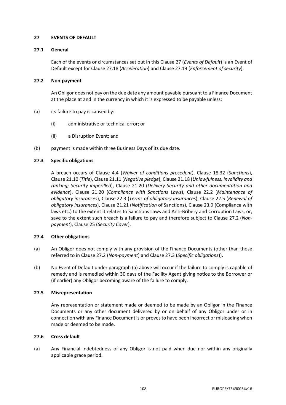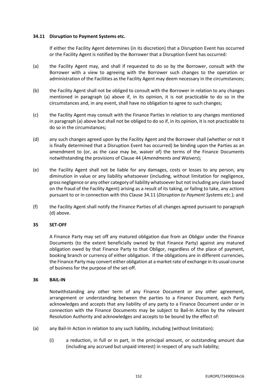 152 EUROPE/73490034v16 34.11 Disruption to Payment Systems etc. If either the Facility Agent determines (in its discretion) that a Disruption Event has occurred or the Facility Agent is notified by the Borrower that a Disruption Event has occurred: (a) the Facility Agent may, and shall if requested to do so by the Borrower, consult with the Borrower with a view to agreeing with the Borrower such changes to the operation or administration of the Facilities as the Facility Agent may deem necessary in the circumstances; (b) the Facility Agent shall not be obliged to consult with the Borrower in relation to any changes mentioned in paragraph (a) above if, in its opinion, it is not practicable to do so in the circumstances and, in any event, shall have no obligation to agree to such changes; (c) the Facility Agent may consult with the Finance Parties in relation to any changes mentioned in paragraph (a) above but shall not be obliged to do so if, in its opinion, it is not practicable to do so in the circumstances; (d) any such changes agreed upon by the Facility Agent and the Borrower shall (whether or not it is finally determined that a Disruption Event has occurred) be binding upon the Parties as an amendment to (or, as the case may be, waiver of) the terms of the Finance Documents notwithstanding the provisions of Clause 44 (Amendments and Waivers); (e) the Facility Agent shall not be liable for any damages, costs or losses to any person, any diminution in value or any liability whatsoever (including, without limitation for negligence, gross negligence or any other category of liability whatsoever but not including any claim based on the fraud of the Facility Agent) arising as a result of its taking, or failing to take, any actions pursuant to or in connection with this Clause 34.11 (Disruption to Payment Systems etc.); and (f) the Facility Agent shall notify the Finance Parties of all changes agreed pursuant to paragraph (d) above. 35 SET-OFF A Finance Party may set off any matured obligation due from an Obligor under the Finance Documents (to the extent beneficially owned by that Finance Party) against any matured obligation owed by that Finance Party to that Obligor, regardless of the place of payment, booking branch or currency of either obligation. If the obligations are in different currencies, the Finance Party may convert either obligation at a market rate of exchange in its usual course of business for the purpose of the set-off. 36 BAIL-IN Notwithstanding any other term of any Finance Document or any other agreement, arrangement or understanding between the parties to a Finance Document, each Party acknowledges and accepts that any liability of any party to a Finance Document under or in connection with the Finance Documents may be subject to Bail-In Action by the relevant Resolution Authority and acknowledges and accepts to be bound by the effect of: (a) any Bail-In Action in relation to any such liability, including (without limitation): (i) a reduction, in full or in part, in the principal amount, or outstanding amount due (including any accrued but unpaid interest) in respect of any such liability;