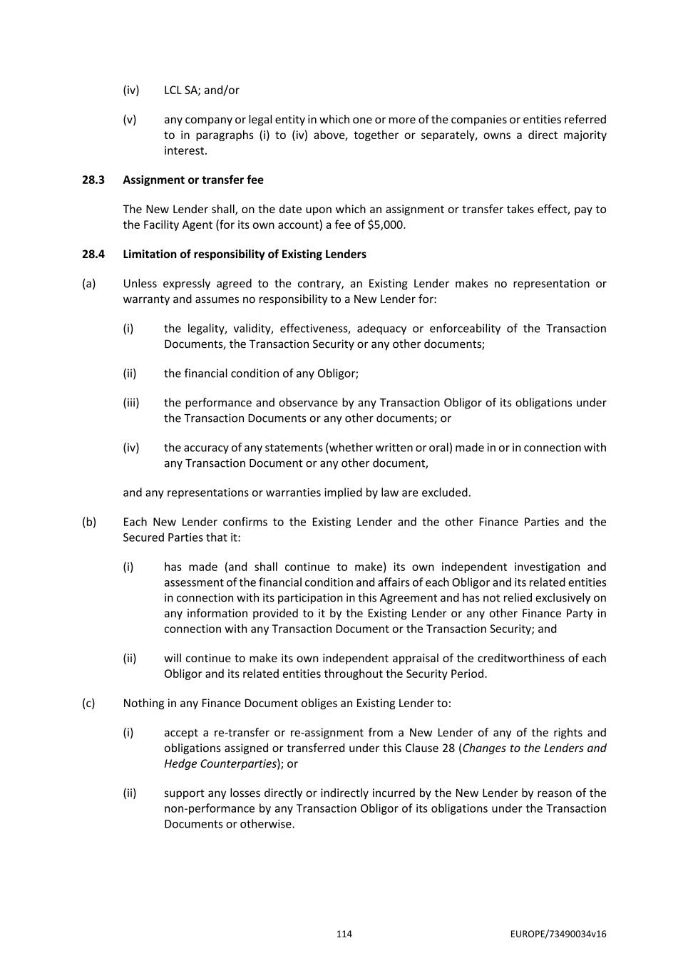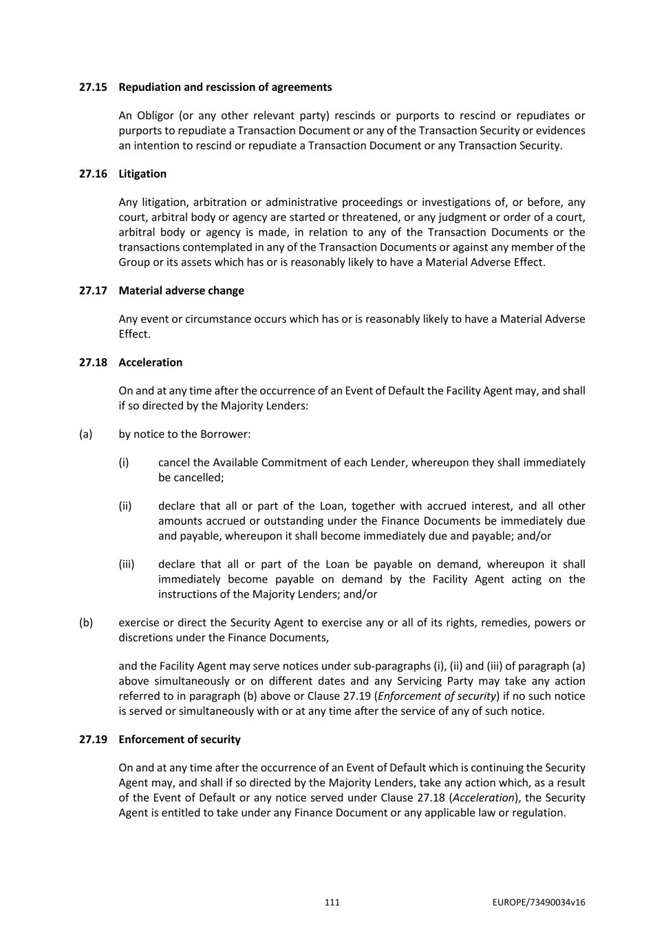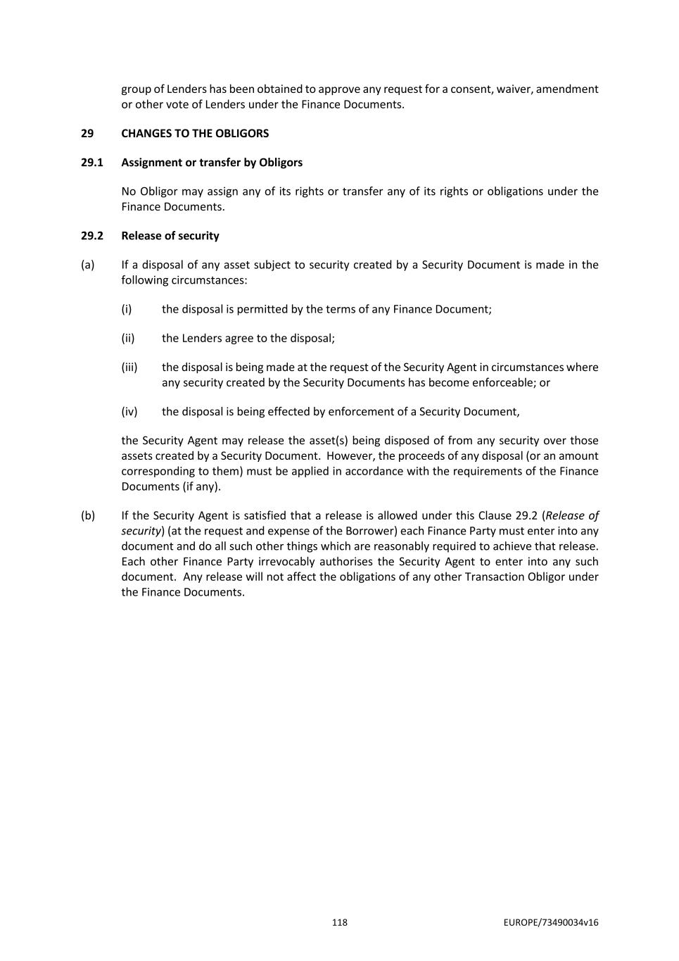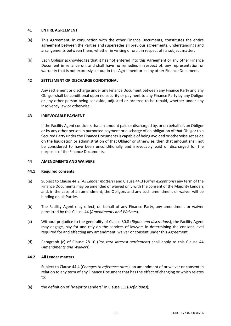156 EUROPE/73490034v16 41 ENTIRE AGREEMENT (a) This Agreement, in conjunction with the other Finance Documents, constitutes the entire agreement between the Parties and supersedes all previous agreements, understandings and arrangements between them, whether in writing or oral, in respect of its subject matter. (b) Each Obligor acknowledges that it has not entered into this Agreement or any other Finance Document in reliance on, and shall have no remedies in respect of, any representation or warranty that is not expressly set out in this Agreement or in any other Finance Document. 42 SETTLEMENT OR DISCHARGE CONDITIONAL Any settlement or discharge under any Finance Document between any Finance Party and any Obligor shall be conditional upon no security or payment to any Finance Party by any Obligor or any other person being set aside, adjusted or ordered to be repaid, whether under any insolvency law or otherwise. 43 IRREVOCABLE PAYMENT If the Facility Agent considers that an amount paid or discharged by, or on behalf of, an Obligor or by any other person in purported payment or discharge of an obligation of that Obligor to a Secured Party under the Finance Documents is capable of being avoided or otherwise set aside on the liquidation or administration of that Obligor or otherwise, then that amount shall not be considered to have been unconditionally and irrevocably paid or discharged for the purposes of the Finance Documents. 44 AMENDMENTS AND WAIVERS 44.1 Required consents (a) Subject to Clause 44.2 (All Lender matters) and Clause 44.3 (Other exceptions) any term of the Finance Documents may be amended or waived only with the consent of the Majority Lenders and, in the case of an amendment, the Obligors and any such amendment or waiver will be binding on all Parties. (b) The Facility Agent may effect, on behalf of any Finance Party, any amendment or waiver permitted by this Clause 44 (Amendments and Waivers). (c) Without prejudice to the generality of Clause 30.8 (Rights and discretions), the Facility Agent may engage, pay for and rely on the services of lawyers in determining the consent level required for and effecting any amendment, waiver or consent under this Agreement. (d) Paragraph (c) of Clause 28.10 (Pro rata interest settlement) shall apply to this Clause 44 (Amendments and Waivers). 44.2 All Lender matters Subject to Clause 44.4 (Changes to reference rates), an amendment of or waiver or consent in relation to any term of any Finance Document that has the effect of changing or which relates to: (a) the definition of "Majority Lenders" in Clause 1.1 (Definitions);