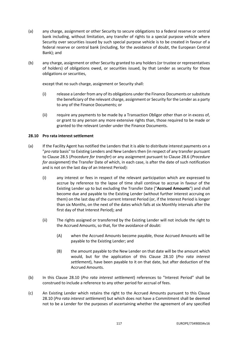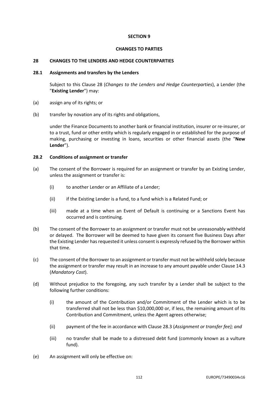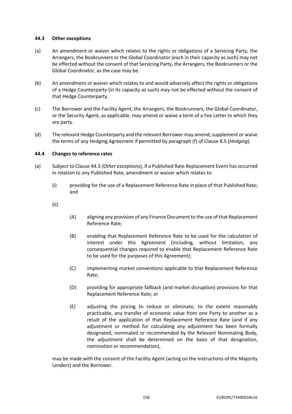 158 EUROPE/73490034v16 44.3 Other exceptions (a) An amendment or waiver which relates to the rights or obligations of a Servicing Party, the Arrangers, the Bookrunners or the Global Coordinator (each in their capacity as such) may not be effected without the consent of that Servicing Party, the Arrangers, the Bookrunners or the Global Coordinator, as the case may be. (b) An amendment or waiver which relates to and would adversely affect the rights or obligations of a Hedge Counterparty (in its capacity as such) may not be effected without the consent of that Hedge Counterparty. (c) The Borrower and the Facility Agent, the Arrangers, the Bookrunners, the Global Coordinator, or the Security Agent, as applicable, may amend or waive a term of a Fee Letter to which they are party. (d) The relevant Hedge Counterparty and the relevant Borrower may amend, supplement or waive the terms of any Hedging Agreement if permitted by paragraph (f) of Clause 8.5 (Hedging). 44.4 Changes to reference rates (a) Subject to Clause 44.3 (Other exceptions), if a Published Rate Replacement Event has occurred in relation to any Published Rate, amendment or waiver which relates to: (i) providing for the use of a Replacement Reference Rate in place of that Published Rate; and (ii) (A) aligning any provision of any Finance Document to the use of that Replacement Reference Rate; (B) enabling that Replacement Reference Rate to be used for the calculation of interest under this Agreement (including, without limitation, any consequential changes required to enable that Replacement Reference Rate to be used for the purposes of this Agreement); (C) implementing market conventions applicable to that Replacement Reference Rate; (D) providing for appropriate fallback (and market disruption) provisions for that Replacement Reference Rate; or (E) adjusting the pricing to reduce or eliminate, to the extent reasonably practicable, any transfer of economic value from one Party to another as a result of the application of that Replacement Reference Rate (and if any adjustment or method for calculating any adjustment has been formally designated, nominated or recommended by the Relevant Nominating Body, the adjustment shall be determined on the basis of that designation, nomination or recommendation), may be made with the consent of the Facility Agent (acting on the instructions of the Majority Lenders) and the Borrower.