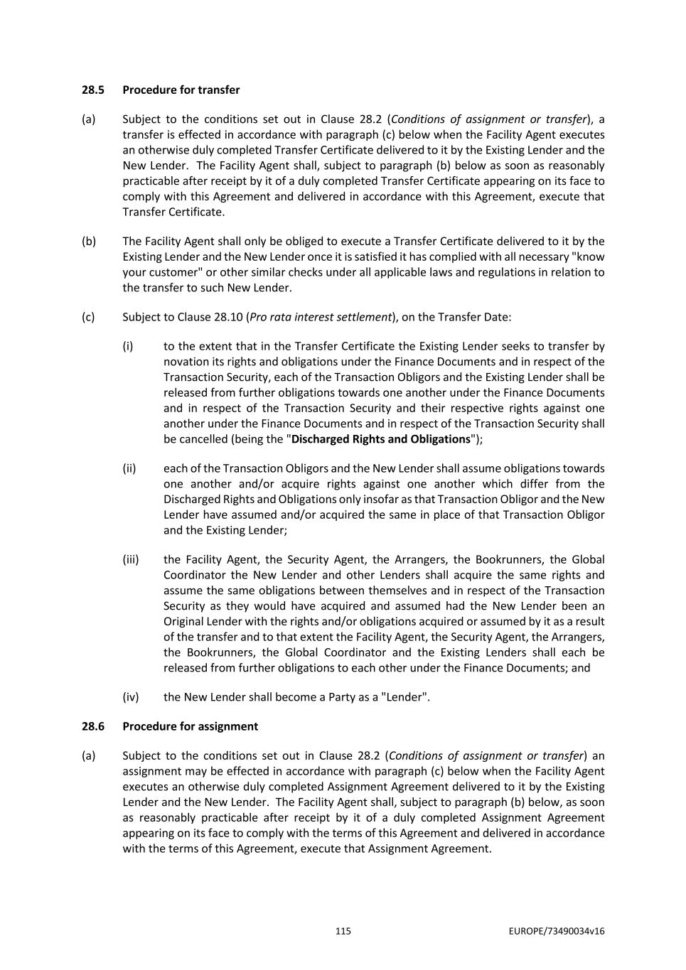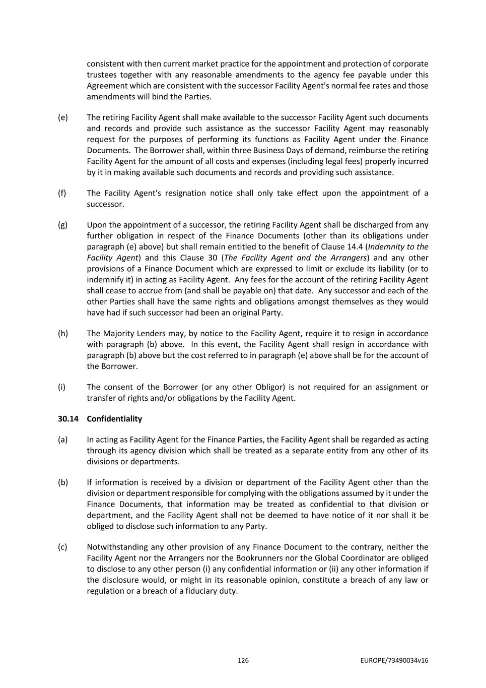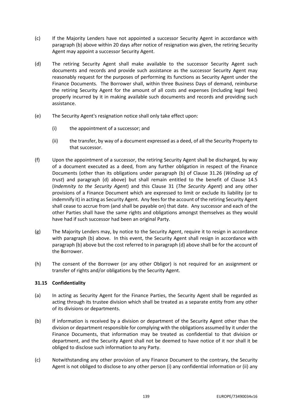 139 EUROPE/73490034v16 (c) If the Majority Lenders have not appointed a successor Security Agent in accordance with paragraph (b) above within 20 days after notice of resignation was given, the retiring Security Agent may appoint a successor Security Agent. (d) The retiring Security Agent shall make available to the successor Security Agent such documents and records and provide such assistance as the successor Security Agent may reasonably request for the purposes of performing its functions as Security Agent under the Finance Documents. The Borrower shall, within three Business Days of demand, reimburse the retiring Security Agent for the amount of all costs and expenses (including legal fees) properly incurred by it in making available such documents and records and providing such assistance. (e) The Security Agent's resignation notice shall only take effect upon: (i) the appointment of a successor; and (ii) the transfer, by way of a document expressed as a deed, of all the Security Property to that successor. (f) Upon the appointment of a successor, the retiring Security Agent shall be discharged, by way of a document executed as a deed, from any further obligation in respect of the Finance Documents (other than its obligations under paragraph (b) of Clause 31.26 (Winding up of trust) and paragraph (d) above) but shall remain entitled to the benefit of Clause 14.5 (Indemnity to the Security Agent) and this Clause 31 (The Security Agent) and any other provisions of a Finance Document which are expressed to limit or exclude its liability (or to indemnify it) in acting as Security Agent. Any fees for the account of the retiring Security Agent shall cease to accrue from (and shall be payable on) that date. Any successor and each of the other Parties shall have the same rights and obligations amongst themselves as they would have had if such successor had been an original Party. (g) The Majority Lenders may, by notice to the Security Agent, require it to resign in accordance with paragraph (b) above. In this event, the Security Agent shall resign in accordance with paragraph (b) above but the cost referred to in paragraph (d) above shall be for the account of the Borrower. (h) The consent of the Borrower (or any other Obligor) is not required for an assignment or transfer of rights and/or obligations by the Security Agent. 31.15 Confidentiality (a) In acting as Security Agent for the Finance Parties, the Security Agent shall be regarded as acting through its trustee division which shall be treated as a separate entity from any other of its divisions or departments. (b) If information is received by a division or department of the Security Agent other than the division or department responsible for complying with the obligations assumed by it under the Finance Documents, that information may be treated as confidential to that division or department, and the Security Agent shall not be deemed to have notice of it nor shall it be obliged to disclose such information to any Party. (c) Notwithstanding any other provision of any Finance Document to the contrary, the Security Agent is not obliged to disclose to any other person (i) any confidential information or (ii) any