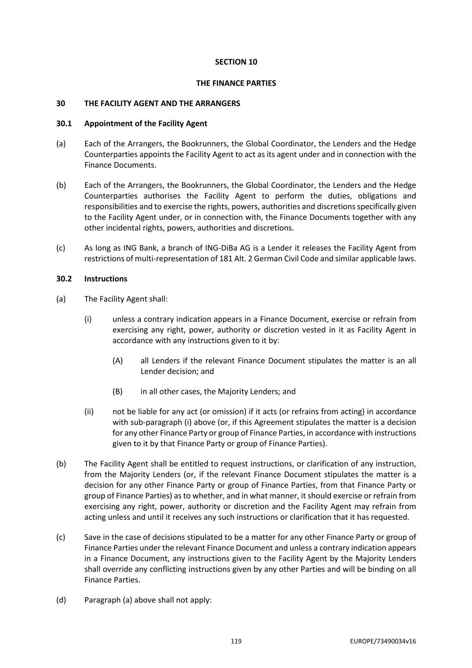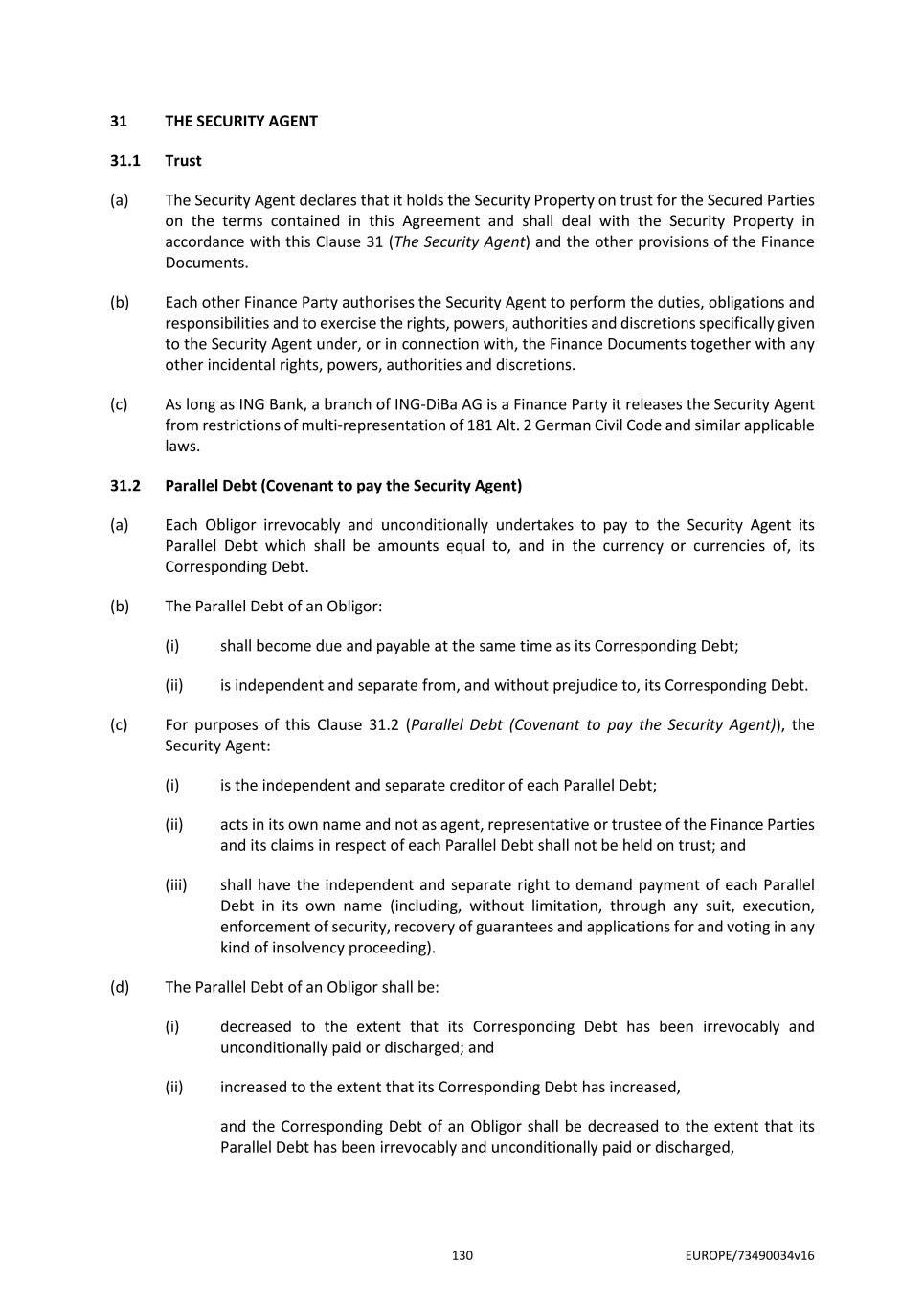 130 EUROPE/73490034v16 31 THE SECURITY AGENT 31.1 Trust (a) The Security Agent declares that it holds the Security Property on trust for the Secured Parties on the terms contained in this Agreement and shall deal with the Security Property in accordance with this Clause 31 (The Security Agent) and the other provisions of the Finance Documents. (b) Each other Finance Party authorises the Security Agent to perform the duties, obligations and responsibilities and to exercise the rights, powers, authorities and discretions specifically given to the Security Agent under, or in connection with, the Finance Documents together with any other incidental rights, powers, authorities and discretions. (c) As long as ING Bank, a branch of ING-DiBa AG is a Finance Party it releases the Security Agent from restrictions of multi-representation of 181 Alt. 2 German Civil Code and similar applicable laws. 31.2 Parallel Debt (Covenant to pay the Security Agent) (a) Each Obligor irrevocably and unconditionally undertakes to pay to the Security Agent its Parallel Debt which shall be amounts equal to, and in the currency or currencies of, its Corresponding Debt. (b) The Parallel Debt of an Obligor: (i) shall become due and payable at the same time as its Corresponding Debt; (ii) is independent and separate from, and without prejudice to, its Corresponding Debt. (c) For purposes of this Clause 31.2 (Parallel Debt (Covenant to pay the Security Agent)), the Security Agent: (i) is the independent and separate creditor of each Parallel Debt; (ii) acts in its own name and not as agent, representative or trustee of the Finance Parties and its claims in respect of each Parallel Debt shall not be held on trust; and (iii) shall have the independent and separate right to demand payment of each Parallel Debt in its own name (including, without limitation, through any suit, execution, enforcement of security, recovery of guarantees and applications for and voting in any kind of insolvency proceeding). (d) The Parallel Debt of an Obligor shall be: (i) decreased to the extent that its Corresponding Debt has been irrevocably and unconditionally paid or discharged; and (ii) increased to the extent that its Corresponding Debt has increased, and the Corresponding Debt of an Obligor shall be decreased to the extent that its Parallel Debt has been irrevocably and unconditionally paid or discharged,
