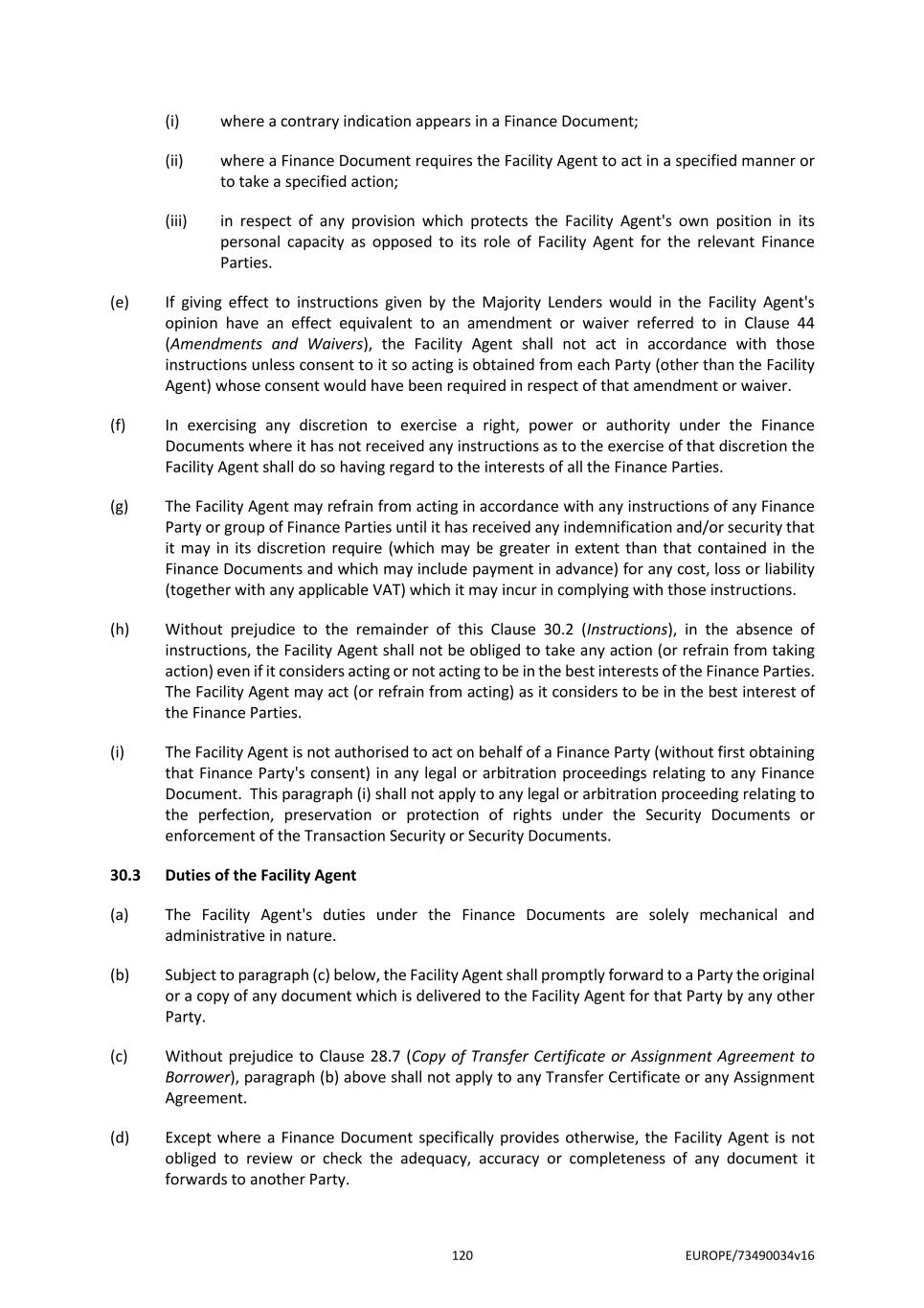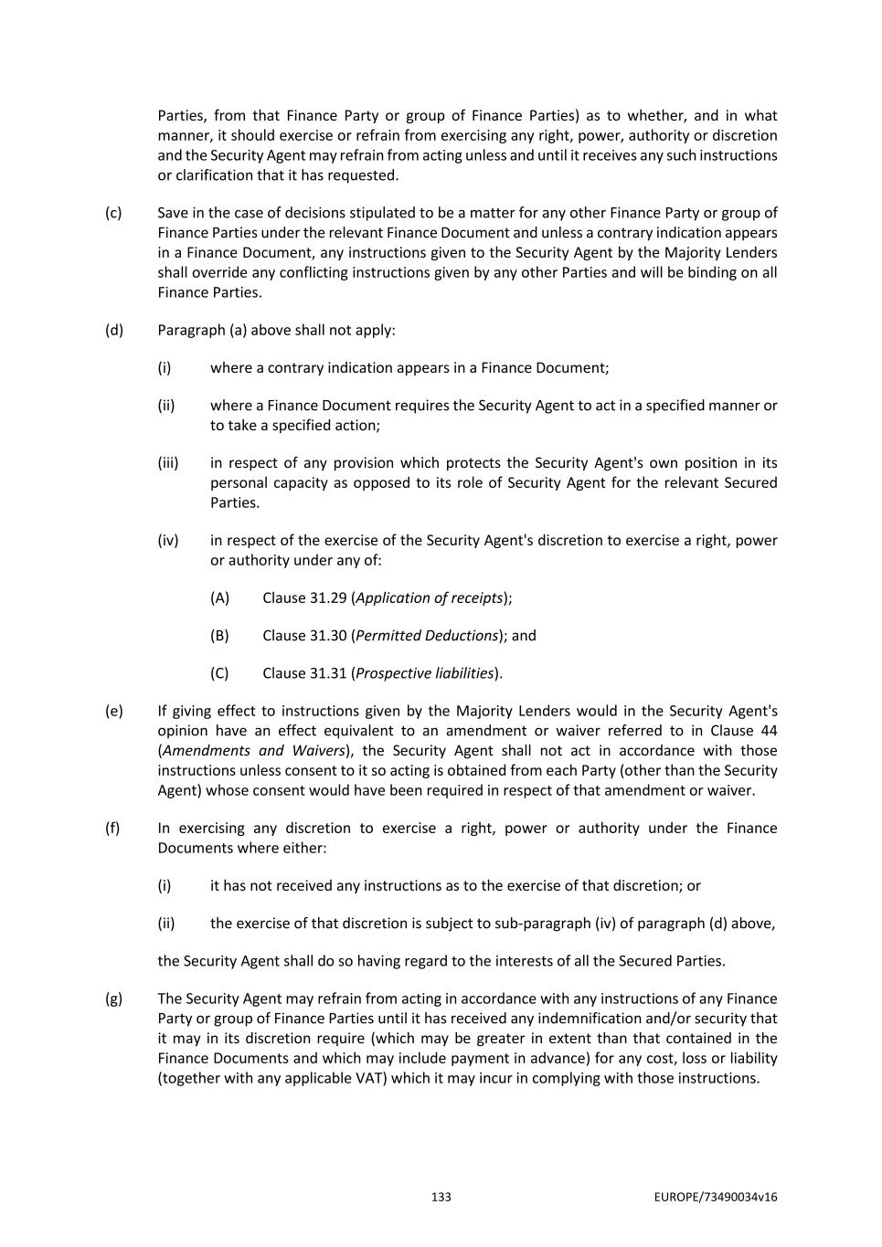 133 EUROPE/73490034v16 Parties, from that Finance Party or group of Finance Parties) as to whether, and in what manner, it should exercise or refrain from exercising any right, power, authority or discretion and the Security Agent may refrain from acting unless and until it receives any such instructions or clarification that it has requested. (c) Save in the case of decisions stipulated to be a matter for any other Finance Party or group of Finance Parties under the relevant Finance Document and unless a contrary indication appears in a Finance Document, any instructions given to the Security Agent by the Majority Lenders shall override any conflicting instructions given by any other Parties and will be binding on all Finance Parties. (d) Paragraph (a) above shall not apply: (i) where a contrary indication appears in a Finance Document; (ii) where a Finance Document requires the Security Agent to act in a specified manner or to take a specified action; (iii) in respect of any provision which protects the Security Agent's own position in its personal capacity as opposed to its role of Security Agent for the relevant Secured Parties. (iv) in respect of the exercise of the Security Agent's discretion to exercise a right, power or authority under any of: (A) Clause 31.29 (Application of receipts); (B) Clause 31.30 (Permitted Deductions); and (C) Clause 31.31 (Prospective liabilities). (e) If giving effect to instructions given by the Majority Lenders would in the Security Agent's opinion have an effect equivalent to an amendment or waiver referred to in Clause 44 (Amendments and Waivers), the Security Agent shall not act in accordance with those instructions unless consent to it so acting is obtained from each Party (other than the Security Agent) whose consent would have been required in respect of that amendment or waiver. (f) In exercising any discretion to exercise a right, power or authority under the Finance Documents where either: (i) it has not received any instructions as to the exercise of that discretion; or (ii) the exercise of that discretion is subject to sub-paragraph (iv) of paragraph (d) above, the Security Agent shall do so having regard to the interests of all the Secured Parties. (g) The Security Agent may refrain from acting in accordance with any instructions of any Finance Party or group of Finance Parties until it has received any indemnification and/or security that it may in its discretion require (which may be greater in extent than that contained in the Finance Documents and which may include payment in advance) for any cost, loss or liability (together with any applicable VAT) which it may incur in complying with those instructions.