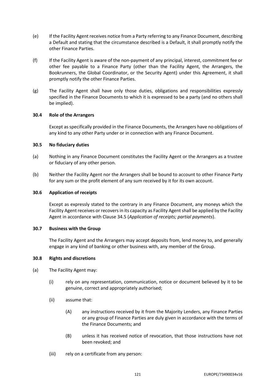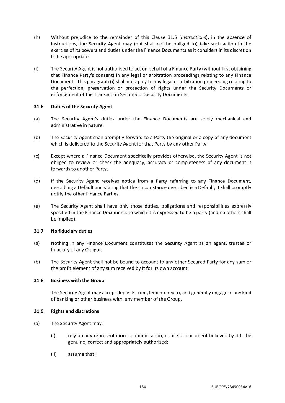 134 EUROPE/73490034v16 (h) Without prejudice to the remainder of this Clause 31.5 (Instructions), in the absence of instructions, the Security Agent may (but shall not be obliged to) take such action in the exercise of its powers and duties under the Finance Documents as it considers in its discretion to be appropriate. (i) The Security Agent is not authorised to act on behalf of a Finance Party (without first obtaining that Finance Party's consent) in any legal or arbitration proceedings relating to any Finance Document. This paragraph (i) shall not apply to any legal or arbitration proceeding relating to the perfection, preservation or protection of rights under the Security Documents or enforcement of the Transaction Security or Security Documents. 31.6 Duties of the Security Agent (a) The Security Agent's duties under the Finance Documents are solely mechanical and administrative in nature. (b) The Security Agent shall promptly forward to a Party the original or a copy of any document which is delivered to the Security Agent for that Party by any other Party. (c) Except where a Finance Document specifically provides otherwise, the Security Agent is not obliged to review or check the adequacy, accuracy or completeness of any document it forwards to another Party. (d) If the Security Agent receives notice from a Party referring to any Finance Document, describing a Default and stating that the circumstance described is a Default, it shall promptly notify the other Finance Parties. (e) The Security Agent shall have only those duties, obligations and responsibilities expressly specified in the Finance Documents to which it is expressed to be a party (and no others shall be implied). 31.7 No fiduciary duties (a) Nothing in any Finance Document constitutes the Security Agent as an agent, trustee or fiduciary of any Obligor. (b) The Security Agent shall not be bound to account to any other Secured Party for any sum or the profit element of any sum received by it for its own account. 31.8 Business with the Group The Security Agent may accept deposits from, lend money to, and generally engage in any kind of banking or other business with, any member of the Group. 31.9 Rights and discretions (a) The Security Agent may: (i) rely on any representation, communication, notice or document believed by it to be genuine, correct and appropriately authorised; (ii) assume that: