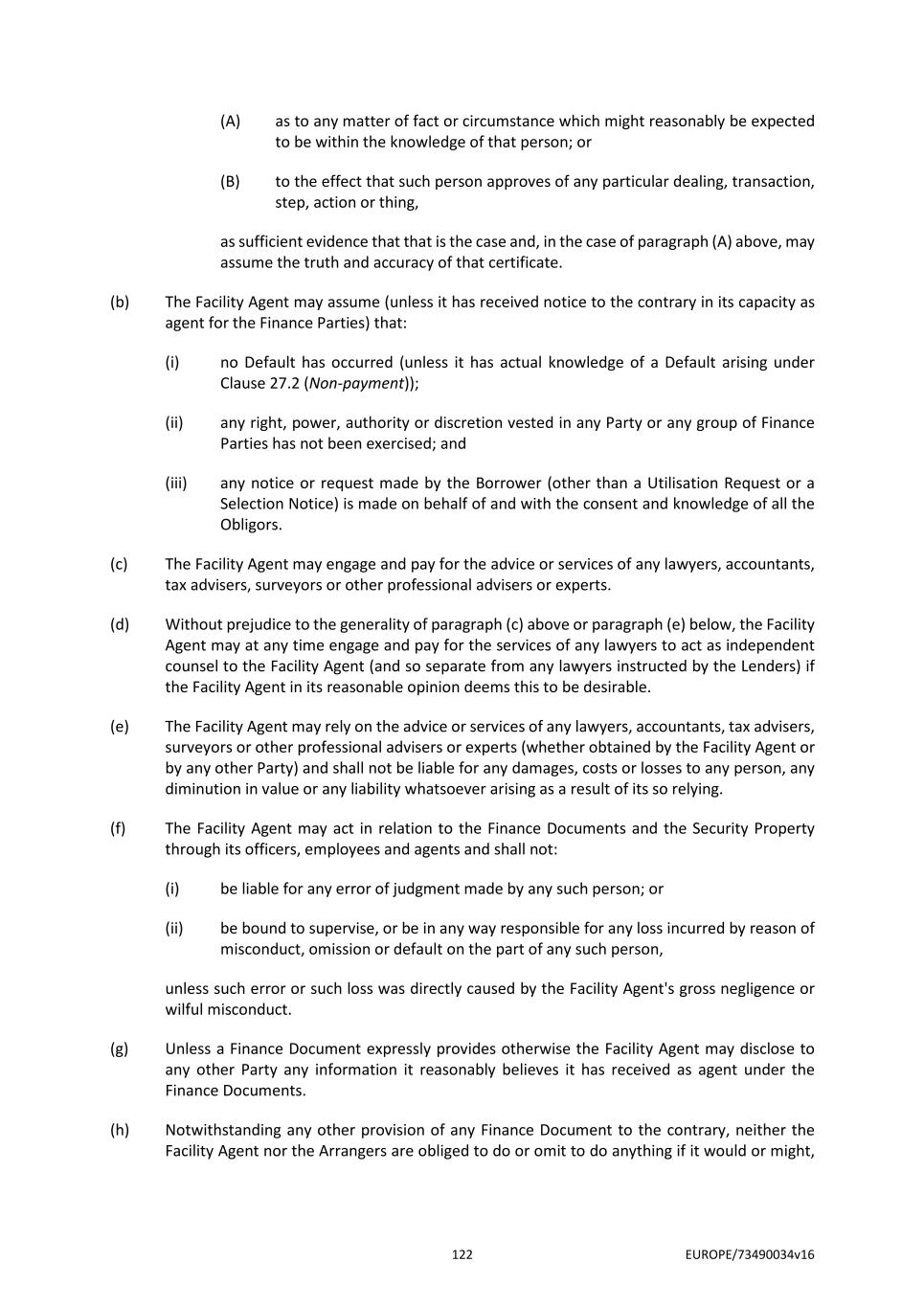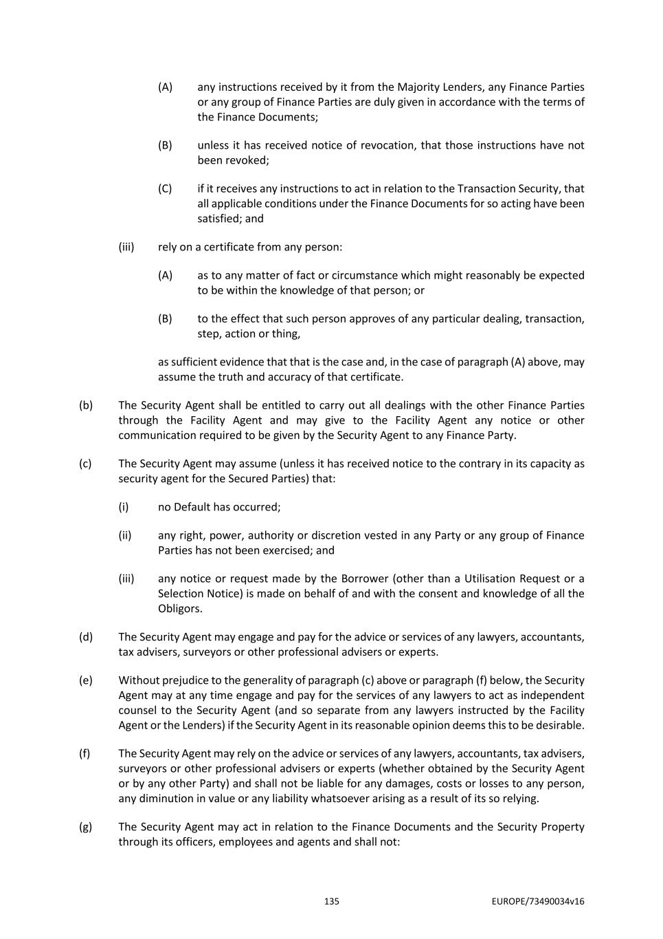 135 EUROPE/73490034v16 (A) any instructions received by it from the Majority Lenders, any Finance Parties or any group of Finance Parties are duly given in accordance with the terms of the Finance Documents; (B) unless it has received notice of revocation, that those instructions have not been revoked; (C) if it receives any instructions to act in relation to the Transaction Security, that all applicable conditions under the Finance Documents for so acting have been satisfied; and (iii) rely on a certificate from any person: (A) as to any matter of fact or circumstance which might reasonably be expected to be within the knowledge of that person; or (B) to the effect that such person approves of any particular dealing, transaction, step, action or thing, as sufficient evidence that that is the case and, in the case of paragraph (A) above, may assume the truth and accuracy of that certificate. (b) The Security Agent shall be entitled to carry out all dealings with the other Finance Parties through the Facility Agent and may give to the Facility Agent any notice or other communication required to be given by the Security Agent to any Finance Party. (c) The Security Agent may assume (unless it has received notice to the contrary in its capacity as security agent for the Secured Parties) that: (i) no Default has occurred; (ii) any right, power, authority or discretion vested in any Party or any group of Finance Parties has not been exercised; and (iii) any notice or request made by the Borrower (other than a Utilisation Request or a Selection Notice) is made on behalf of and with the consent and knowledge of all the Obligors. (d) The Security Agent may engage and pay for the advice or services of any lawyers, accountants, tax advisers, surveyors or other professional advisers or experts. (e) Without prejudice to the generality of paragraph (c) above or paragraph (f) below, the Security Agent may at any time engage and pay for the services of any lawyers to act as independent counsel to the Security Agent (and so separate from any lawyers instructed by the Facility Agent or the Lenders) if the Security Agent in its reasonable opinion deems this to be desirable. (f) The Security Agent may rely on the advice or services of any lawyers, accountants, tax advisers, surveyors or other professional advisers or experts (whether obtained by the Security Agent or by any other Party) and shall not be liable for any damages, costs or losses to any person, any diminution in value or any liability whatsoever arising as a result of its so relying. (g) The Security Agent may act in relation to the Finance Documents and the Security Property through its officers, employees and agents and shall not: