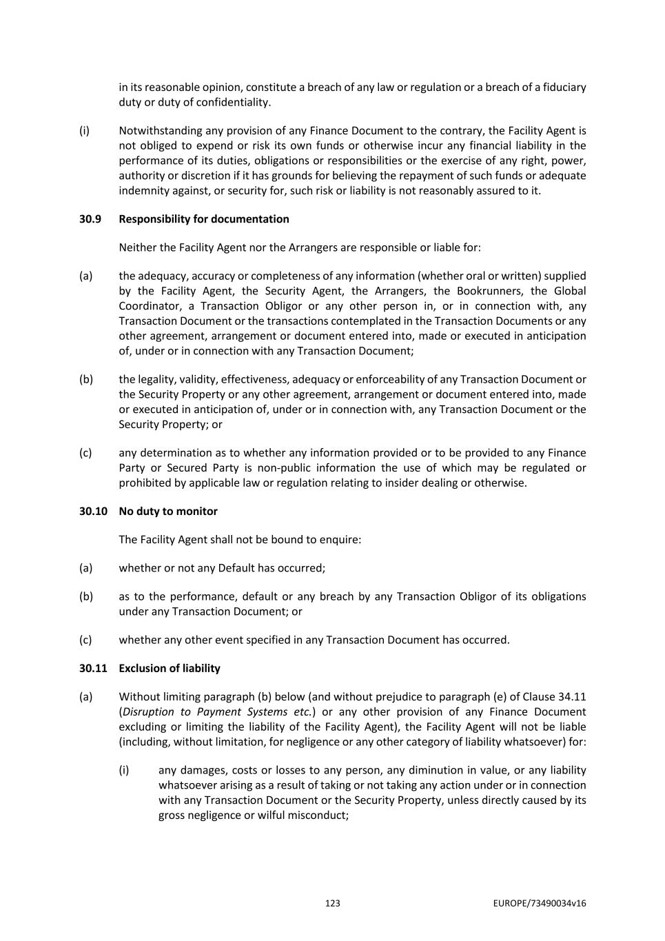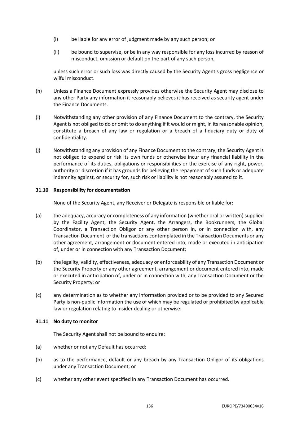 136 EUROPE/73490034v16 (i) be liable for any error of judgment made by any such person; or (ii) be bound to supervise, or be in any way responsible for any loss incurred by reason of misconduct, omission or default on the part of any such person, unless such error or such loss was directly caused by the Security Agent's gross negligence or wilful misconduct. (h) Unless a Finance Document expressly provides otherwise the Security Agent may disclose to any other Party any information it reasonably believes it has received as security agent under the Finance Documents. (i) Notwithstanding any other provision of any Finance Document to the contrary, the Security Agent is not obliged to do or omit to do anything if it would or might, in its reasonable opinion, constitute a breach of any law or regulation or a breach of a fiduciary duty or duty of confidentiality. (j) Notwithstanding any provision of any Finance Document to the contrary, the Security Agent is not obliged to expend or risk its own funds or otherwise incur any financial liability in the performance of its duties, obligations or responsibilities or the exercise of any right, power, authority or discretion if it has grounds for believing the repayment of such funds or adequate indemnity against, or security for, such risk or liability is not reasonably assured to it. 31.10 Responsibility for documentation None of the Security Agent, any Receiver or Delegate is responsible or liable for: (a) the adequacy, accuracy or completeness of any information (whether oral or written) supplied by the Facility Agent, the Security Agent, the Arrangers, the Bookrunners, the Global Coordinator, a Transaction Obligor or any other person in, or in connection with, any Transaction Document or the transactions contemplated in the Transaction Documents or any other agreement, arrangement or document entered into, made or executed in anticipation of, under or in connection with any Transaction Document; (b) the legality, validity, effectiveness, adequacy or enforceability of any Transaction Document or the Security Property or any other agreement, arrangement or document entered into, made or executed in anticipation of, under or in connection with, any Transaction Document or the Security Property; or (c) any determination as to whether any information provided or to be provided to any Secured Party is non-public information the use of which may be regulated or prohibited by applicable law or regulation relating to insider dealing or otherwise. 31.11 No duty to monitor The Security Agent shall not be bound to enquire: (a) whether or not any Default has occurred; (b) as to the performance, default or any breach by any Transaction Obligor of its obligations under any Transaction Document; or (c) whether any other event specified in any Transaction Document has occurred.