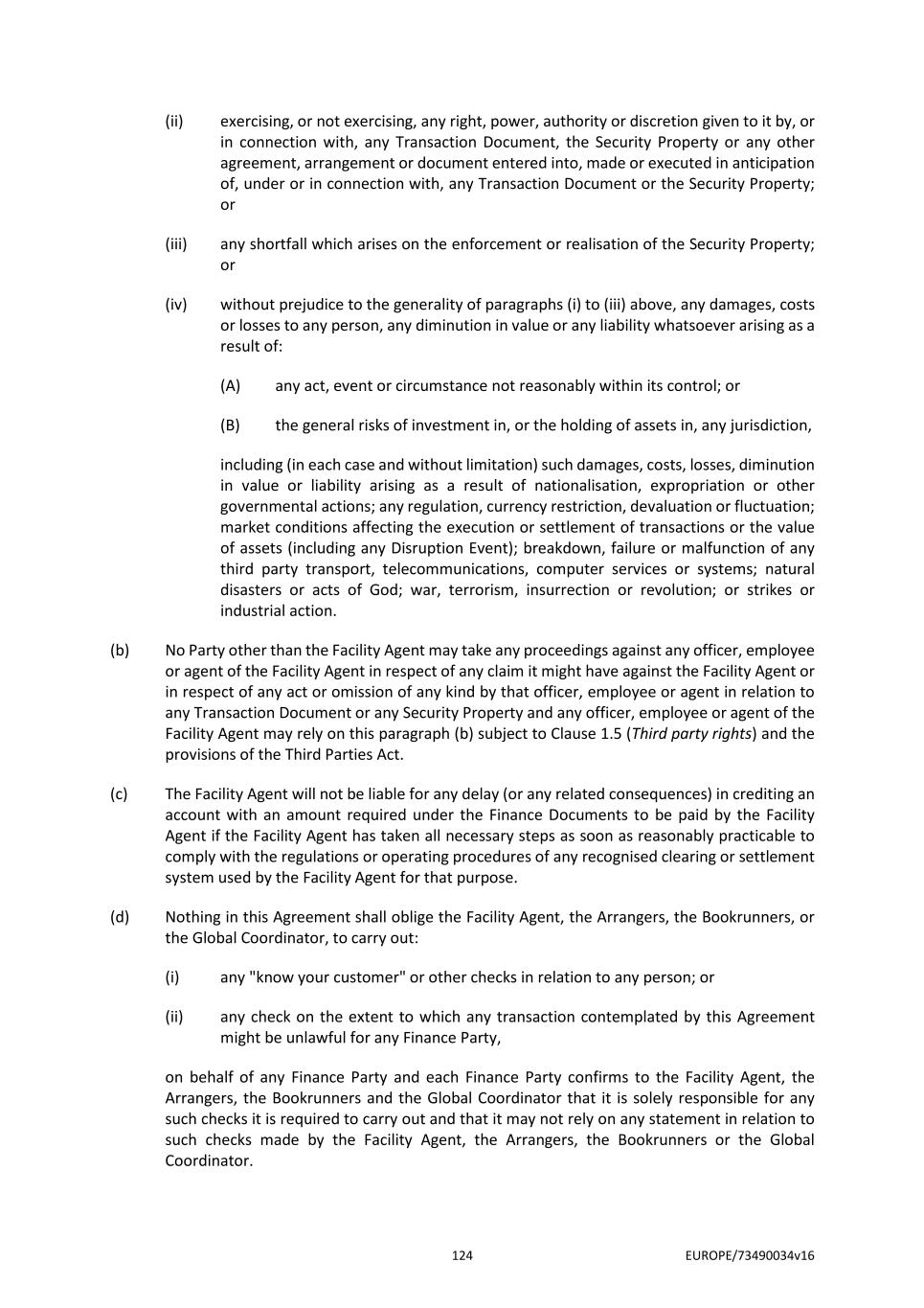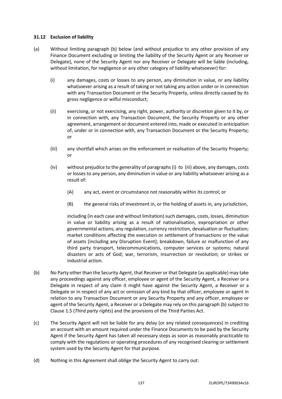 137 EUROPE/73490034v16 31.12 Exclusion of liability (a) Without limiting paragraph (b) below (and without prejudice to any other provision of any Finance Document excluding or limiting the liability of the Security Agent or any Receiver or Delegate), none of the Security Agent nor any Receiver or Delegate will be liable (including, without limitation, for negligence or any other category of liability whatsoever) for: (i) any damages, costs or losses to any person, any diminution in value, or any liability whatsoever arising as a result of taking or not taking any action under or in connection with any Transaction Document or the Security Property, unless directly caused by its gross negligence or wilful misconduct; (ii) exercising, or not exercising, any right, power, authority or discretion given to it by, or in connection with, any Transaction Document, the Security Property or any other agreement, arrangement or document entered into, made or executed in anticipation of, under or in connection with, any Transaction Document or the Security Property; or (iii) any shortfall which arises on the enforcement or realisation of the Security Property; or (iv) without prejudice to the generality of paragraphs (i) to (iii) above, any damages, costs or losses to any person, any diminution in value or any liability whatsoever arising as a result of: (A) any act, event or circumstance not reasonably within its control; or (B) the general risks of investment in, or the holding of assets in, any jurisdiction, including (in each case and without limitation) such damages, costs, losses, diminution in value or liability arising as a result of nationalisation, expropriation or other governmental actions; any regulation, currency restriction, devaluation or fluctuation; market conditions affecting the execution or settlement of transactions or the value of assets (including any Disruption Event); breakdown, failure or malfunction of any third party transport, telecommunications, computer services or systems; natural disasters or acts of God; war, terrorism, insurrection or revolution; or strikes or industrial action. (b) No Party other than the Security Agent, that Receiver or that Delegate (as applicable) may take any proceedings against any officer, employee or agent of the Security Agent, a Receiver or a Delegate in respect of any claim it might have against the Security Agent, a Receiver or a Delegate or in respect of any act or omission of any kind by that officer, employee or agent in relation to any Transaction Document or any Security Property and any officer, employee or agent of the Security Agent, a Receiver or a Delegate may rely on this paragraph (b) subject to Clause 1.5 (Third party rights) and the provisions of the Third Parties Act. (c) The Security Agent will not be liable for any delay (or any related consequences) in crediting an account with an amount required under the Finance Documents to be paid by the Security Agent if the Security Agent has taken all necessary steps as soon as reasonably practicable to comply with the regulations or operating procedures of any recognised clearing or settlement system used by the Security Agent for that purpose. (d) Nothing in this Agreement shall oblige the Security Agent to carry out: