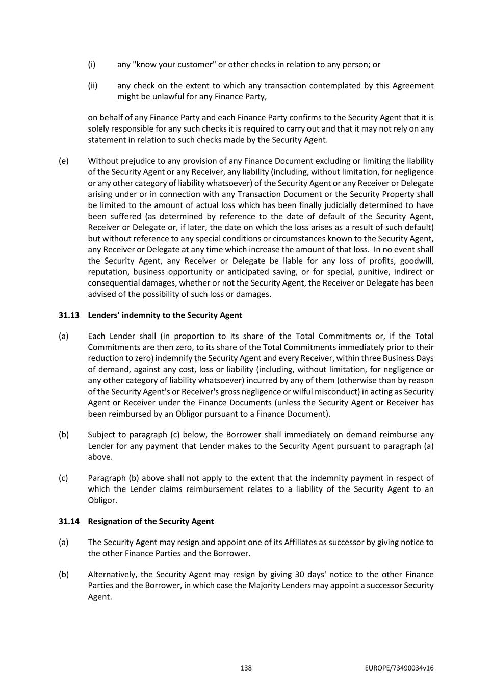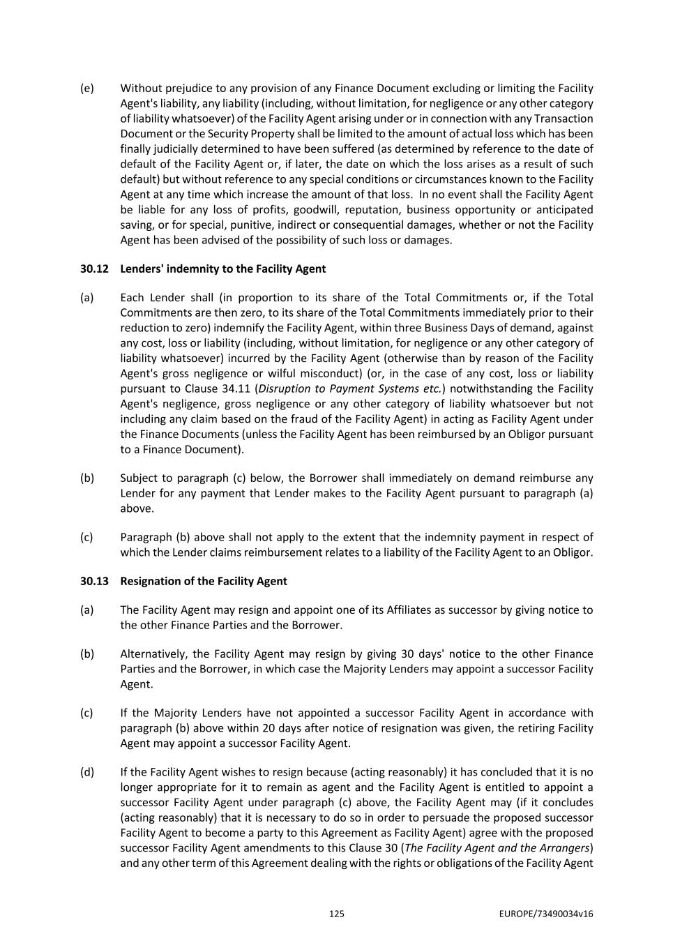 138 EUROPE/73490034v16 (i) any "know your customer" or other checks in relation to any person; or (ii) any check on the extent to which any transaction contemplated by this Agreement might be unlawful for any Finance Party, on behalf of any Finance Party and each Finance Party confirms to the Security Agent that it is solely responsible for any such checks it is required to carry out and that it may not rely on any statement in relation to such checks made by the Security Agent. (e) Without prejudice to any provision of any Finance Document excluding or limiting the liability of the Security Agent or any Receiver, any liability (including, without limitation, for negligence or any other category of liability whatsoever) of the Security Agent or any Receiver or Delegate arising under or in connection with any Transaction Document or the Security Property shall be limited to the amount of actual loss which has been finally judicially determined to have been suffered (as determined by reference to the date of default of the Security Agent, Receiver or Delegate or, if later, the date on which the loss arises as a result of such default) but without reference to any special conditions or circumstances known to the Security Agent, any Receiver or Delegate at any time which increase the amount of that loss. In no event shall the Security Agent, any Receiver or Delegate be liable for any loss of profits, goodwill, reputation, business opportunity or anticipated saving, or for special, punitive, indirect or consequential damages, whether or not the Security Agent, the Receiver or Delegate has been advised of the possibility of such loss or damages. 31.13 Lenders' indemnity to the Security Agent (a) Each Lender shall (in proportion to its share of the Total Commitments or, if the Total Commitments are then zero, to its share of the Total Commitments immediately prior to their reduction to zero) indemnify the Security Agent and every Receiver, within three Business Days of demand, against any cost, loss or liability (including, without limitation, for negligence or any other category of liability whatsoever) incurred by any of them (otherwise than by reason of the Security Agent's or Receiver's gross negligence or wilful misconduct) in acting as Security Agent or Receiver under the Finance Documents (unless the Security Agent or Receiver has been reimbursed by an Obligor pursuant to a Finance Document). (b) Subject to paragraph (c) below, the Borrower shall immediately on demand reimburse any Lender for any payment that Lender makes to the Security Agent pursuant to paragraph (a) above. (c) Paragraph (b) above shall not apply to the extent that the indemnity payment in respect of which the Lender claims reimbursement relates to a liability of the Security Agent to an Obligor. 31.14 Resignation of the Security Agent (a) The Security Agent may resign and appoint one of its Affiliates as successor by giving notice to the other Finance Parties and the Borrower. (b) Alternatively, the Security Agent may resign by giving 30 days' notice to the other Finance Parties and the Borrower, in which case the Majority Lenders may appoint a successor Security Agent.