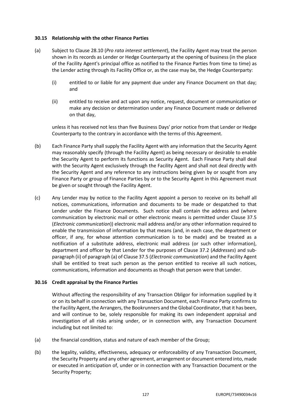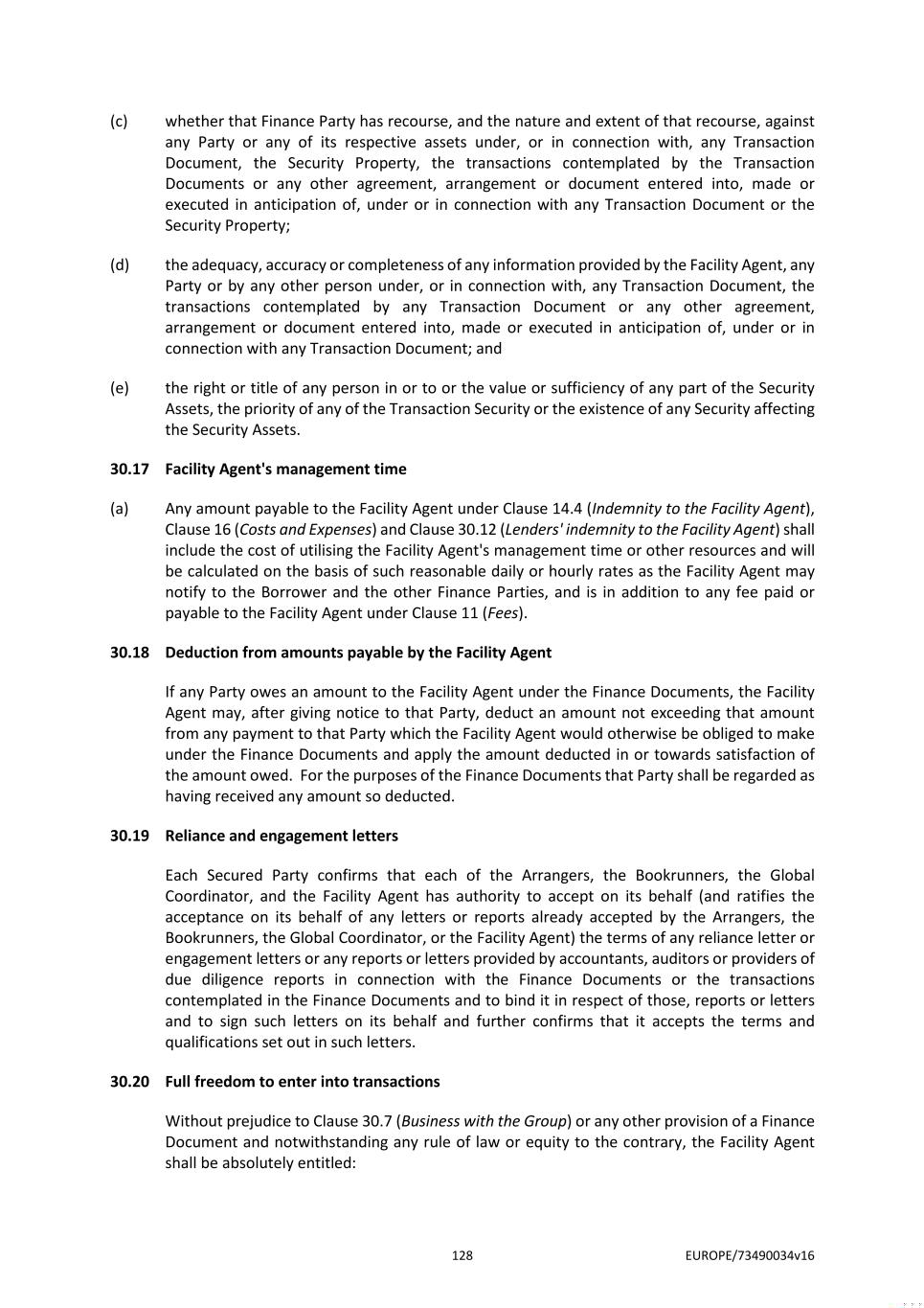 128 EUROPE/73490034v16 (c) whether that Finance Party has recourse, and the nature and extent of that recourse, against any Party or any of its respective assets under, or in connection with, any Transaction Document, the Security Property, the transactions contemplated by the Transaction Documents or any other agreement, arrangement or document entered into, made or executed in anticipation of, under or in connection with any Transaction Document or the Security Property; (d) the adequacy, accuracy or completeness of any information provided by the Facility Agent, any Party or by any other person under, or in connection with, any Transaction Document, the transactions contemplated by any Transaction Document or any other agreement, arrangement or document entered into, made or executed in anticipation of, under or in connection with any Transaction Document; and (e) the right or title of any person in or to or the value or sufficiency of any part of the Security Assets, the priority of any of the Transaction Security or the existence of any Security affecting the Security Assets. 30.17 Facility Agent's management time (a) Any amount payable to the Facility Agent under Clause 14.4 (Indemnity to the Facility Agent), Clause 16 (Costs and Expenses) and Clause 30.12 (Lenders' indemnity to the Facility Agent) shall include the cost of utilising the Facility Agent's management time or other resources and will be calculated on the basis of such reasonable daily or hourly rates as the Facility Agent may notify to the Borrower and the other Finance Parties, and is in addition to any fee paid or payable to the Facility Agent under Clause 11 (Fees). 30.18 Deduction from amounts payable by the Facility Agent If any Party owes an amount to the Facility Agent under the Finance Documents, the Facility Agent may, after giving notice to that Party, deduct an amount not exceeding that amount from any payment to that Party which the Facility Agent would otherwise be obliged to make under the Finance Documents and apply the amount deducted in or towards satisfaction of the amount owed. For the purposes of the Finance Documents that Party shall be regarded as having received any amount so deducted. 30.19 Reliance and engagement letters Each Secured Party confirms that each of the Arrangers, the Bookrunners, the Global Coordinator, and the Facility Agent has authority to accept on its behalf (and ratifies the acceptance on its behalf of any letters or reports already accepted by the Arrangers, the Bookrunners, the Global Coordinator, or the Facility Agent) the terms of any reliance letter or engagement letters or any reports or letters provided by accountants, auditors or providers of due diligence reports in connection with the Finance Documents or the transactions contemplated in the Finance Documents and to bind it in respect of those, reports or letters and to sign such letters on its behalf and further confirms that it accepts the terms and qualifications set out in such letters. 30.20 Full freedom to enter into transactions Without prejudice to Clause 30.7 (Business with the Group) or any other provision of a Finance Document and notwithstanding any rule of law or equity to the contrary, the Facility Agent shall be absolutely entitled: