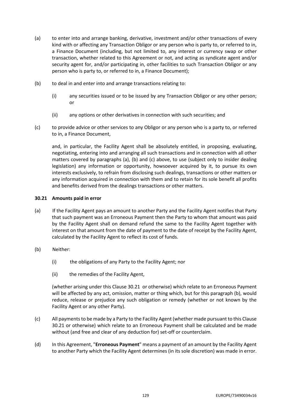 129 EUROPE/73490034v16 (a) to enter into and arrange banking, derivative, investment and/or other transactions of every kind with or affecting any Transaction Obligor or any person who is party to, or referred to in, a Finance Document (including, but not limited to, any interest or currency swap or other transaction, whether related to this Agreement or not, and acting as syndicate agent and/or security agent for, and/or participating in, other facilities to such Transaction Obligor or any person who is party to, or referred to in, a Finance Document); (b) to deal in and enter into and arrange transactions relating to: (i) any securities issued or to be issued by any Transaction Obligor or any other person; or (ii) any options or other derivatives in connection with such securities; and (c) to provide advice or other services to any Obligor or any person who is a party to, or referred to in, a Finance Document, and, in particular, the Facility Agent shall be absolutely entitled, in proposing, evaluating, negotiating, entering into and arranging all such transactions and in connection with all other matters covered by paragraphs (a), (b) and (c) above, to use (subject only to insider dealing legislation) any information or opportunity, howsoever acquired by it, to pursue its own interests exclusively, to refrain from disclosing such dealings, transactions or other matters or any information acquired in connection with them and to retain for its sole benefit all profits and benefits derived from the dealings transactions or other matters. 30.21 Amounts paid in error (a) If the Facility Agent pays an amount to another Party and the Facility Agent notifies that Party that such payment was an Erroneous Payment then the Party to whom that amount was paid by the Facility Agent shall on demand refund the same to the Facility Agent together with interest on that amount from the date of payment to the date of receipt by the Facility Agent, calculated by the Facility Agent to reflect its cost of funds. (b) Neither: (i) the obligations of any Party to the Facility Agent; nor (ii) the remedies of the Facility Agent, (whether arising under this Clause 30.21 or otherwise) which relate to an Erroneous Payment will be affected by any act, omission, matter or thing which, but for this paragraph (b), would reduce, release or prejudice any such obligation or remedy (whether or not known by the Facility Agent or any other Party). (c) All payments to be made by a Party to the Facility Agent (whether made pursuant to this Clause 30.21 or otherwise) which relate to an Erroneous Payment shall be calculated and be made without (and free and clear of any deduction for) set-off or counterclaim. (d) In this Agreement, "Erroneous Payment" means a payment of an amount by the Facility Agent to another Party which the Facility Agent determines (in its sole discretion) was made in error.