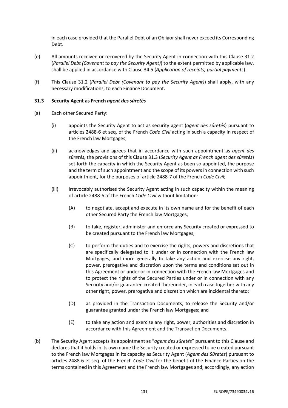 131 EUROPE/73490034v16 in each case provided that the Parallel Debt of an Obligor shall never exceed its Corresponding Debt. (e) All amounts received or recovered by the Security Agent in connection with this Clause 31.2 (Parallel Debt (Covenant to pay the Security Agent)) to the extent permitted by applicable law, shall be applied in accordance with Clause 34.5 (Application of receipts; partial payments). (f) This Clause 31.2 (Parallel Debt (Covenant to pay the Security Agent)) shall apply, with any necessary modifications, to each Finance Document. 31.3 Security Agent as French agent des sûretés (a) Each other Secured Party: (i) appoints the Security Agent to act as security agent (agent des sûretés) pursuant to articles 2488-6 et seq. of the French Code Civil acting in such a capacity in respect of the French law Mortgages; (ii) acknowledges and agrees that in accordance with such appointment as agent des sûretés, the provisions of this Clause 31.3 (Security Agent as French agent des sûretés) set forth the capacity in which the Security Agent as been so appointed, the purpose and the term of such appointment and the scope of its powers in connection with such appointment, for the purposes of article 2488-7 of the French Code Civil; (iii) irrevocably authorises the Security Agent acting in such capacity within the meaning of article 2488-6 of the French Code Civil without limitation: (A) to negotiate, accept and execute in its own name and for the benefit of each other Secured Party the French law Mortgages; (B) to take, register, administer and enforce any Security created or expressed to be created pursuant to the French law Mortgages; (C) to perform the duties and to exercise the rights, powers and discretions that are specifically delegated to it under or in connection with the French law Mortgages, and more generally to take any action and exercise any right, power, prerogative and discretion upon the terms and conditions set out in this Agreement or under or in connection with the French law Mortgages and to protect the rights of the Secured Parties under or in connection with any Security and/or guarantee created thereunder, in each case together with any other right, power, prerogative and discretion which are incidental thereto; (D) as provided in the Transaction Documents, to release the Security and/or guarantee granted under the French law Mortgages; and (E) to take any action and exercise any right, power, authorities and discretion in accordance with this Agreement and the Transaction Documents. (b) The Security Agent accepts its appointment as “agent des sûretés” pursuant to this Clause and declares that it holds in its own name the Security created or expressed to be created pursuant to the French law Mortgages in its capacity as Security Agent (Agent des Sûretés) pursuant to articles 2488-6 et seq. of the French Code Civil for the benefit of the Finance Parties on the terms contained in this Agreement and the French law Mortgages and, accordingly, any action