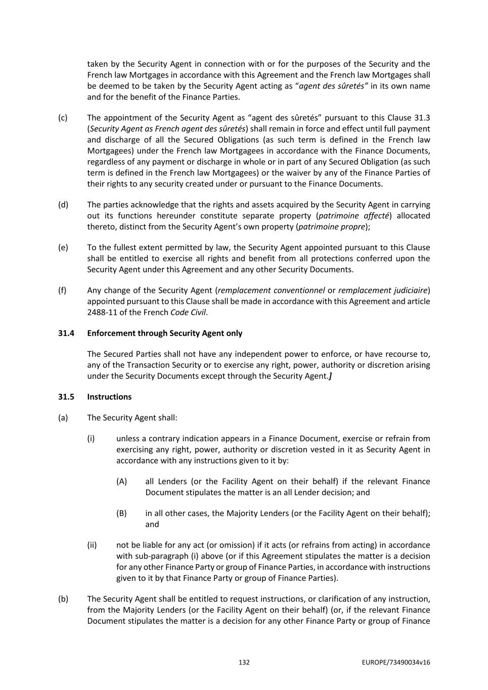 132 EUROPE/73490034v16 taken by the Security Agent in connection with or for the purposes of the Security and the French law Mortgages in accordance with this Agreement and the French law Mortgages shall be deemed to be taken by the Security Agent acting as “agent des sûretés” in its own name and for the benefit of the Finance Parties. (c) The appointment of the Security Agent as “agent des sûretés” pursuant to this Clause 31.3 (Security Agent as French agent des sûretés) shall remain in force and effect until full payment and discharge of all the Secured Obligations (as such term is defined in the French law Mortgagees) under the French law Mortgagees in accordance with the Finance Documents, regardless of any payment or discharge in whole or in part of any Secured Obligation (as such term is defined in the French law Mortgagees) or the waiver by any of the Finance Parties of their rights to any security created under or pursuant to the Finance Documents. (d) The parties acknowledge that the rights and assets acquired by the Security Agent in carrying out its functions hereunder constitute separate property (patrimoine affecté) allocated thereto, distinct from the Security Agent’s own property (patrimoine propre); (e) To the fullest extent permitted by law, the Security Agent appointed pursuant to this Clause shall be entitled to exercise all rights and benefit from all protections conferred upon the Security Agent under this Agreement and any other Security Documents. (f) Any change of the Security Agent (remplacement conventionnel or remplacement judiciaire) appointed pursuant to this Clause shall be made in accordance with this Agreement and article 2488-11 of the French Code Civil. 31.4 Enforcement through Security Agent only The Secured Parties shall not have any independent power to enforce, or have recourse to, any of the Transaction Security or to exercise any right, power, authority or discretion arising under the Security Documents except through the Security Agent.] 31.5 Instructions (a) The Security Agent shall: (i) unless a contrary indication appears in a Finance Document, exercise or refrain from exercising any right, power, authority or discretion vested in it as Security Agent in accordance with any instructions given to it by: (A) all Lenders (or the Facility Agent on their behalf) if the relevant Finance Document stipulates the matter is an all Lender decision; and (B) in all other cases, the Majority Lenders (or the Facility Agent on their behalf); and (ii) not be liable for any act (or omission) if it acts (or refrains from acting) in accordance with sub-paragraph (i) above (or if this Agreement stipulates the matter is a decision for any other Finance Party or group of Finance Parties, in accordance with instructions given to it by that Finance Party or group of Finance Parties). (b) The Security Agent shall be entitled to request instructions, or clarification of any instruction, from the Majority Lenders (or the Facility Agent on their behalf) (or, if the relevant Finance Document stipulates the matter is a decision for any other Finance Party or group of Finance