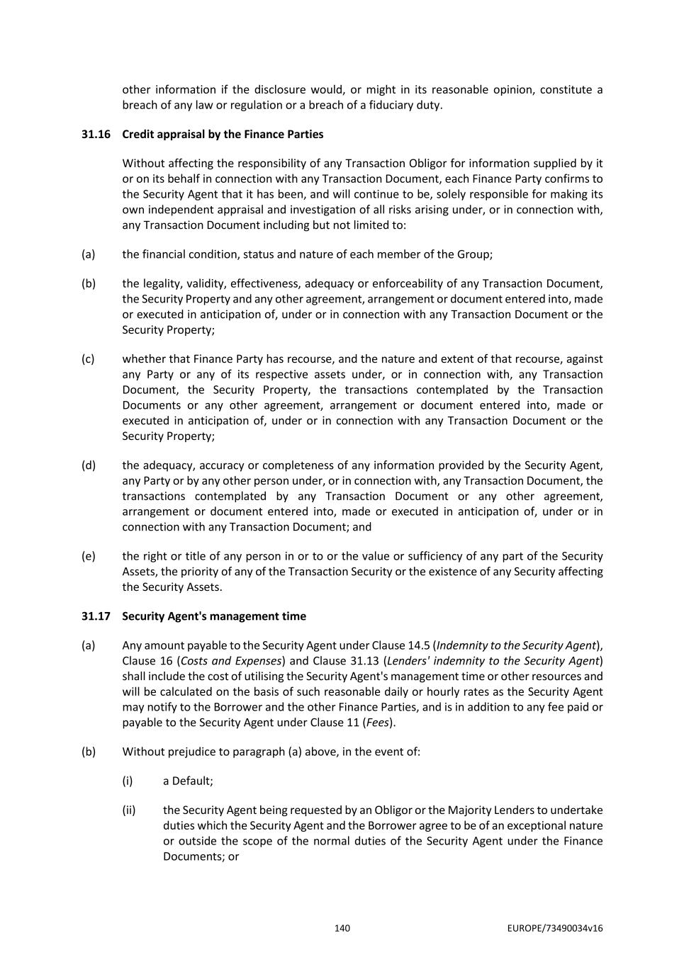 140 EUROPE/73490034v16 other information if the disclosure would, or might in its reasonable opinion, constitute a breach of any law or regulation or a breach of a fiduciary duty. 31.16 Credit appraisal by the Finance Parties Without affecting the responsibility of any Transaction Obligor for information supplied by it or on its behalf in connection with any Transaction Document, each Finance Party confirms to the Security Agent that it has been, and will continue to be, solely responsible for making its own independent appraisal and investigation of all risks arising under, or in connection with, any Transaction Document including but not limited to: (a) the financial condition, status and nature of each member of the Group; (b) the legality, validity, effectiveness, adequacy or enforceability of any Transaction Document, the Security Property and any other agreement, arrangement or document entered into, made or executed in anticipation of, under or in connection with any Transaction Document or the Security Property; (c) whether that Finance Party has recourse, and the nature and extent of that recourse, against any Party or any of its respective assets under, or in connection with, any Transaction Document, the Security Property, the transactions contemplated by the Transaction Documents or any other agreement, arrangement or document entered into, made or executed in anticipation of, under or in connection with any Transaction Document or the Security Property; (d) the adequacy, accuracy or completeness of any information provided by the Security Agent, any Party or by any other person under, or in connection with, any Transaction Document, the transactions contemplated by any Transaction Document or any other agreement, arrangement or document entered into, made or executed in anticipation of, under or in connection with any Transaction Document; and (e) the right or title of any person in or to or the value or sufficiency of any part of the Security Assets, the priority of any of the Transaction Security or the existence of any Security affecting the Security Assets. 31.17 Security Agent's management time (a) Any amount payable to the Security Agent under Clause 14.5 (Indemnity to the Security Agent), Clause 16 (Costs and Expenses) and Clause 31.13 (Lenders' indemnity to the Security Agent) shall include the cost of utilising the Security Agent's management time or other resources and will be calculated on the basis of such reasonable daily or hourly rates as the Security Agent may notify to the Borrower and the other Finance Parties, and is in addition to any fee paid or payable to the Security Agent under Clause 11 (Fees). (b) Without prejudice to paragraph (a) above, in the event of: (i) a Default; (ii) the Security Agent being requested by an Obligor or the Majority Lenders to undertake duties which the Security Agent and the Borrower agree to be of an exceptional nature or outside the scope of the normal duties of the Security Agent under the Finance Documents; or