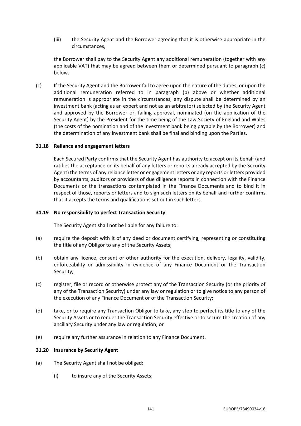 141 EUROPE/73490034v16 (iii) the Security Agent and the Borrower agreeing that it is otherwise appropriate in the circumstances, the Borrower shall pay to the Security Agent any additional remuneration (together with any applicable VAT) that may be agreed between them or determined pursuant to paragraph (c) below. (c) If the Security Agent and the Borrower fail to agree upon the nature of the duties, or upon the additional remuneration referred to in paragraph (b) above or whether additional remuneration is appropriate in the circumstances, any dispute shall be determined by an investment bank (acting as an expert and not as an arbitrator) selected by the Security Agent and approved by the Borrower or, failing approval, nominated (on the application of the Security Agent) by the President for the time being of the Law Society of England and Wales (the costs of the nomination and of the investment bank being payable by the Borrower) and the determination of any investment bank shall be final and binding upon the Parties. 31.18 Reliance and engagement letters Each Secured Party confirms that the Security Agent has authority to accept on its behalf (and ratifies the acceptance on its behalf of any letters or reports already accepted by the Security Agent) the terms of any reliance letter or engagement letters or any reports or letters provided by accountants, auditors or providers of due diligence reports in connection with the Finance Documents or the transactions contemplated in the Finance Documents and to bind it in respect of those, reports or letters and to sign such letters on its behalf and further confirms that it accepts the terms and qualifications set out in such letters. 31.19 No responsibility to perfect Transaction Security The Security Agent shall not be liable for any failure to: (a) require the deposit with it of any deed or document certifying, representing or constituting the title of any Obligor to any of the Security Assets; (b) obtain any licence, consent or other authority for the execution, delivery, legality, validity, enforceability or admissibility in evidence of any Finance Document or the Transaction Security; (c) register, file or record or otherwise protect any of the Transaction Security (or the priority of any of the Transaction Security) under any law or regulation or to give notice to any person of the execution of any Finance Document or of the Transaction Security; (d) take, or to require any Transaction Obligor to take, any step to perfect its title to any of the Security Assets or to render the Transaction Security effective or to secure the creation of any ancillary Security under any law or regulation; or (e) require any further assurance in relation to any Finance Document. 31.20 Insurance by Security Agent (a) The Security Agent shall not be obliged: (i) to insure any of the Security Assets;