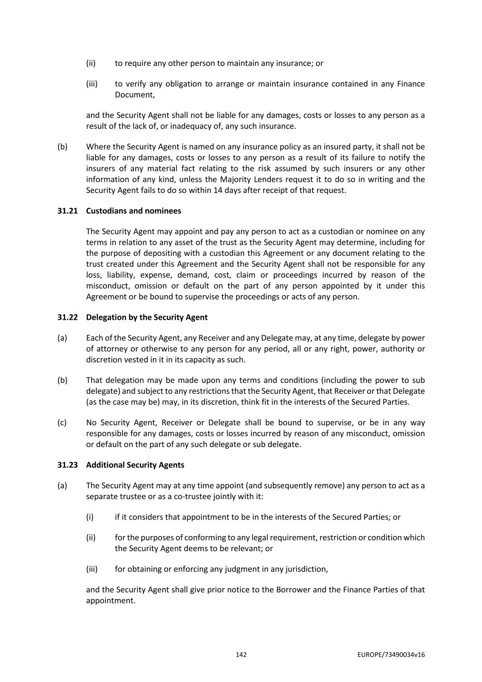 142 EUROPE/73490034v16 (ii) to require any other person to maintain any insurance; or (iii) to verify any obligation to arrange or maintain insurance contained in any Finance Document, and the Security Agent shall not be liable for any damages, costs or losses to any person as a result of the lack of, or inadequacy of, any such insurance. (b) Where the Security Agent is named on any insurance policy as an insured party, it shall not be liable for any damages, costs or losses to any person as a result of its failure to notify the insurers of any material fact relating to the risk assumed by such insurers or any other information of any kind, unless the Majority Lenders request it to do so in writing and the Security Agent fails to do so within 14 days after receipt of that request. 31.21 Custodians and nominees The Security Agent may appoint and pay any person to act as a custodian or nominee on any terms in relation to any asset of the trust as the Security Agent may determine, including for the purpose of depositing with a custodian this Agreement or any document relating to the trust created under this Agreement and the Security Agent shall not be responsible for any loss, liability, expense, demand, cost, claim or proceedings incurred by reason of the misconduct, omission or default on the part of any person appointed by it under this Agreement or be bound to supervise the proceedings or acts of any person. 31.22 Delegation by the Security Agent (a) Each of the Security Agent, any Receiver and any Delegate may, at any time, delegate by power of attorney or otherwise to any person for any period, all or any right, power, authority or discretion vested in it in its capacity as such. (b) That delegation may be made upon any terms and conditions (including the power to sub delegate) and subject to any restrictions that the Security Agent, that Receiver or that Delegate (as the case may be) may, in its discretion, think fit in the interests of the Secured Parties. (c) No Security Agent, Receiver or Delegate shall be bound to supervise, or be in any way responsible for any damages, costs or losses incurred by reason of any misconduct, omission or default on the part of any such delegate or sub delegate. 31.23 Additional Security Agents (a) The Security Agent may at any time appoint (and subsequently remove) any person to act as a separate trustee or as a co-trustee jointly with it: (i) if it considers that appointment to be in the interests of the Secured Parties; or (ii) for the purposes of conforming to any legal requirement, restriction or condition which the Security Agent deems to be relevant; or (iii) for obtaining or enforcing any judgment in any jurisdiction, and the Security Agent shall give prior notice to the Borrower and the Finance Parties of that appointment.