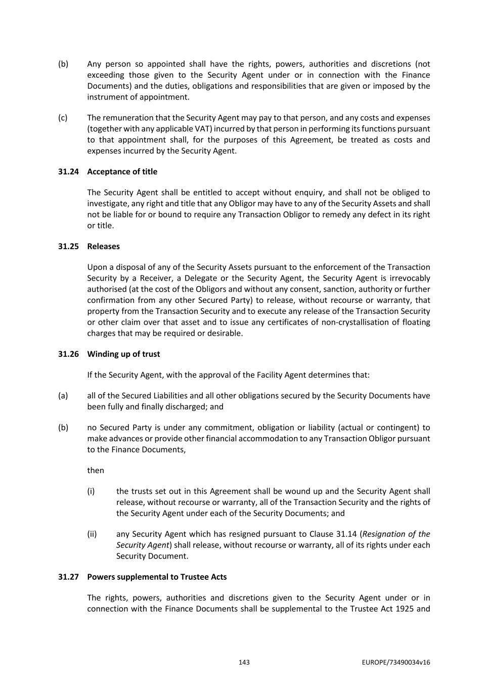 143 EUROPE/73490034v16 (b) Any person so appointed shall have the rights, powers, authorities and discretions (not exceeding those given to the Security Agent under or in connection with the Finance Documents) and the duties, obligations and responsibilities that are given or imposed by the instrument of appointment. (c) The remuneration that the Security Agent may pay to that person, and any costs and expenses (together with any applicable VAT) incurred by that person in performing its functions pursuant to that appointment shall, for the purposes of this Agreement, be treated as costs and expenses incurred by the Security Agent. 31.24 Acceptance of title The Security Agent shall be entitled to accept without enquiry, and shall not be obliged to investigate, any right and title that any Obligor may have to any of the Security Assets and shall not be liable for or bound to require any Transaction Obligor to remedy any defect in its right or title. 31.25 Releases Upon a disposal of any of the Security Assets pursuant to the enforcement of the Transaction Security by a Receiver, a Delegate or the Security Agent, the Security Agent is irrevocably authorised (at the cost of the Obligors and without any consent, sanction, authority or further confirmation from any other Secured Party) to release, without recourse or warranty, that property from the Transaction Security and to execute any release of the Transaction Security or other claim over that asset and to issue any certificates of non-crystallisation of floating charges that may be required or desirable. 31.26 Winding up of trust If the Security Agent, with the approval of the Facility Agent determines that: (a) all of the Secured Liabilities and all other obligations secured by the Security Documents have been fully and finally discharged; and (b) no Secured Party is under any commitment, obligation or liability (actual or contingent) to make advances or provide other financial accommodation to any Transaction Obligor pursuant to the Finance Documents, then (i) the trusts set out in this Agreement shall be wound up and the Security Agent shall release, without recourse or warranty, all of the Transaction Security and the rights of the Security Agent under each of the Security Documents; and (ii) any Security Agent which has resigned pursuant to Clause 31.14 (Resignation of the Security Agent) shall release, without recourse or warranty, all of its rights under each Security Document. 31.27 Powers supplemental to Trustee Acts The rights, powers, authorities and discretions given to the Security Agent under or in connection with the Finance Documents shall be supplemental to the Trustee Act 1925 and