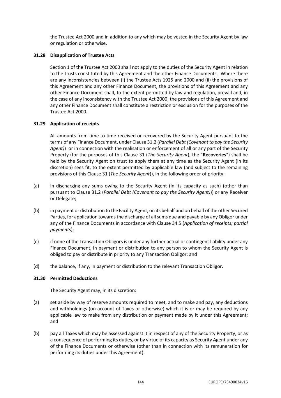 144 EUROPE/73490034v16 the Trustee Act 2000 and in addition to any which may be vested in the Security Agent by law or regulation or otherwise. 31.28 Disapplication of Trustee Acts Section 1 of the Trustee Act 2000 shall not apply to the duties of the Security Agent in relation to the trusts constituted by this Agreement and the other Finance Documents. Where there are any inconsistencies between (i) the Trustee Acts 1925 and 2000 and (ii) the provisions of this Agreement and any other Finance Document, the provisions of this Agreement and any other Finance Document shall, to the extent permitted by law and regulation, prevail and, in the case of any inconsistency with the Trustee Act 2000, the provisions of this Agreement and any other Finance Document shall constitute a restriction or exclusion for the purposes of the Trustee Act 2000. 31.29 Application of receipts All amounts from time to time received or recovered by the Security Agent pursuant to the terms of any Finance Document, under Clause 31.2 (Parallel Debt (Covenant to pay the Security Agent)) or in connection with the realisation or enforcement of all or any part of the Security Property (for the purposes of this Clause 31 (The Security Agent), the "Recoveries") shall be held by the Security Agent on trust to apply them at any time as the Security Agent (in its discretion) sees fit, to the extent permitted by applicable law (and subject to the remaining provisions of this Clause 31 (The Security Agent)), in the following order of priority: (a) in discharging any sums owing to the Security Agent (in its capacity as such) (other than pursuant to Clause 31.2 (Parallel Debt (Covenant to pay the Security Agent))) or any Receiver or Delegate; (b) in payment or distribution to the Facility Agent, on its behalf and on behalf of the other Secured Parties, for application towards the discharge of all sums due and payable by any Obligor under any of the Finance Documents in accordance with Clause 34.5 (Application of receipts; partial payments); (c) if none of the Transaction Obligors is under any further actual or contingent liability under any Finance Document, in payment or distribution to any person to whom the Security Agent is obliged to pay or distribute in priority to any Transaction Obligor; and (d) the balance, if any, in payment or distribution to the relevant Transaction Obligor. 31.30 Permitted Deductions The Security Agent may, in its discretion: (a) set aside by way of reserve amounts required to meet, and to make and pay, any deductions and withholdings (on account of Taxes or otherwise) which it is or may be required by any applicable law to make from any distribution or payment made by it under this Agreement; and (b) pay all Taxes which may be assessed against it in respect of any of the Security Property, or as a consequence of performing its duties, or by virtue of its capacity as Security Agent under any of the Finance Documents or otherwise (other than in connection with its remuneration for performing its duties under this Agreement).