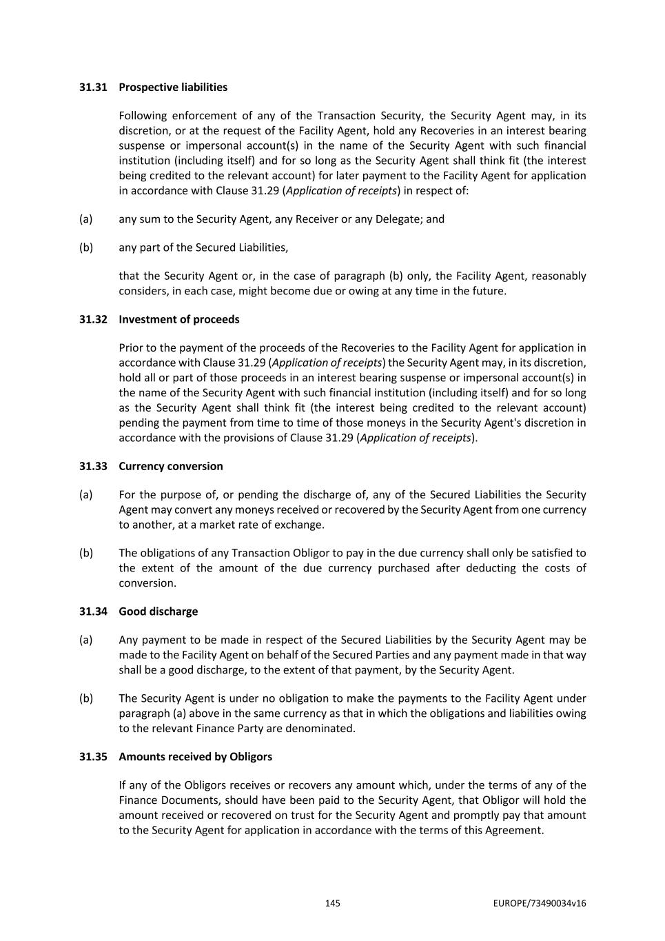 145 EUROPE/73490034v16 31.31 Prospective liabilities Following enforcement of any of the Transaction Security, the Security Agent may, in its discretion, or at the request of the Facility Agent, hold any Recoveries in an interest bearing suspense or impersonal account(s) in the name of the Security Agent with such financial institution (including itself) and for so long as the Security Agent shall think fit (the interest being credited to the relevant account) for later payment to the Facility Agent for application in accordance with Clause 31.29 (Application of receipts) in respect of: (a) any sum to the Security Agent, any Receiver or any Delegate; and (b) any part of the Secured Liabilities, that the Security Agent or, in the case of paragraph (b) only, the Facility Agent, reasonably considers, in each case, might become due or owing at any time in the future. 31.32 Investment of proceeds Prior to the payment of the proceeds of the Recoveries to the Facility Agent for application in accordance with Clause 31.29 (Application of receipts) the Security Agent may, in its discretion, hold all or part of those proceeds in an interest bearing suspense or impersonal account(s) in the name of the Security Agent with such financial institution (including itself) and for so long as the Security Agent shall think fit (the interest being credited to the relevant account) pending the payment from time to time of those moneys in the Security Agent's discretion in accordance with the provisions of Clause 31.29 (Application of receipts). 31.33 Currency conversion (a) For the purpose of, or pending the discharge of, any of the Secured Liabilities the Security Agent may convert any moneys received or recovered by the Security Agent from one currency to another, at a market rate of exchange. (b) The obligations of any Transaction Obligor to pay in the due currency shall only be satisfied to the extent of the amount of the due currency purchased after deducting the costs of conversion. 31.34 Good discharge (a) Any payment to be made in respect of the Secured Liabilities by the Security Agent may be made to the Facility Agent on behalf of the Secured Parties and any payment made in that way shall be a good discharge, to the extent of that payment, by the Security Agent. (b) The Security Agent is under no obligation to make the payments to the Facility Agent under paragraph (a) above in the same currency as that in which the obligations and liabilities owing to the relevant Finance Party are denominated. 31.35 Amounts received by Obligors If any of the Obligors receives or recovers any amount which, under the terms of any of the Finance Documents, should have been paid to the Security Agent, that Obligor will hold the amount received or recovered on trust for the Security Agent and promptly pay that amount to the Security Agent for application in accordance with the terms of this Agreement.