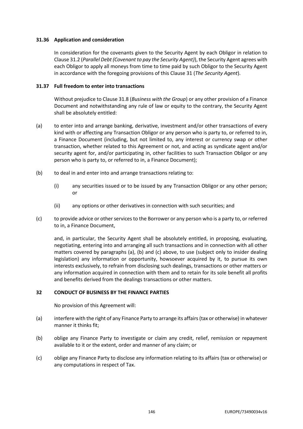 146 EUROPE/73490034v16 31.36 Application and consideration In consideration for the covenants given to the Security Agent by each Obligor in relation to Clause 31.2 (Parallel Debt (Covenant to pay the Security Agent)), the Security Agent agrees with each Obligor to apply all moneys from time to time paid by such Obligor to the Security Agent in accordance with the foregoing provisions of this Clause 31 (The Security Agent). 31.37 Full freedom to enter into transactions Without prejudice to Clause 31.8 (Business with the Group) or any other provision of a Finance Document and notwithstanding any rule of law or equity to the contrary, the Security Agent shall be absolutely entitled: (a) to enter into and arrange banking, derivative, investment and/or other transactions of every kind with or affecting any Transaction Obligor or any person who is party to, or referred to in, a Finance Document (including, but not limited to, any interest or currency swap or other transaction, whether related to this Agreement or not, and acting as syndicate agent and/or security agent for, and/or participating in, other facilities to such Transaction Obligor or any person who is party to, or referred to in, a Finance Document); (b) to deal in and enter into and arrange transactions relating to: (i) any securities issued or to be issued by any Transaction Obligor or any other person; or (ii) any options or other derivatives in connection with such securities; and (c) to provide advice or other services to the Borrower or any person who is a party to, or referred to in, a Finance Document, and, in particular, the Security Agent shall be absolutely entitled, in proposing, evaluating, negotiating, entering into and arranging all such transactions and in connection with all other matters covered by paragraphs (a), (b) and (c) above, to use (subject only to insider dealing legislation) any information or opportunity, howsoever acquired by it, to pursue its own interests exclusively, to refrain from disclosing such dealings, transactions or other matters or any information acquired in connection with them and to retain for its sole benefit all profits and benefits derived from the dealings transactions or other matters. 32 CONDUCT OF BUSINESS BY THE FINANCE PARTIES No provision of this Agreement will: (a) interfere with the right of any Finance Party to arrange its affairs (tax or otherwise) in whatever manner it thinks fit; (b) oblige any Finance Party to investigate or claim any credit, relief, remission or repayment available to it or the extent, order and manner of any claim; or (c) oblige any Finance Party to disclose any information relating to its affairs (tax or otherwise) or any computations in respect of Tax.