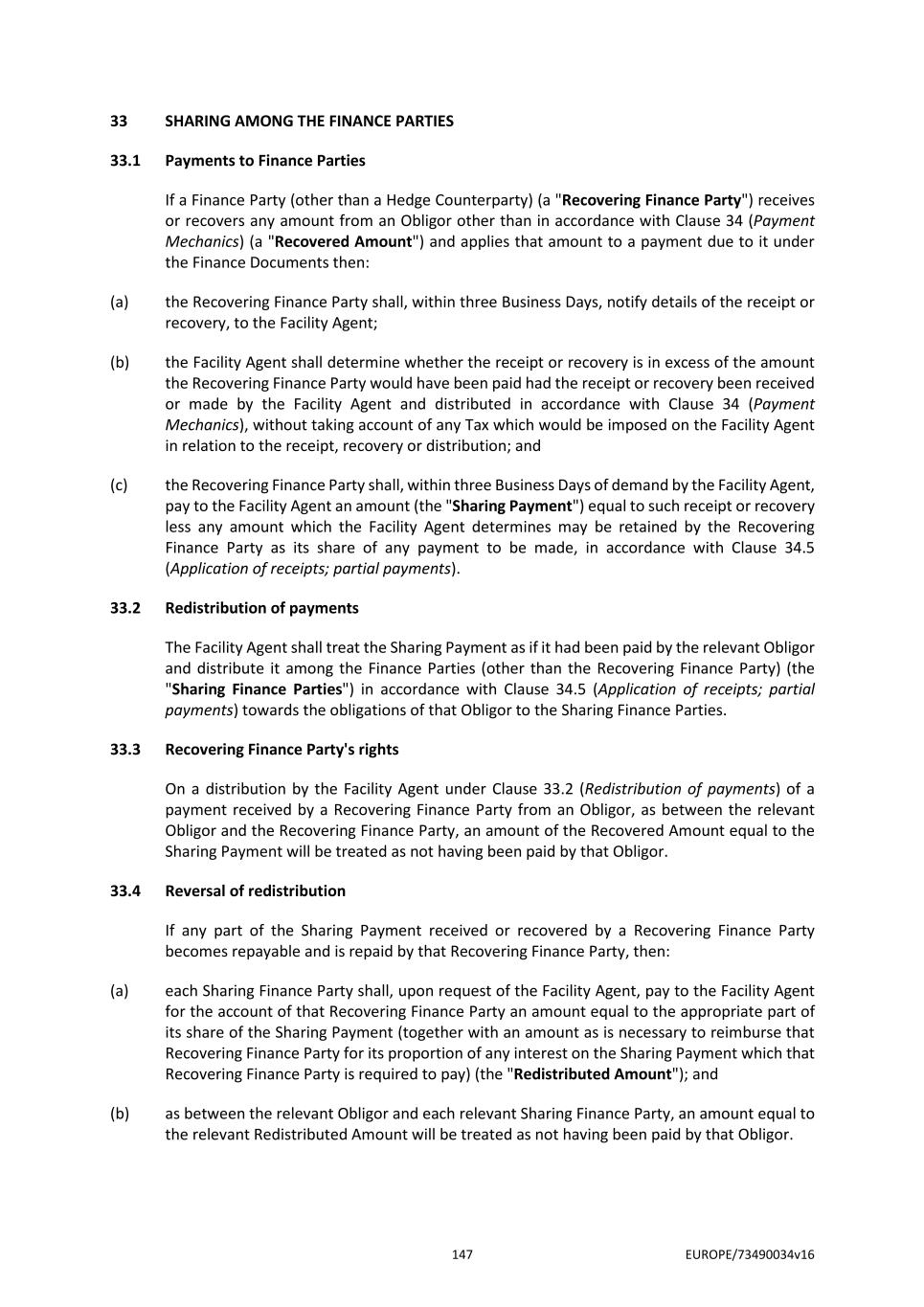 147 EUROPE/73490034v16 33 SHARING AMONG THE FINANCE PARTIES 33.1 Payments to Finance Parties If a Finance Party (other than a Hedge Counterparty) (a "Recovering Finance Party") receives or recovers any amount from an Obligor other than in accordance with Clause 34 (Payment Mechanics) (a "Recovered Amount") and applies that amount to a payment due to it under the Finance Documents then: (a) the Recovering Finance Party shall, within three Business Days, notify details of the receipt or recovery, to the Facility Agent; (b) the Facility Agent shall determine whether the receipt or recovery is in excess of the amount the Recovering Finance Party would have been paid had the receipt or recovery been received or made by the Facility Agent and distributed in accordance with Clause 34 (Payment Mechanics), without taking account of any Tax which would be imposed on the Facility Agent in relation to the receipt, recovery or distribution; and (c) the Recovering Finance Party shall, within three Business Days of demand by the Facility Agent, pay to the Facility Agent an amount (the "Sharing Payment") equal to such receipt or recovery less any amount which the Facility Agent determines may be retained by the Recovering Finance Party as its share of any payment to be made, in accordance with Clause 34.5 (Application of receipts; partial payments). 33.2 Redistribution of payments The Facility Agent shall treat the Sharing Payment as if it had been paid by the relevant Obligor and distribute it among the Finance Parties (other than the Recovering Finance Party) (the "Sharing Finance Parties") in accordance with Clause 34.5 (Application of receipts; partial payments) towards the obligations of that Obligor to the Sharing Finance Parties. 33.3 Recovering Finance Party's rights On a distribution by the Facility Agent under Clause 33.2 (Redistribution of payments) of a payment received by a Recovering Finance Party from an Obligor, as between the relevant Obligor and the Recovering Finance Party, an amount of the Recovered Amount equal to the Sharing Payment will be treated as not having been paid by that Obligor. 33.4 Reversal of redistribution If any part of the Sharing Payment received or recovered by a Recovering Finance Party becomes repayable and is repaid by that Recovering Finance Party, then: (a) each Sharing Finance Party shall, upon request of the Facility Agent, pay to the Facility Agent for the account of that Recovering Finance Party an amount equal to the appropriate part of its share of the Sharing Payment (together with an amount as is necessary to reimburse that Recovering Finance Party for its proportion of any interest on the Sharing Payment which that Recovering Finance Party is required to pay) (the "Redistributed Amount"); and (b) as between the relevant Obligor and each relevant Sharing Finance Party, an amount equal to the relevant Redistributed Amount will be treated as not having been paid by that Obligor.