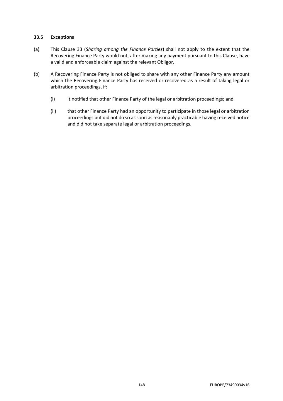 148 EUROPE/73490034v16 33.5 Exceptions (a) This Clause 33 (Sharing among the Finance Parties) shall not apply to the extent that the Recovering Finance Party would not, after making any payment pursuant to this Clause, have a valid and enforceable claim against the relevant Obligor. (b) A Recovering Finance Party is not obliged to share with any other Finance Party any amount which the Recovering Finance Party has received or recovered as a result of taking legal or arbitration proceedings, if: (i) it notified that other Finance Party of the legal or arbitration proceedings; and (ii) that other Finance Party had an opportunity to participate in those legal or arbitration proceedings but did not do so as soon as reasonably practicable having received notice and did not take separate legal or arbitration proceedings.