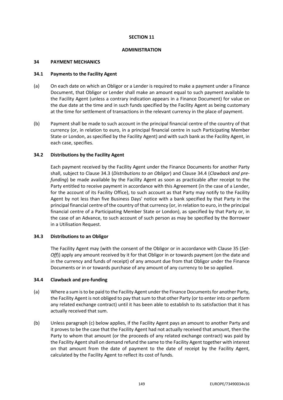 149 EUROPE/73490034v16 SECTION 11 ADMINISTRATION 34 PAYMENT MECHANICS 34.1 Payments to the Facility Agent (a) On each date on which an Obligor or a Lender is required to make a payment under a Finance Document, that Obligor or Lender shall make an amount equal to such payment available to the Facility Agent (unless a contrary indication appears in a Finance Document) for value on the due date at the time and in such funds specified by the Facility Agent as being customary at the time for settlement of transactions in the relevant currency in the place of payment. (b) Payment shall be made to such account in the principal financial centre of the country of that currency (or, in relation to euro, in a principal financial centre in such Participating Member State or London, as specified by the Facility Agent) and with such bank as the Facility Agent, in each case, specifies. 34.2 Distributions by the Facility Agent Each payment received by the Facility Agent under the Finance Documents for another Party shall, subject to Clause 34.3 (Distributions to an Obligor) and Clause 34.4 (Clawback and pre- funding) be made available by the Facility Agent as soon as practicable after receipt to the Party entitled to receive payment in accordance with this Agreement (in the case of a Lender, for the account of its Facility Office), to such account as that Party may notify to the Facility Agent by not less than five Business Days' notice with a bank specified by that Party in the principal financial centre of the country of that currency (or, in relation to euro, in the principal financial centre of a Participating Member State or London), as specified by that Party or, in the case of an Advance, to such account of such person as may be specified by the Borrower in a Utilisation Request. 34.3 Distributions to an Obligor The Facility Agent may (with the consent of the Obligor or in accordance with Clause 35 (Set- Off)) apply any amount received by it for that Obligor in or towards payment (on the date and in the currency and funds of receipt) of any amount due from that Obligor under the Finance Documents or in or towards purchase of any amount of any currency to be so applied. 34.4 Clawback and pre-funding (a) Where a sum is to be paid to the Facility Agent under the Finance Documents for another Party, the Facility Agent is not obliged to pay that sum to that other Party (or to enter into or perform any related exchange contract) until it has been able to establish to its satisfaction that it has actually received that sum. (b) Unless paragraph (c) below applies, if the Facility Agent pays an amount to another Party and it proves to be the case that the Facility Agent had not actually received that amount, then the Party to whom that amount (or the proceeds of any related exchange contract) was paid by the Facility Agent shall on demand refund the same to the Facility Agent together with interest on that amount from the date of payment to the date of receipt by the Facility Agent, calculated by the Facility Agent to reflect its cost of funds.