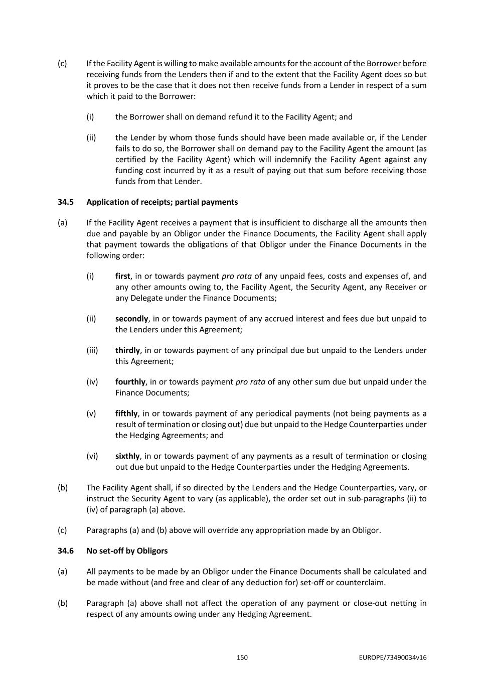 150 EUROPE/73490034v16 (c) If the Facility Agent is willing to make available amounts for the account of the Borrower before receiving funds from the Lenders then if and to the extent that the Facility Agent does so but it proves to be the case that it does not then receive funds from a Lender in respect of a sum which it paid to the Borrower: (i) the Borrower shall on demand refund it to the Facility Agent; and (ii) the Lender by whom those funds should have been made available or, if the Lender fails to do so, the Borrower shall on demand pay to the Facility Agent the amount (as certified by the Facility Agent) which will indemnify the Facility Agent against any funding cost incurred by it as a result of paying out that sum before receiving those funds from that Lender. 34.5 Application of receipts; partial payments (a) If the Facility Agent receives a payment that is insufficient to discharge all the amounts then due and payable by an Obligor under the Finance Documents, the Facility Agent shall apply that payment towards the obligations of that Obligor under the Finance Documents in the following order: (i) first, in or towards payment pro rata of any unpaid fees, costs and expenses of, and any other amounts owing to, the Facility Agent, the Security Agent, any Receiver or any Delegate under the Finance Documents; (ii) secondly, in or towards payment of any accrued interest and fees due but unpaid to the Lenders under this Agreement; (iii) thirdly, in or towards payment of any principal due but unpaid to the Lenders under this Agreement; (iv) fourthly, in or towards payment pro rata of any other sum due but unpaid under the Finance Documents; (v) fifthly, in or towards payment of any periodical payments (not being payments as a result of termination or closing out) due but unpaid to the Hedge Counterparties under the Hedging Agreements; and (vi) sixthly, in or towards payment of any payments as a result of termination or closing out due but unpaid to the Hedge Counterparties under the Hedging Agreements. (b) The Facility Agent shall, if so directed by the Lenders and the Hedge Counterparties, vary, or instruct the Security Agent to vary (as applicable), the order set out in sub-paragraphs (ii) to (iv) of paragraph (a) above. (c) Paragraphs (a) and (b) above will override any appropriation made by an Obligor. 34.6 No set-off by Obligors (a) All payments to be made by an Obligor under the Finance Documents shall be calculated and be made without (and free and clear of any deduction for) set-off or counterclaim. (b) Paragraph (a) above shall not affect the operation of any payment or close-out netting in respect of any amounts owing under any Hedging Agreement.