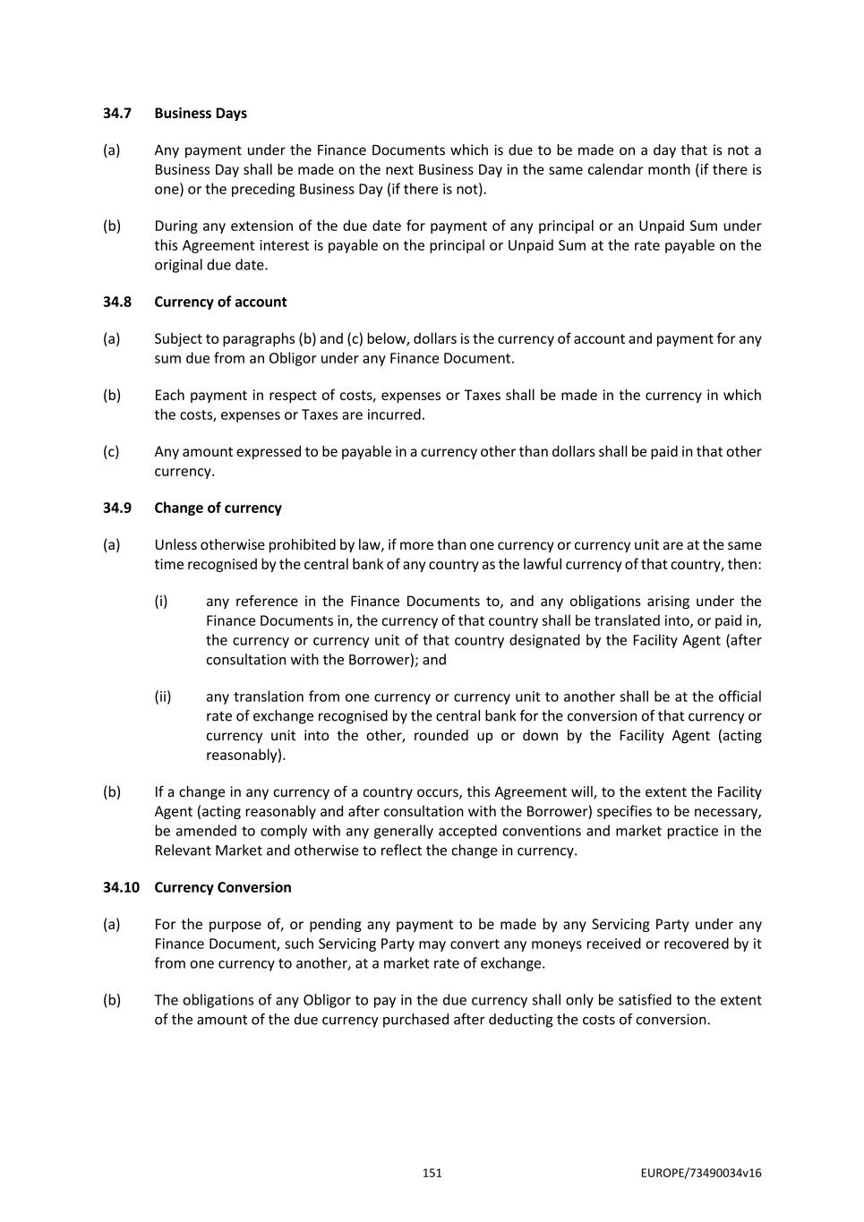 151 EUROPE/73490034v16 34.7 Business Days (a) Any payment under the Finance Documents which is due to be made on a day that is not a Business Day shall be made on the next Business Day in the same calendar month (if there is one) or the preceding Business Day (if there is not). (b) During any extension of the due date for payment of any principal or an Unpaid Sum under this Agreement interest is payable on the principal or Unpaid Sum at the rate payable on the original due date. 34.8 Currency of account (a) Subject to paragraphs (b) and (c) below, dollars is the currency of account and payment for any sum due from an Obligor under any Finance Document. (b) Each payment in respect of costs, expenses or Taxes shall be made in the currency in which the costs, expenses or Taxes are incurred. (c) Any amount expressed to be payable in a currency other than dollars shall be paid in that other currency. 34.9 Change of currency (a) Unless otherwise prohibited by law, if more than one currency or currency unit are at the same time recognised by the central bank of any country as the lawful currency of that country, then: (i) any reference in the Finance Documents to, and any obligations arising under the Finance Documents in, the currency of that country shall be translated into, or paid in, the currency or currency unit of that country designated by the Facility Agent (after consultation with the Borrower); and (ii) any translation from one currency or currency unit to another shall be at the official rate of exchange recognised by the central bank for the conversion of that currency or currency unit into the other, rounded up or down by the Facility Agent (acting reasonably). (b) If a change in any currency of a country occurs, this Agreement will, to the extent the Facility Agent (acting reasonably and after consultation with the Borrower) specifies to be necessary, be amended to comply with any generally accepted conventions and market practice in the Relevant Market and otherwise to reflect the change in currency. 34.10 Currency Conversion (a) For the purpose of, or pending any payment to be made by any Servicing Party under any Finance Document, such Servicing Party may convert any moneys received or recovered by it from one currency to another, at a market rate of exchange. (b) The obligations of any Obligor to pay in the due currency shall only be satisfied to the extent of the amount of the due currency purchased after deducting the costs of conversion.