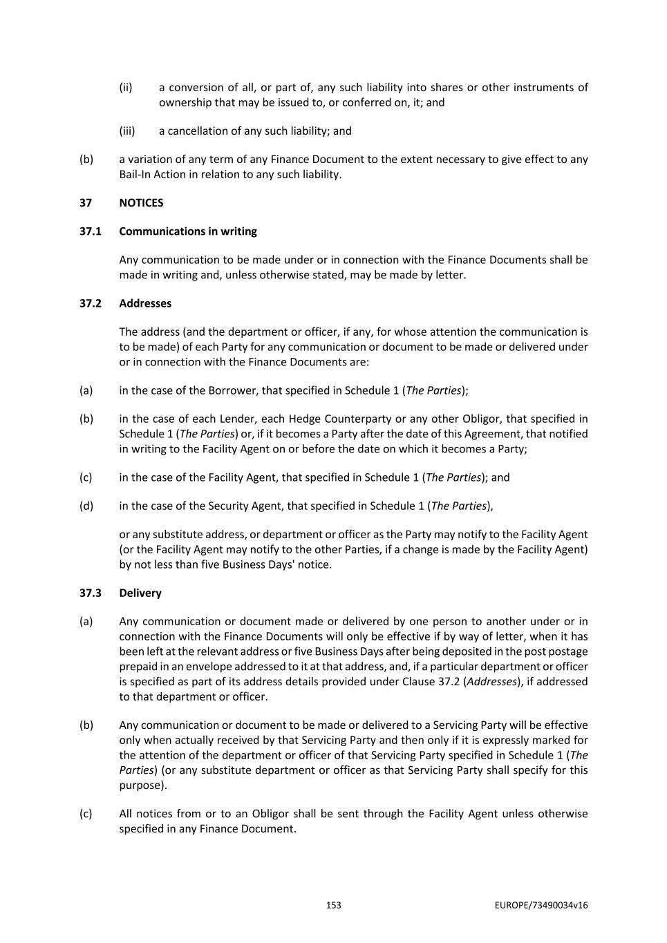 153 EUROPE/73490034v16 (ii) a conversion of all, or part of, any such liability into shares or other instruments of ownership that may be issued to, or conferred on, it; and (iii) a cancellation of any such liability; and (b) a variation of any term of any Finance Document to the extent necessary to give effect to any Bail-In Action in relation to any such liability. 37 NOTICES 37.1 Communications in writing Any communication to be made under or in connection with the Finance Documents shall be made in writing and, unless otherwise stated, may be made by letter. 37.2 Addresses The address (and the department or officer, if any, for whose attention the communication is to be made) of each Party for any communication or document to be made or delivered under or in connection with the Finance Documents are: (a) in the case of the Borrower, that specified in Schedule 1 (The Parties); (b) in the case of each Lender, each Hedge Counterparty or any other Obligor, that specified in Schedule 1 (The Parties) or, if it becomes a Party after the date of this Agreement, that notified in writing to the Facility Agent on or before the date on which it becomes a Party; (c) in the case of the Facility Agent, that specified in Schedule 1 (The Parties); and (d) in the case of the Security Agent, that specified in Schedule 1 (The Parties), or any substitute address, or department or officer as the Party may notify to the Facility Agent (or the Facility Agent may notify to the other Parties, if a change is made by the Facility Agent) by not less than five Business Days' notice. 37.3 Delivery (a) Any communication or document made or delivered by one person to another under or in connection with the Finance Documents will only be effective if by way of letter, when it has been left at the relevant address or five Business Days after being deposited in the post postage prepaid in an envelope addressed to it at that address, and, if a particular department or officer is specified as part of its address details provided under Clause 37.2 (Addresses), if addressed to that department or officer. (b) Any communication or document to be made or delivered to a Servicing Party will be effective only when actually received by that Servicing Party and then only if it is expressly marked for the attention of the department or officer of that Servicing Party specified in Schedule 1 (The Parties) (or any substitute department or officer as that Servicing Party shall specify for this purpose). (c) All notices from or to an Obligor shall be sent through the Facility Agent unless otherwise specified in any Finance Document.